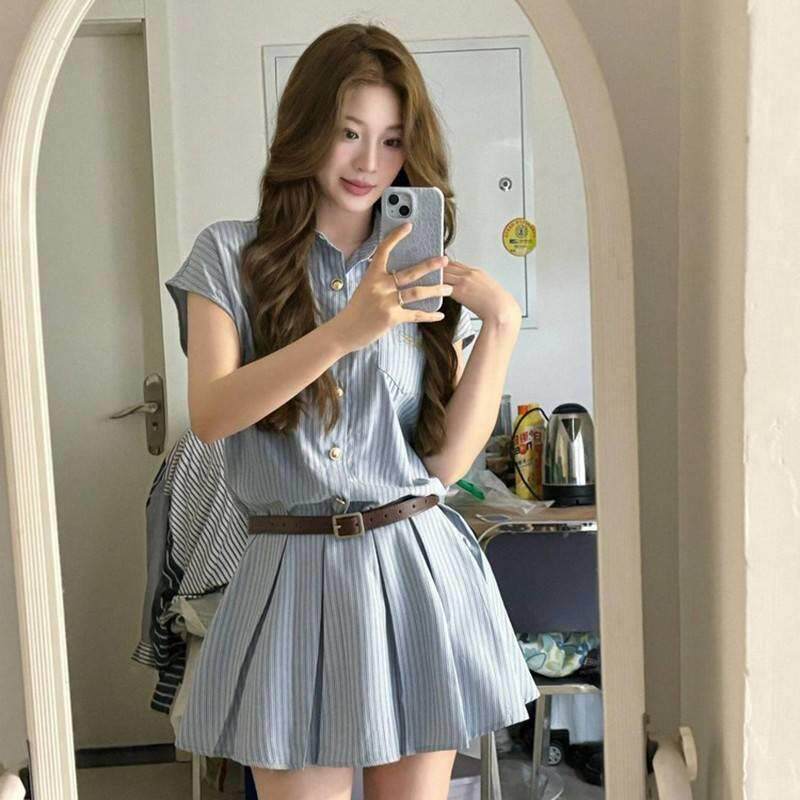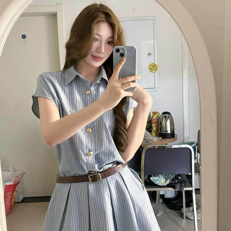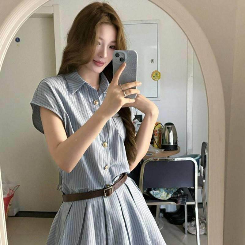 2565学院风色裙条纹衬衫连衣裙子收腰显瘦蓝气质设计感小众女百褶
