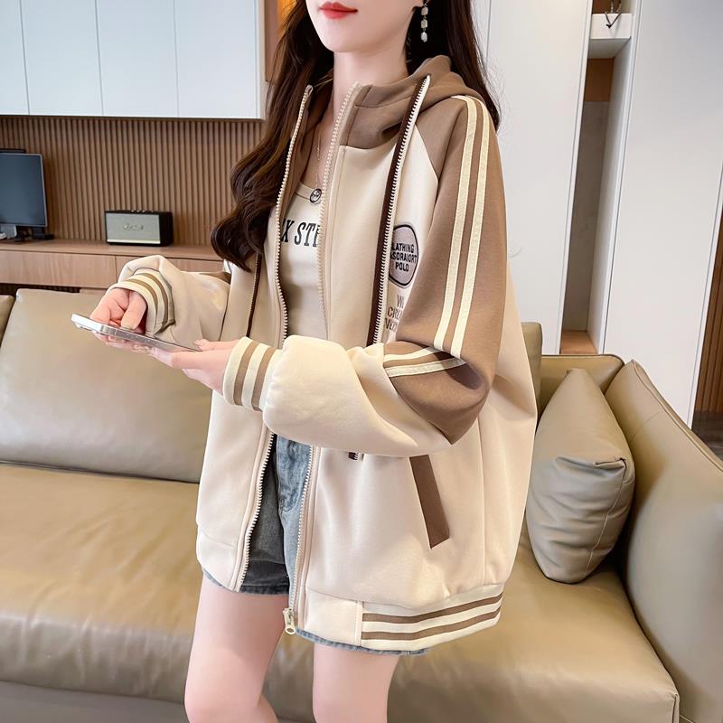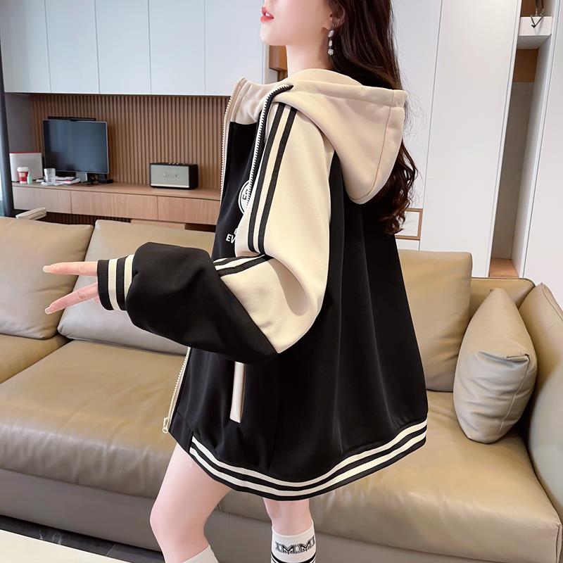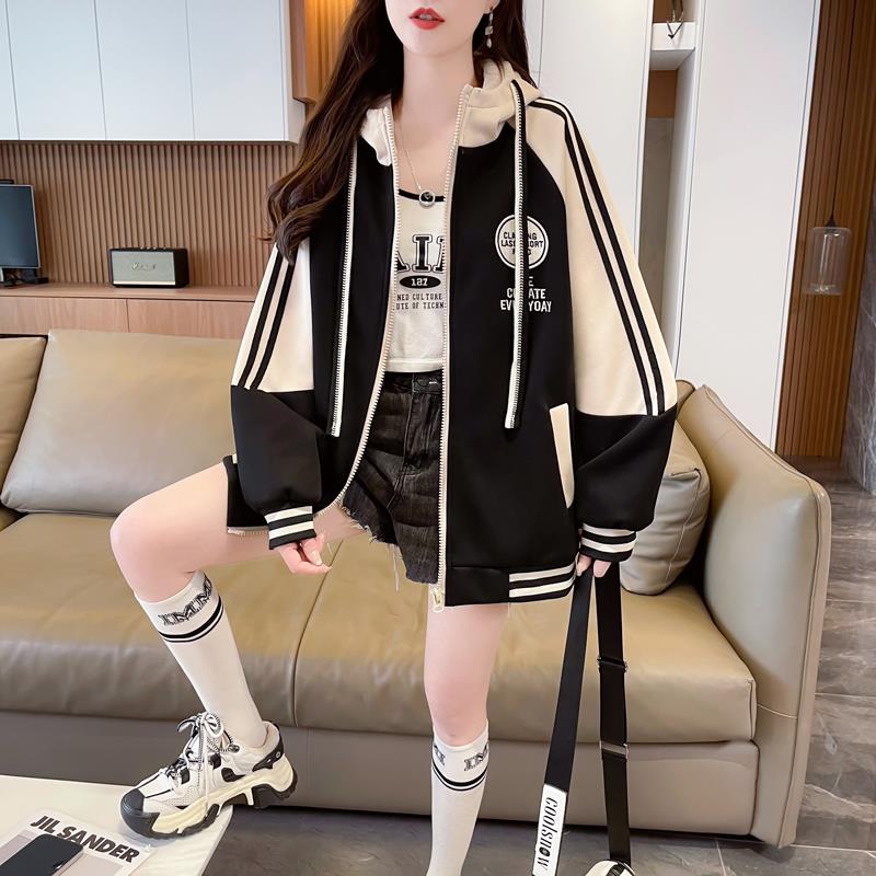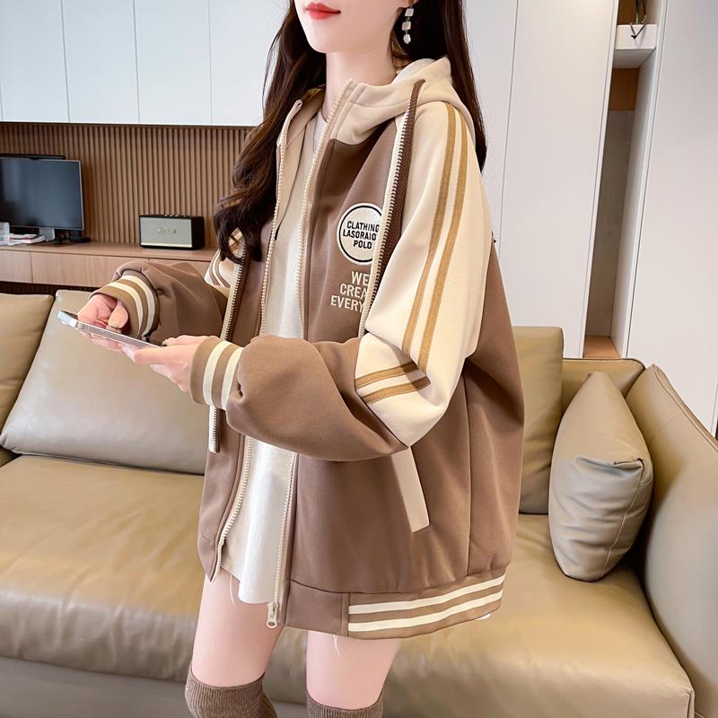 美式复古棒球服开衫女秋冬季初高中学生宽松休闲大码连帽卫衣外套