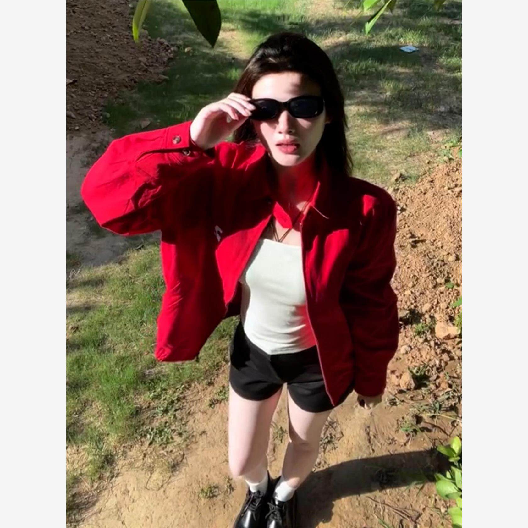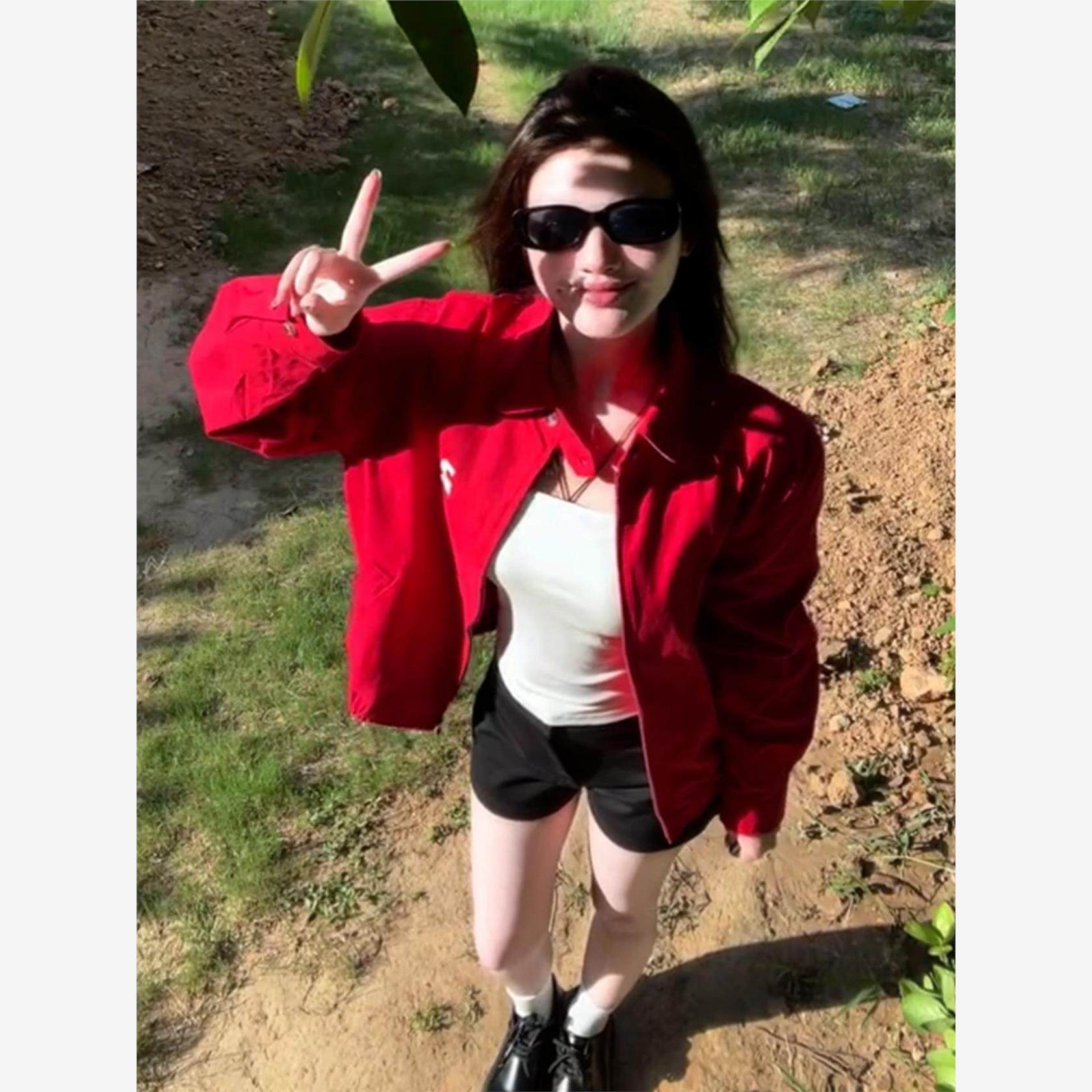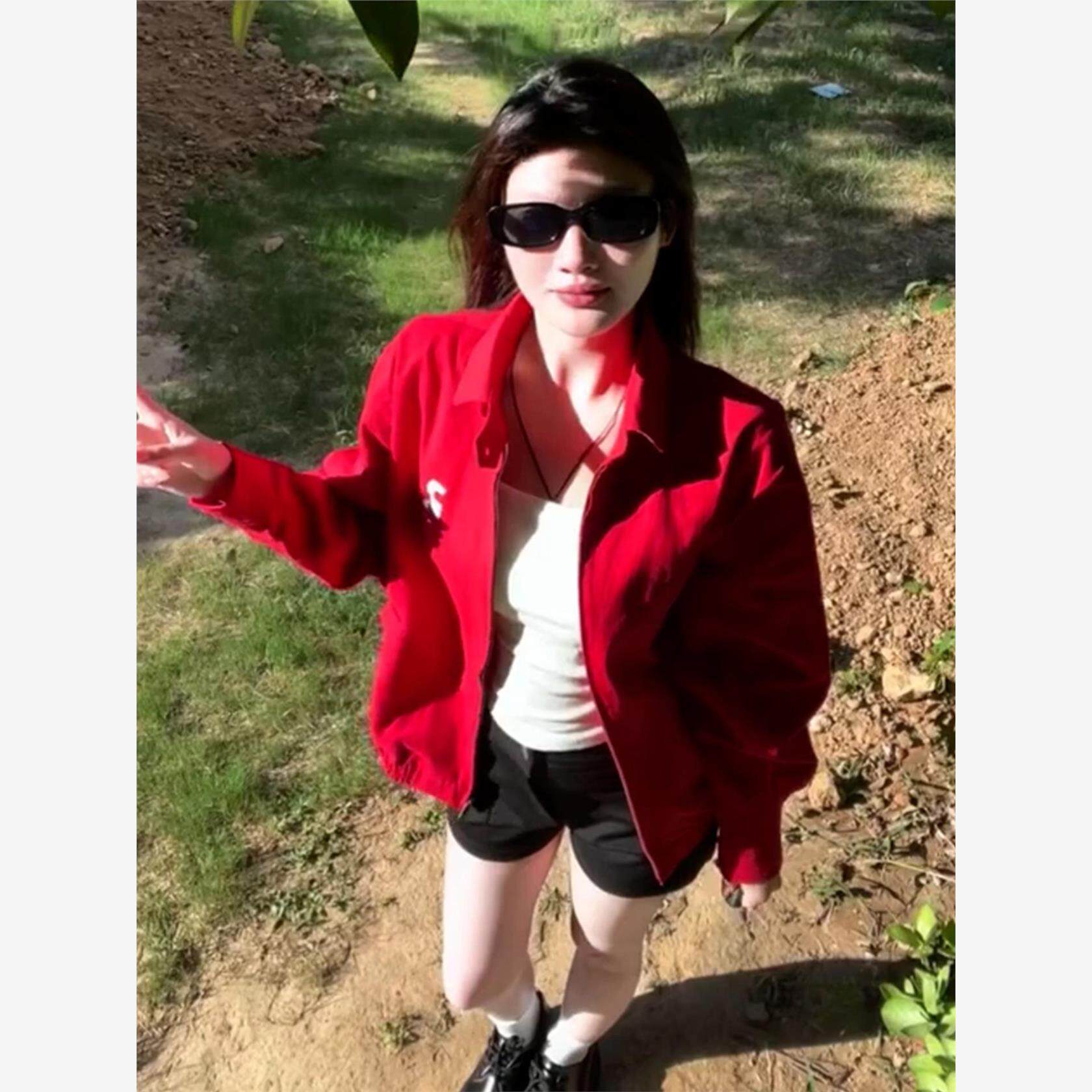 美式覆古红色棒球服外套女春秋2025新款巨好看早秋季开衫夹克上衣