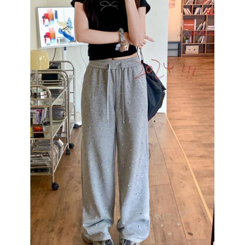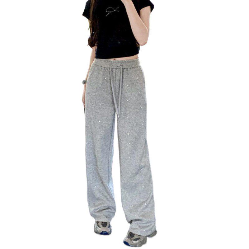 烫钻设计感卫裤高腰休闲裤女春季2024新款直筒抽绳百搭拖地长裤子