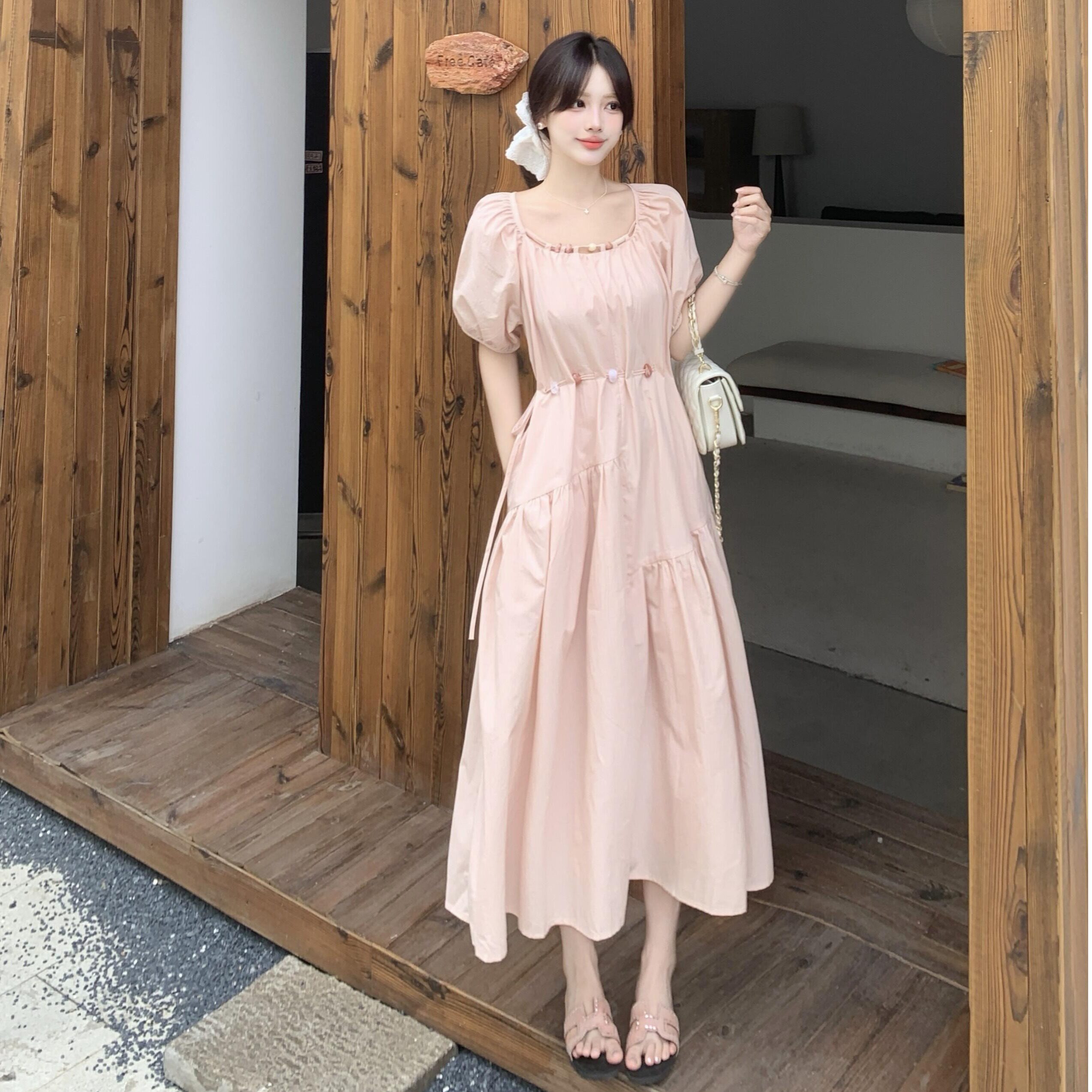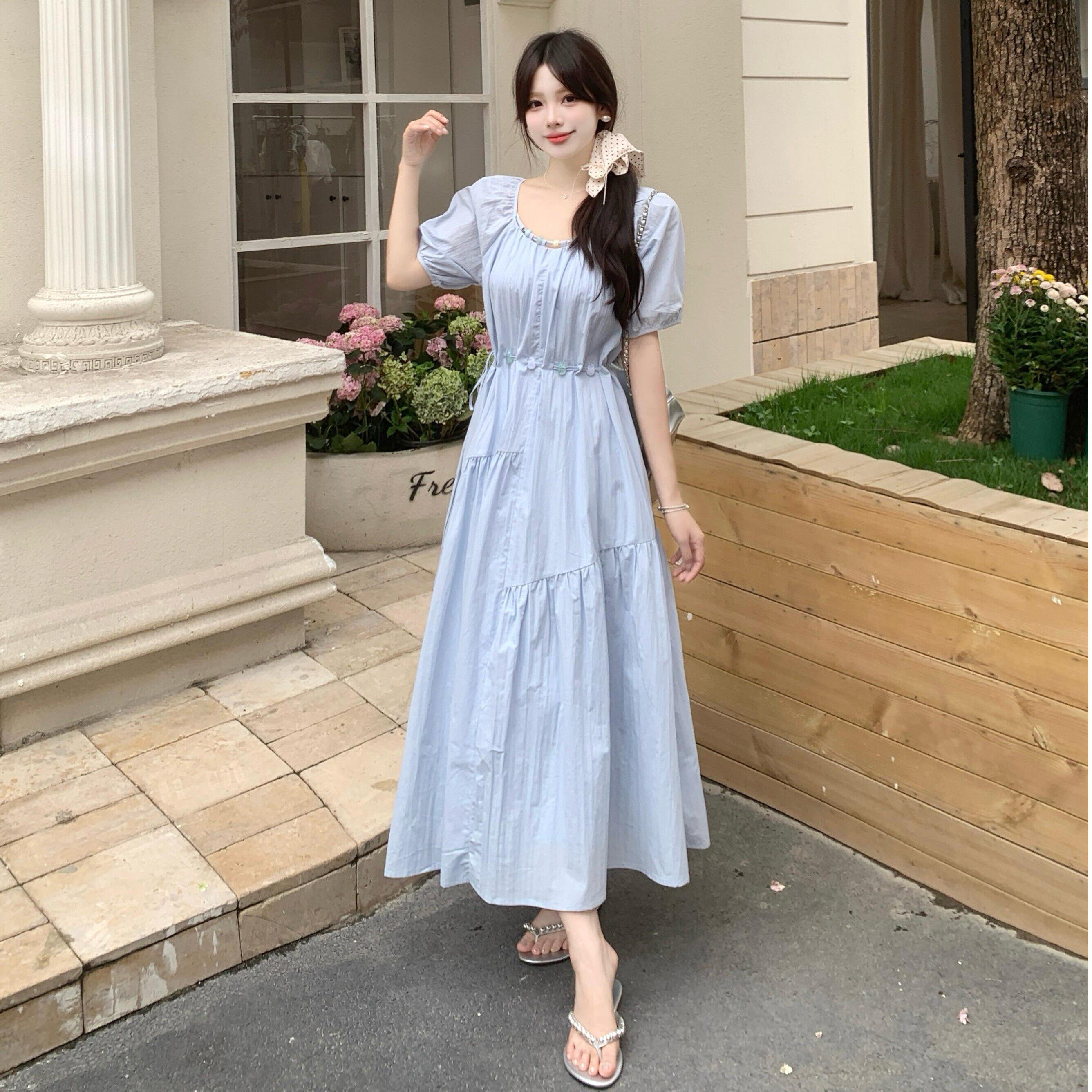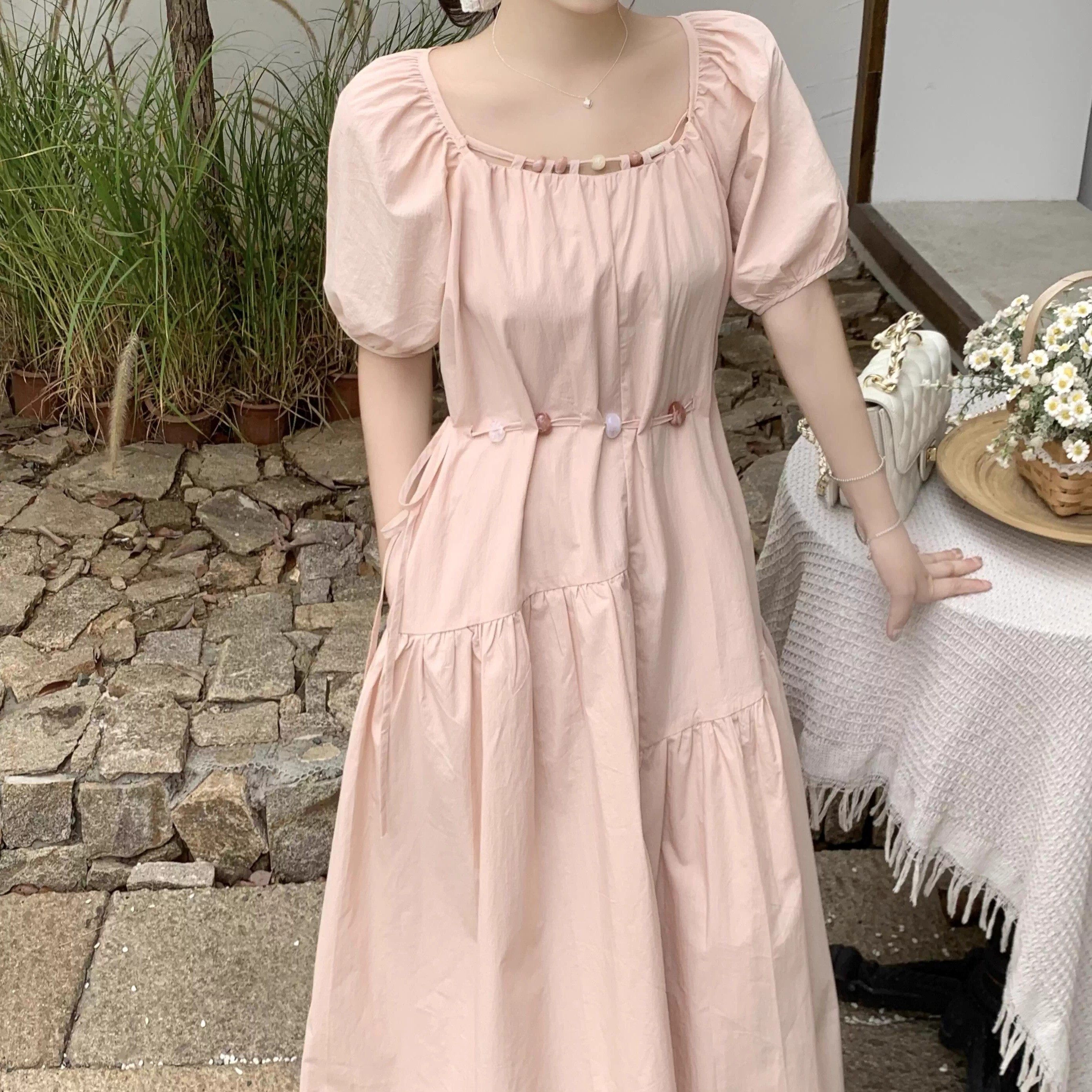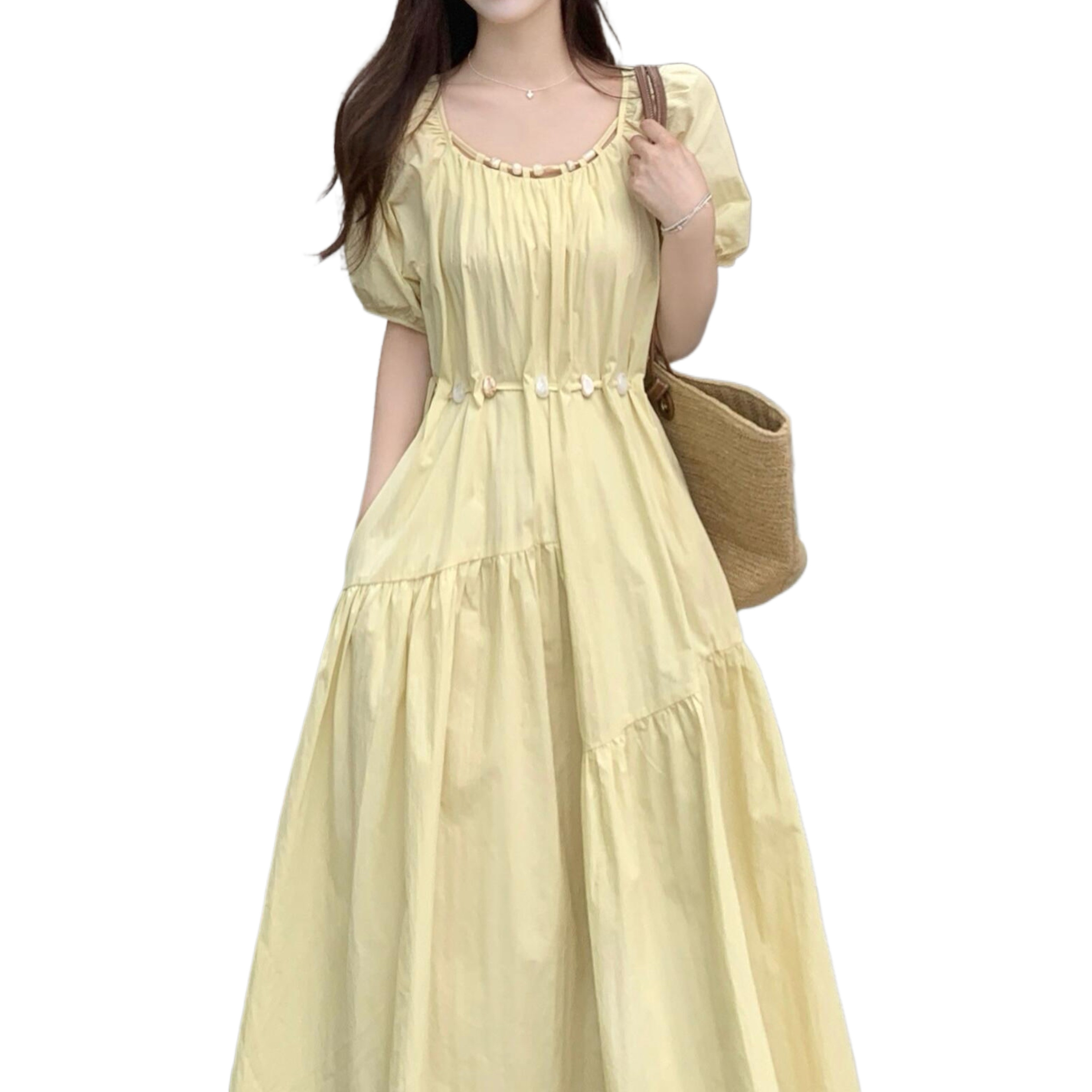 尺码法式衬衫式洋装女夏季胖MM甜美泡泡袖遮肉显瘦减龄黄色长裙子
