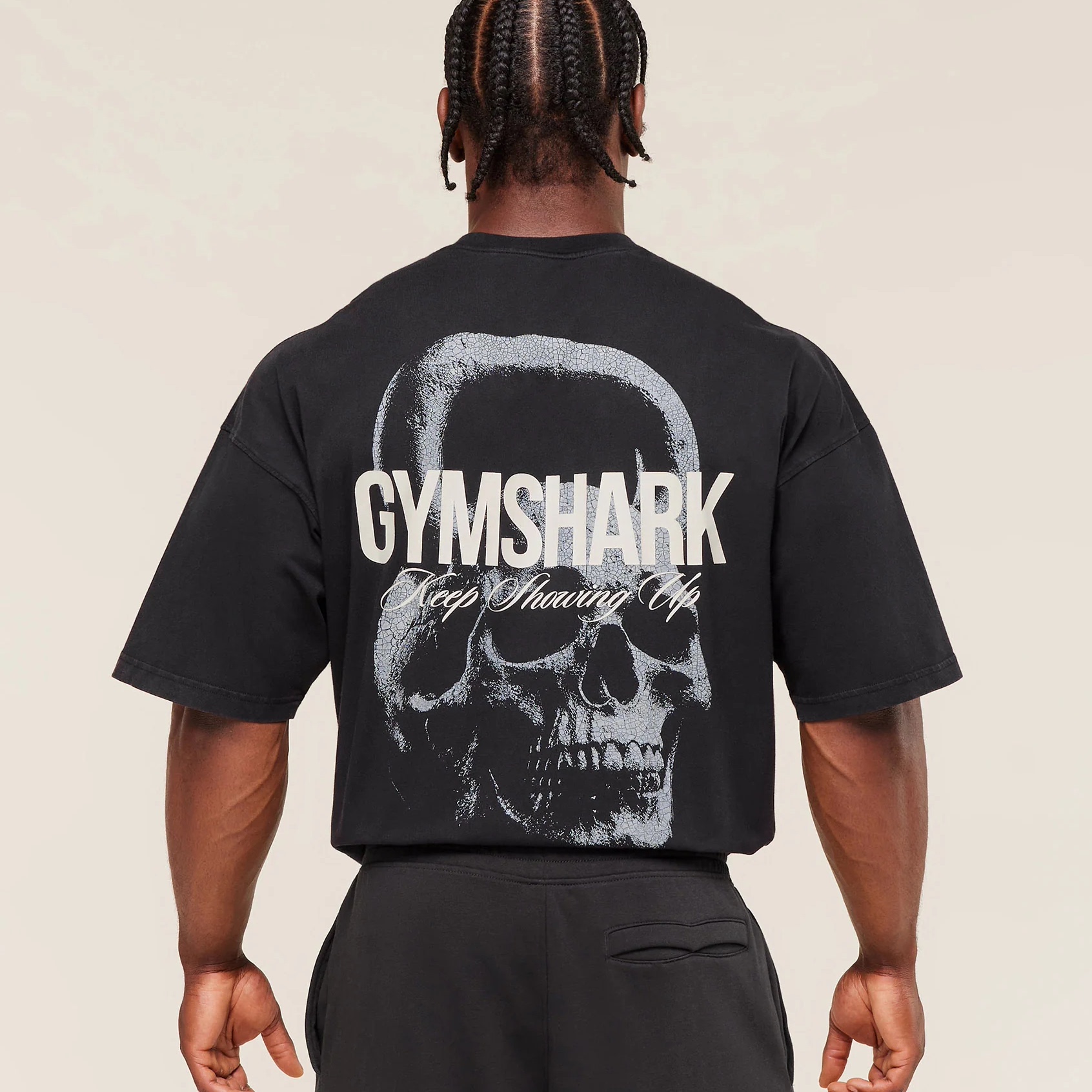 GYMSHARK鲨鱼健身宽松重磅棉短袖T恤男女美式运动骷髅壶铃五分袖