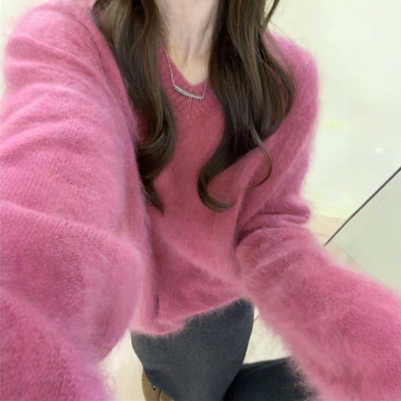 慵懒风玫红色v领毛衣女秋冬高级感宽松内搭针织衫奶呼呼软糯上衣
