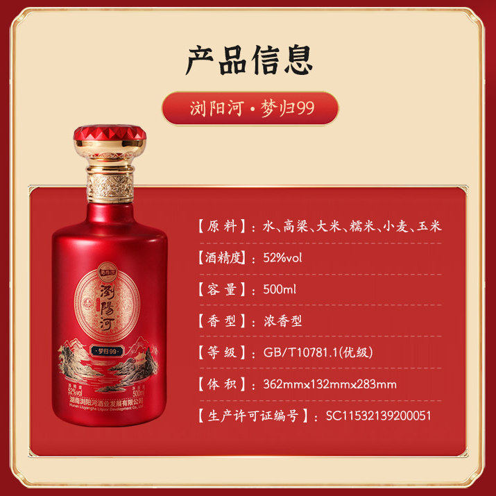 浏阳河梦归99浓香型白酒52度500ML*2瓶礼盒装纯粮食口粮酒正品