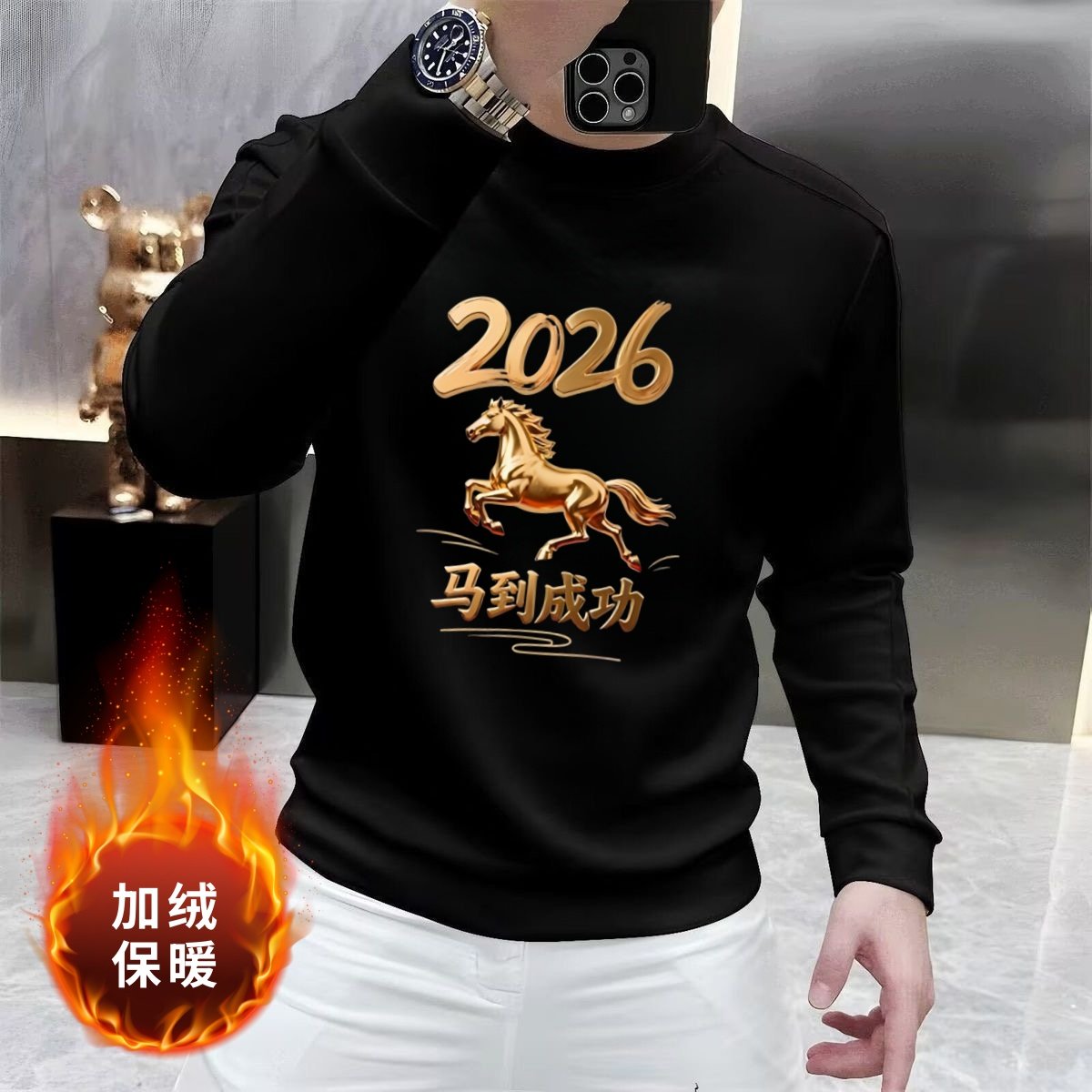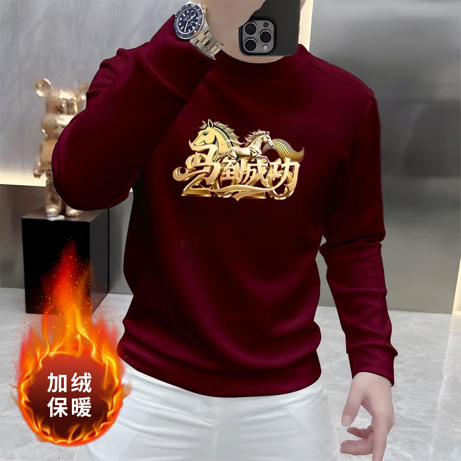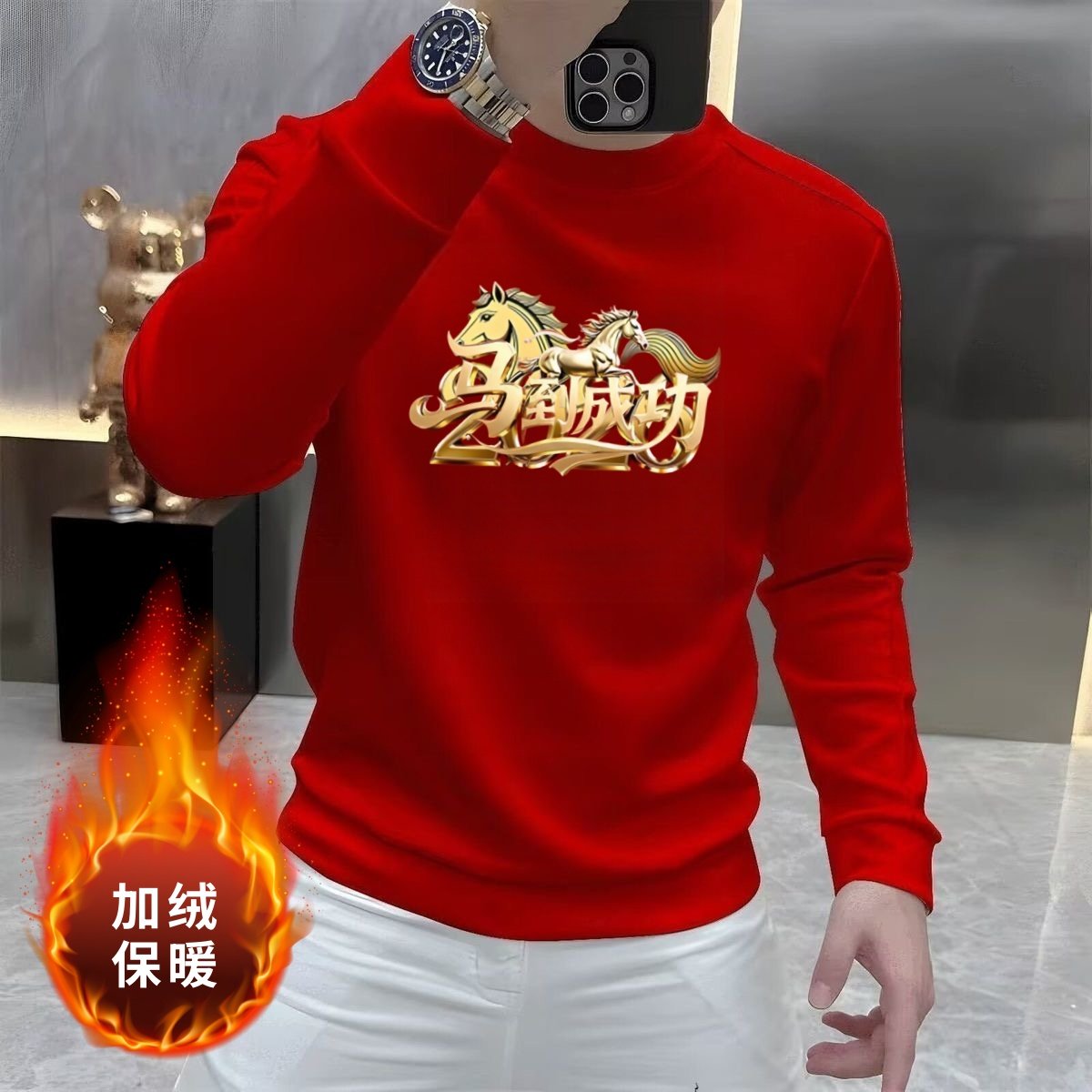 本命年红色卫衣男潮流个性中式骏马印花圆领加绒加厚打底长袖上衣