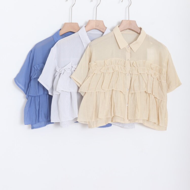 D19036日单新款客供单排扣翻边领宽松显瘦女甜美花边短款短袖衬衫