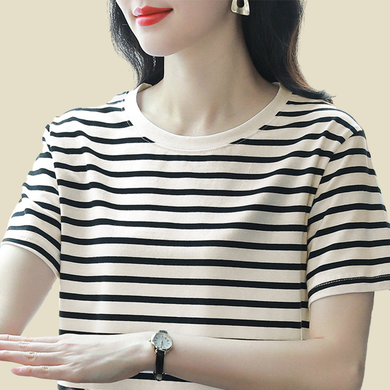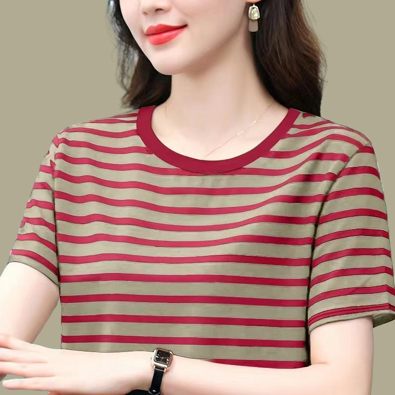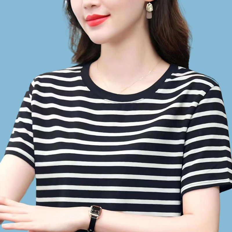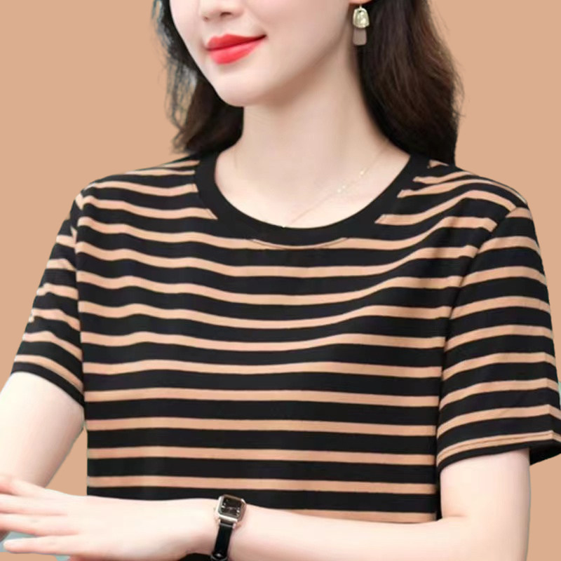 宽松短袖t恤女2026妈妈夏装新款纯棉中年气质减龄条纹半袖上衣女