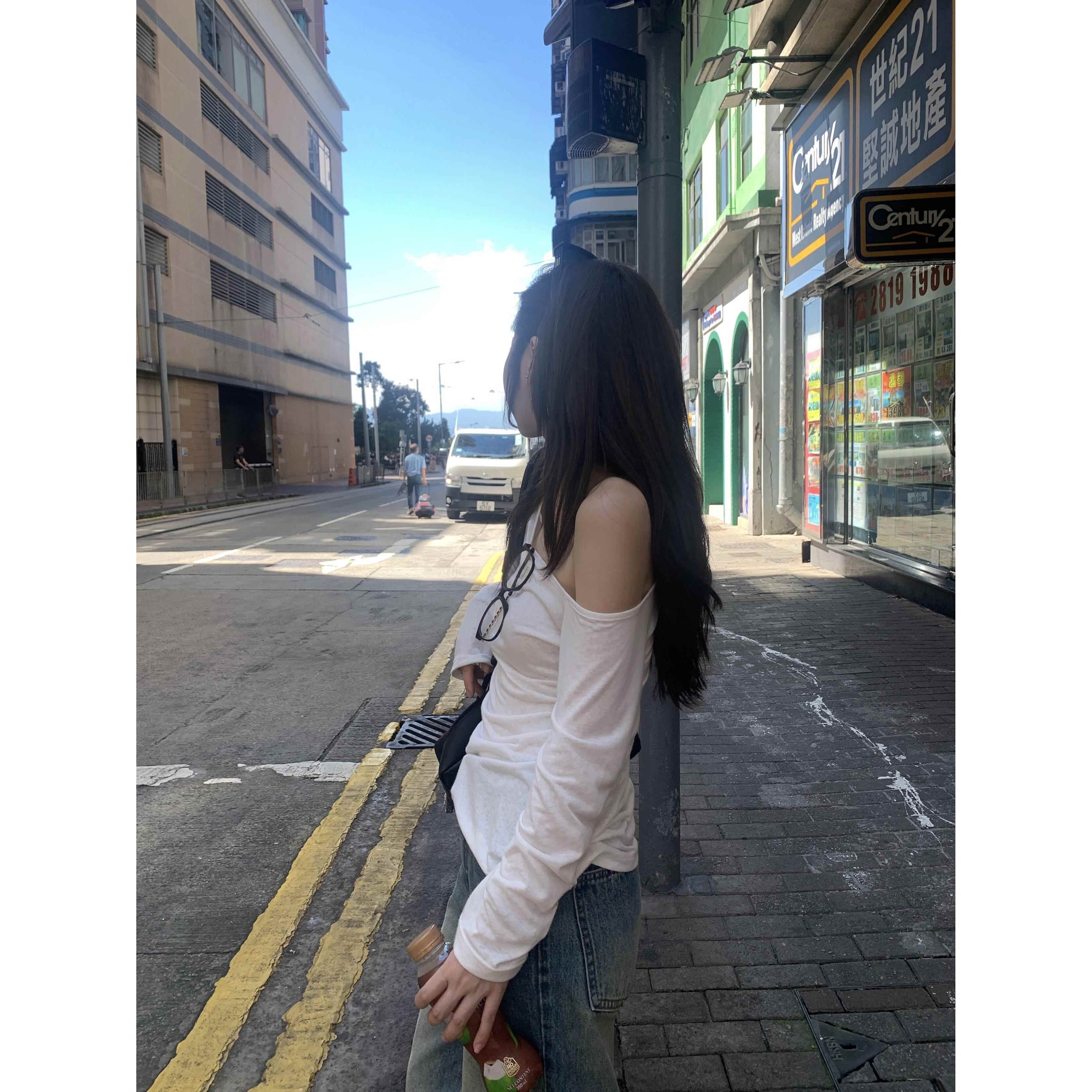 黄只只zzpalette 斜肩抽褶防晒长袖T恤女夏宽松休闲薄款露肩上衣