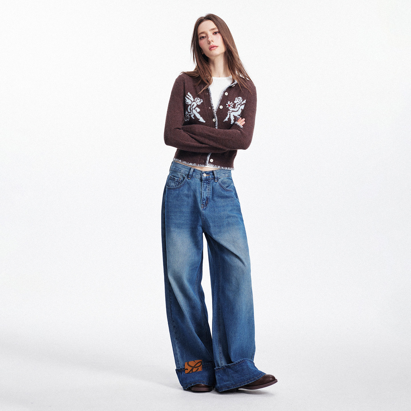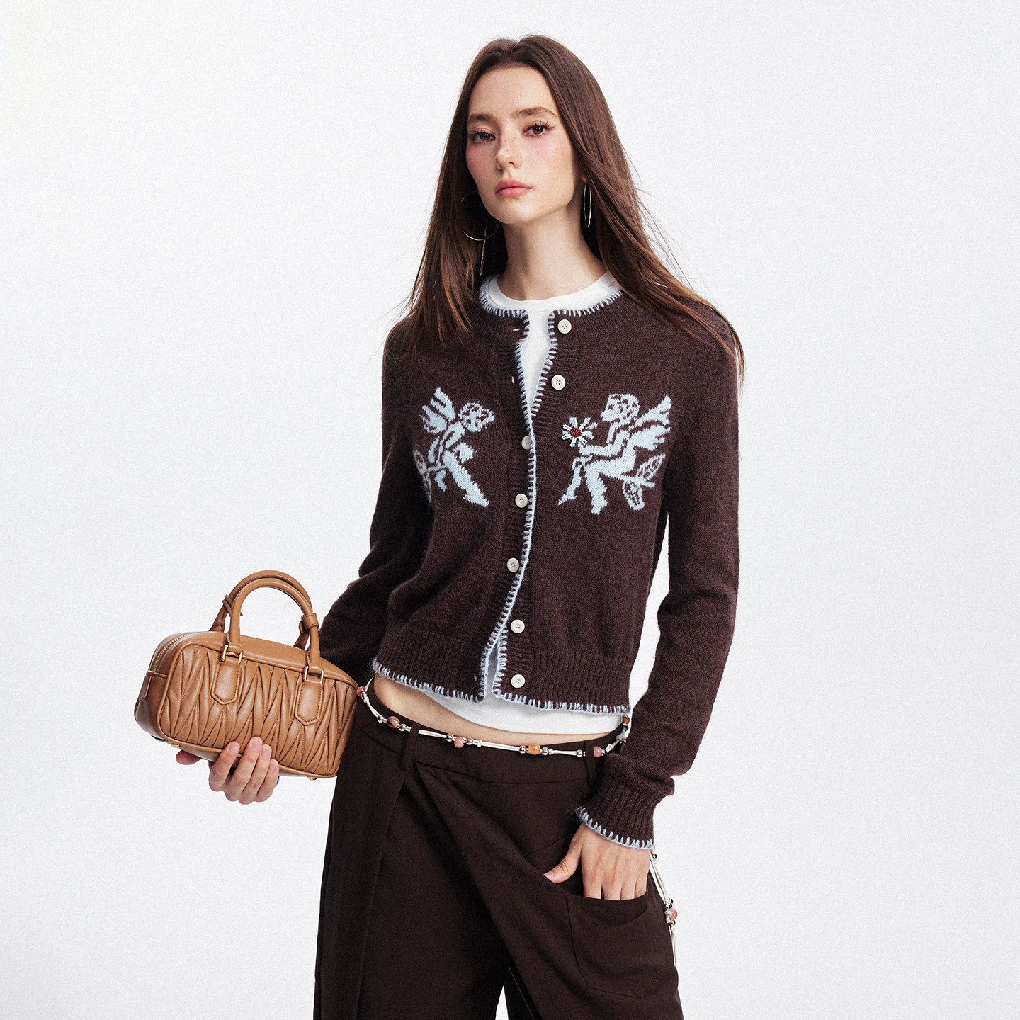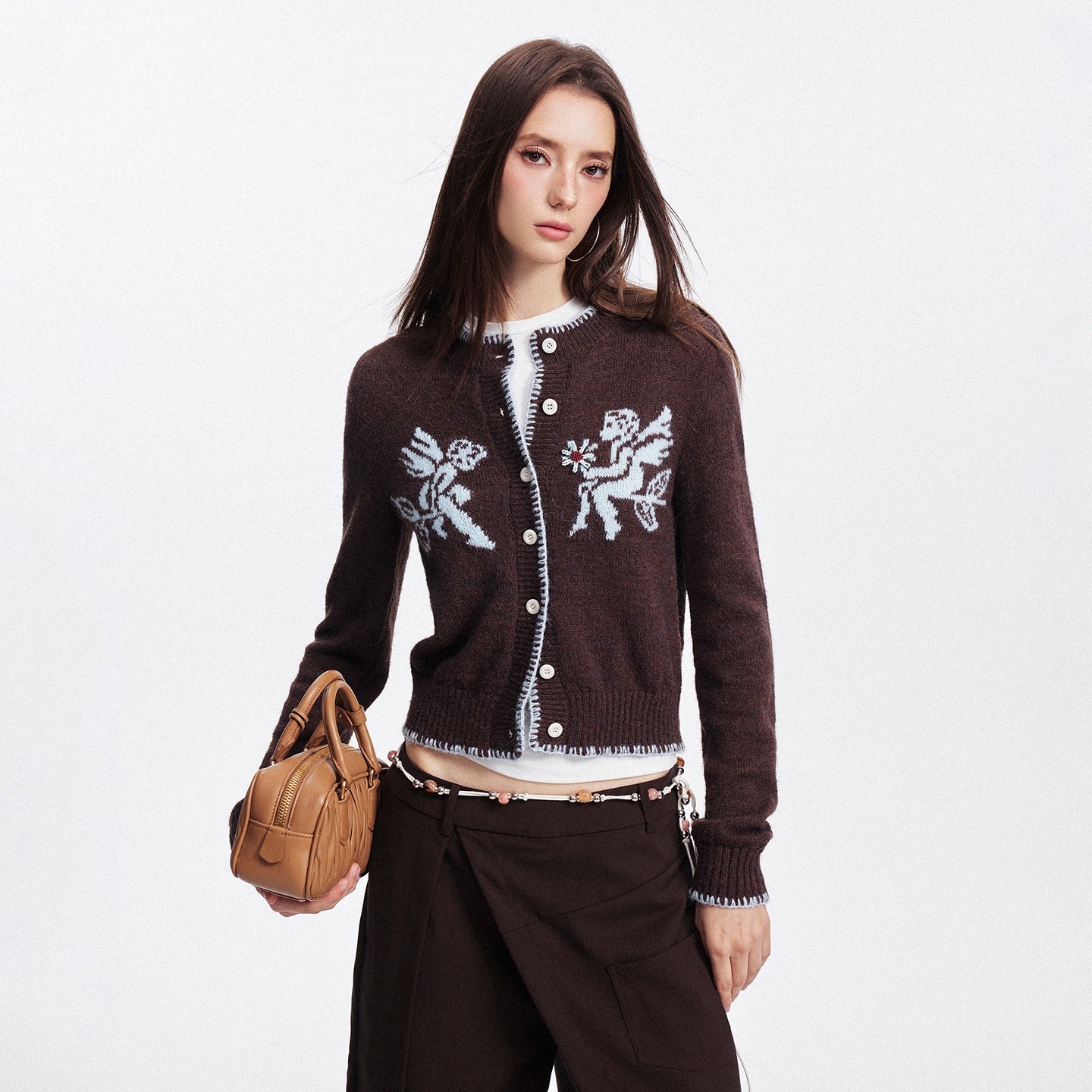 SEGI原创设计秋季新款羊毛混纺丘比特提花钉花针织毛衣开衫女上衣
