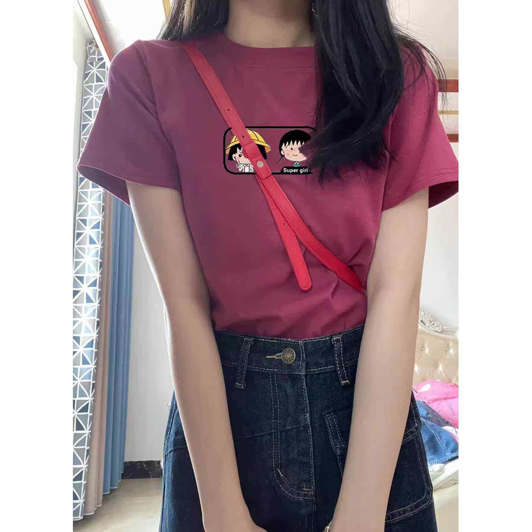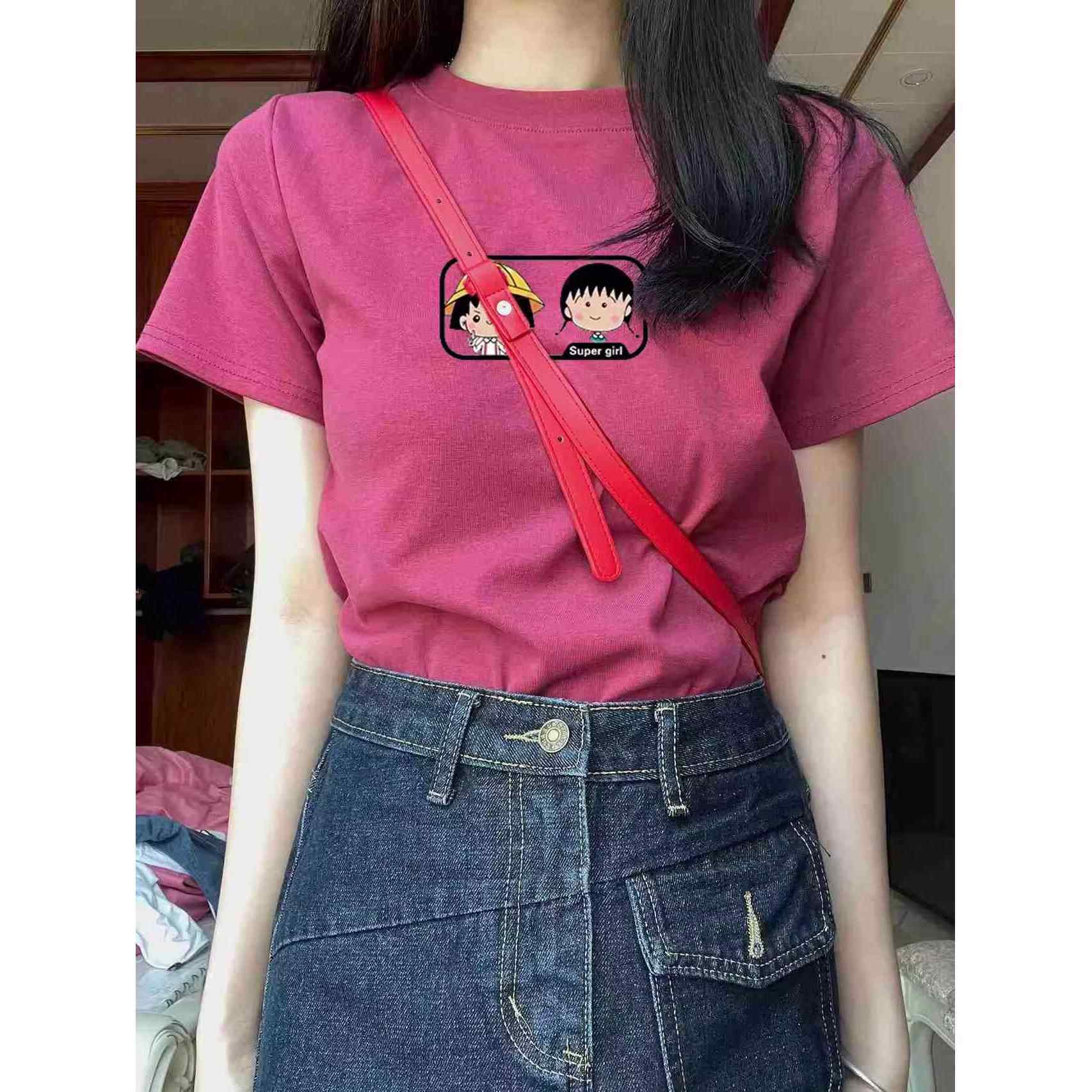 美式复古玫红色正肩印花短袖T恤女2025夏季高级感别致上衣ins修身