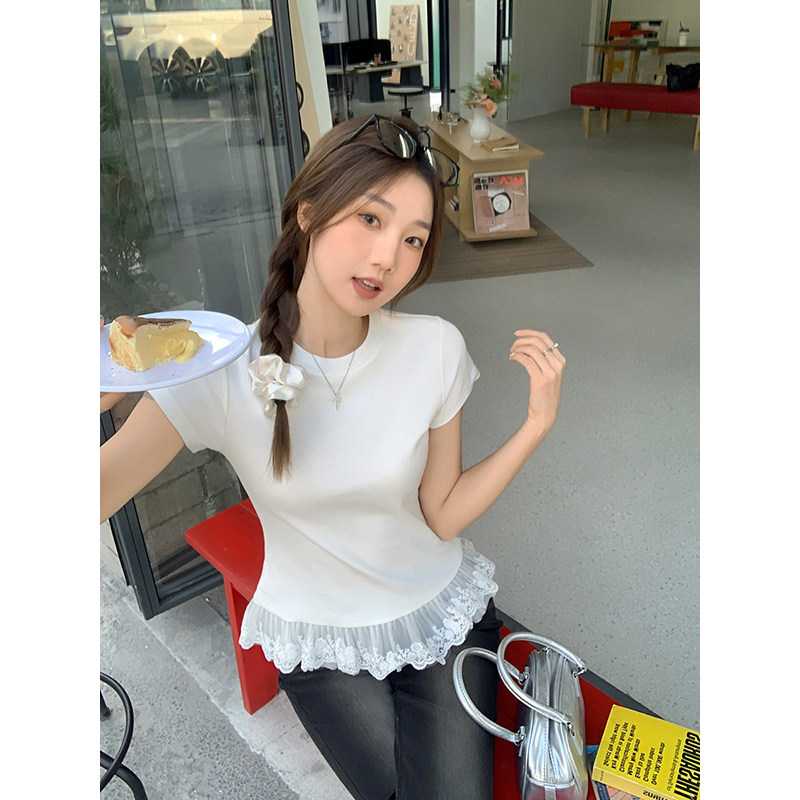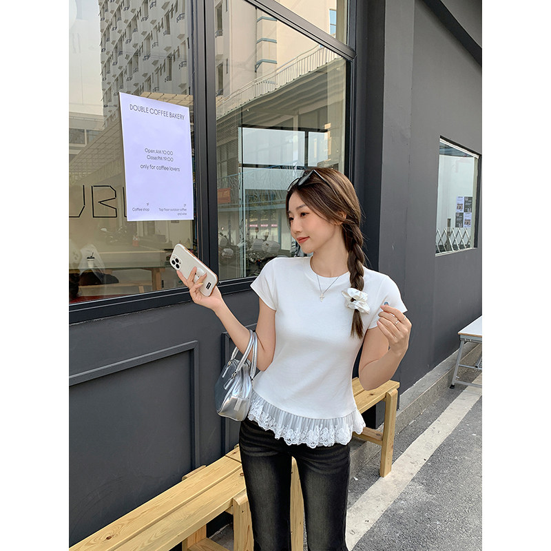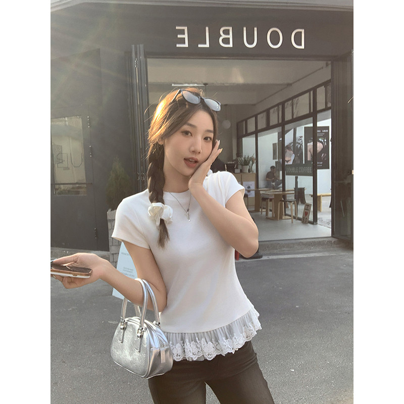 实拍实价纯欲蕾丝花边芭蕾风短袖t恤女赵春夏高级感内搭打底上衣