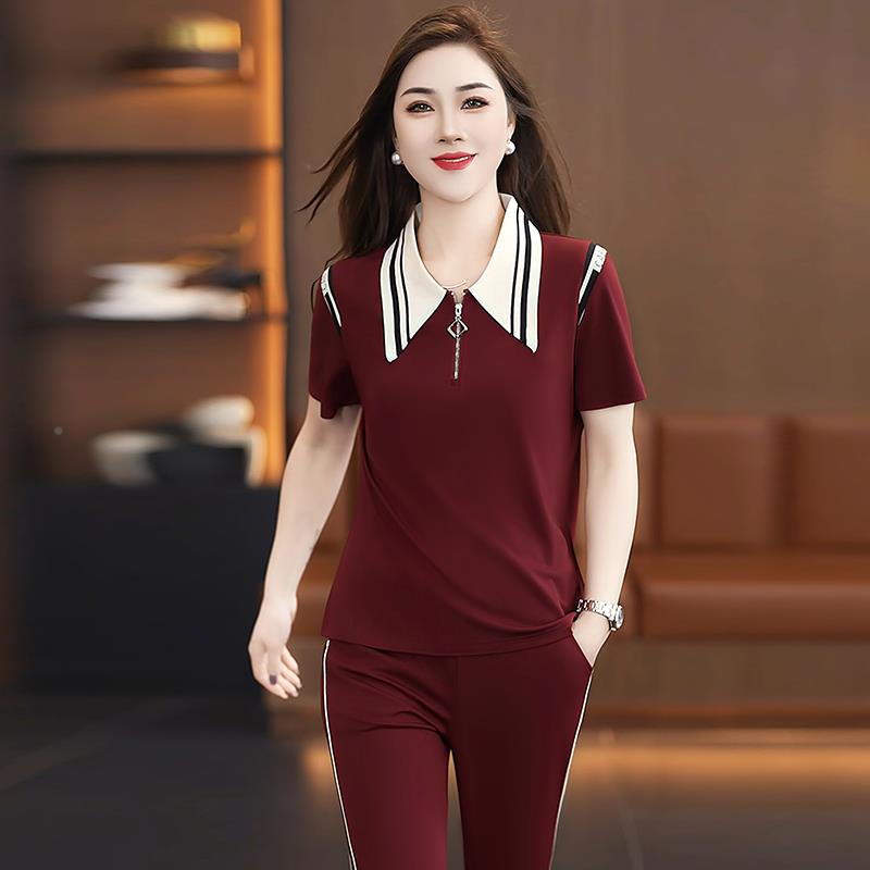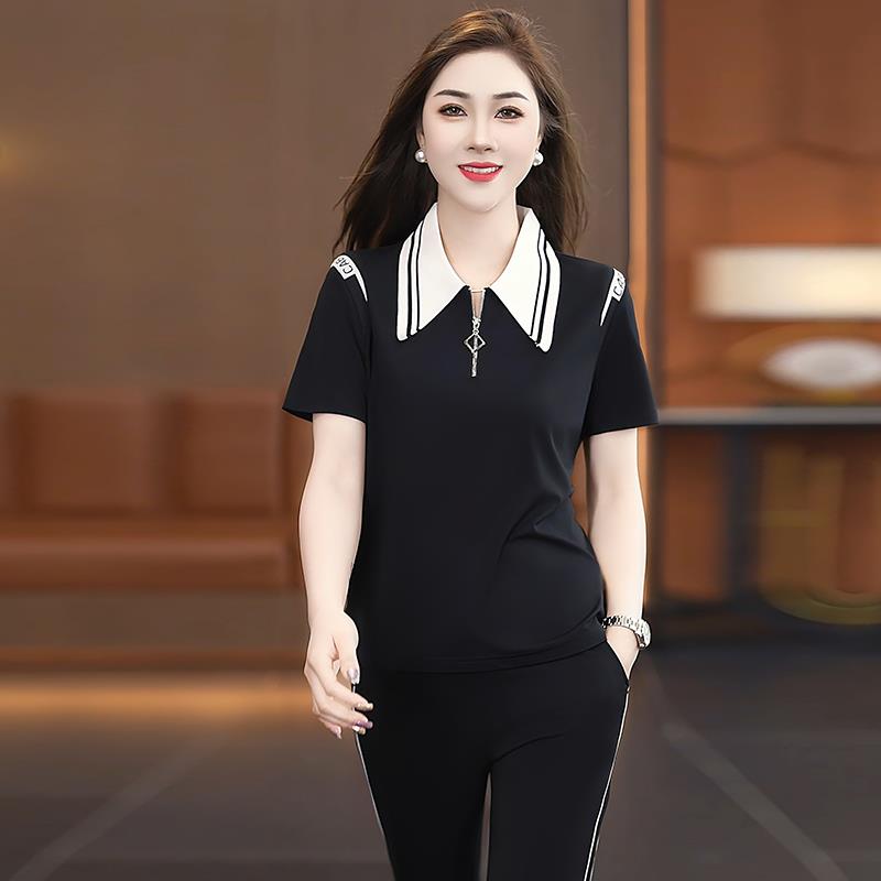 运服套装夏洋季新款89826842宽动松气质显女瘦翻领短袖长裤休闲两