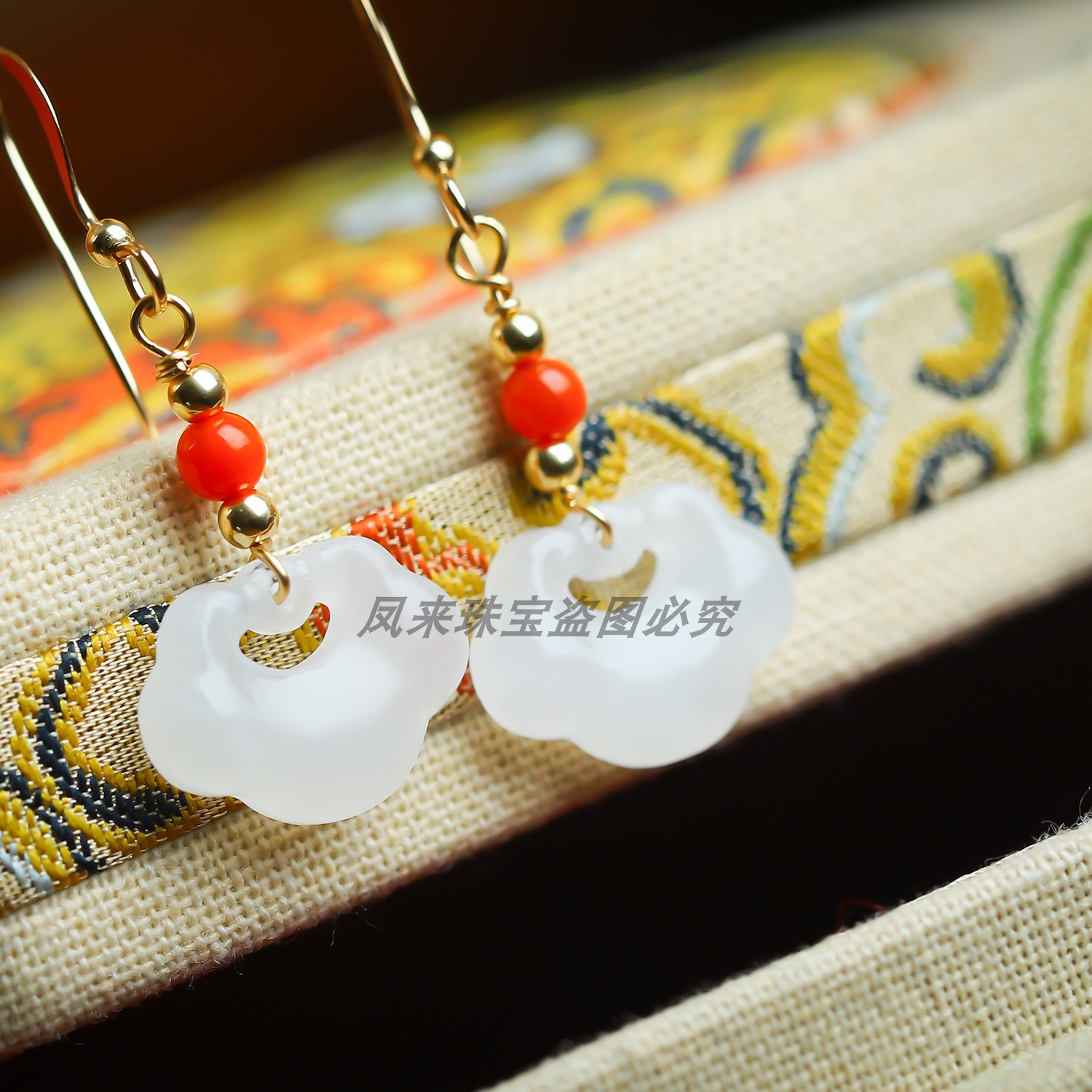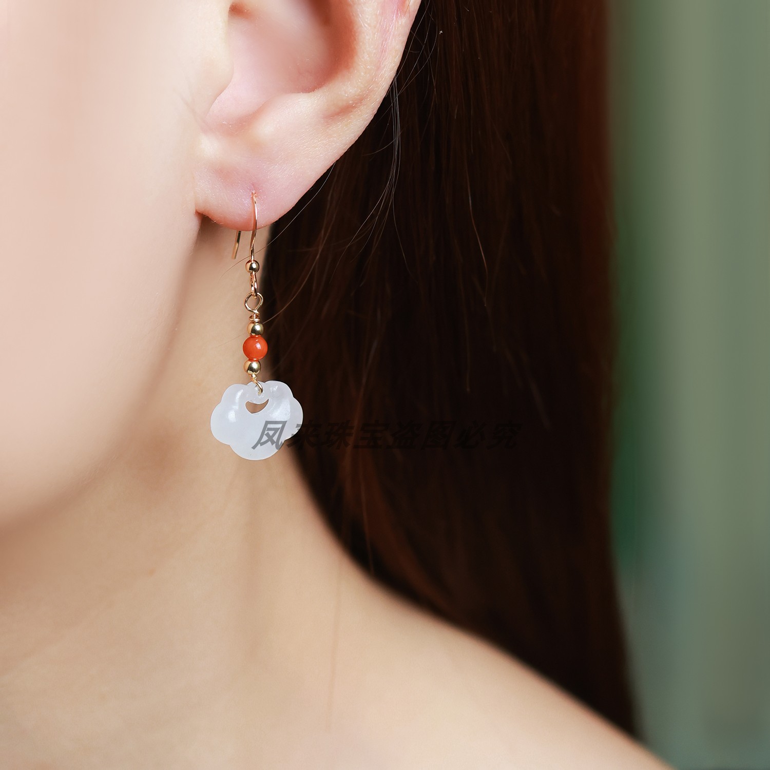 轻奢小众天然和田玉白玉平安扣如意锁耳环14K包金玉石耳坠