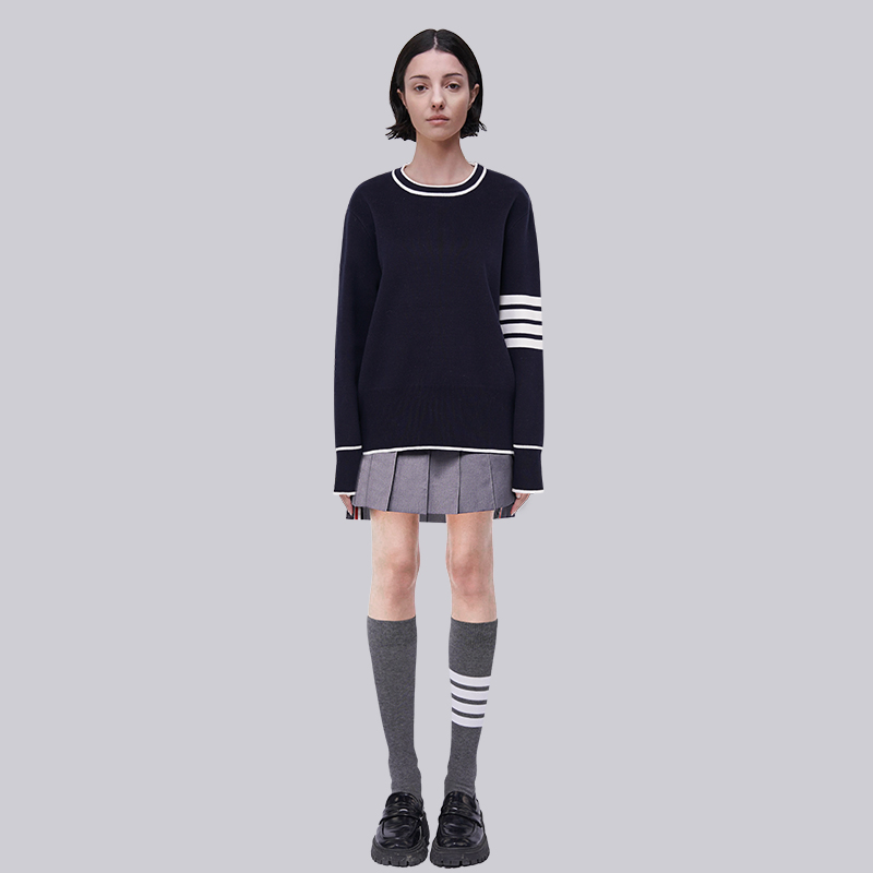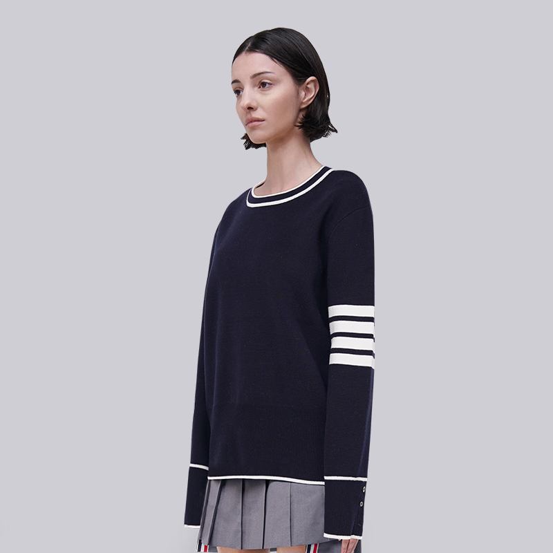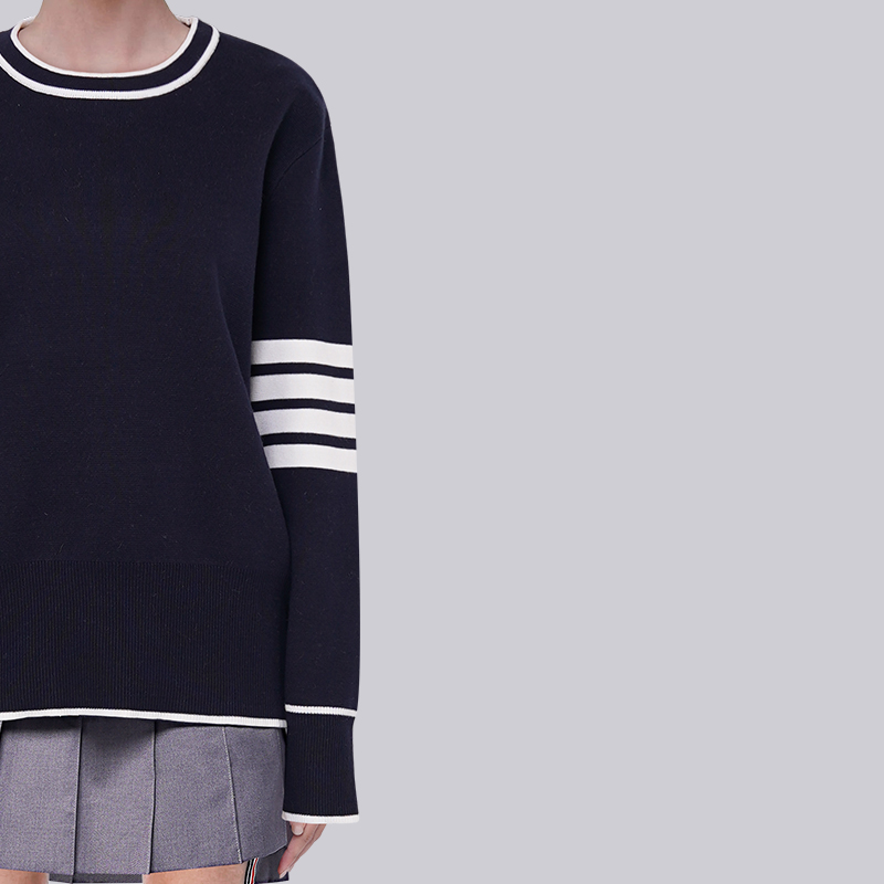首页> 女装> TB针织毛衣女2025新款秋冬条纹藏青色白色边线条男款圆领基础毛衣