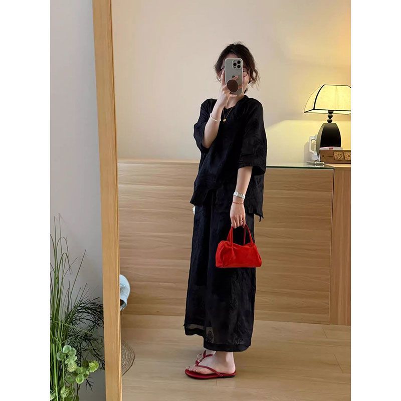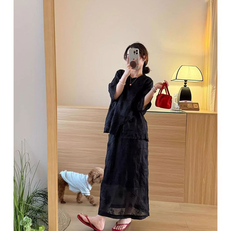 夏季松弛感慵懒宽松黑色盘扣衬衫半身裙韩系国风时尚套装女两件套