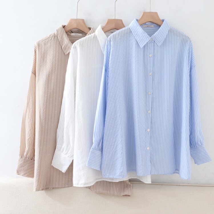 C01017日单新款客供天丝料单排扣宽松烫钻女气质中长条纹长袖衬衫
