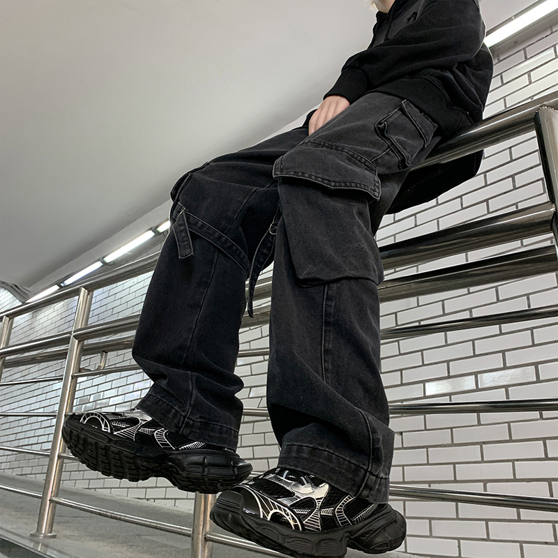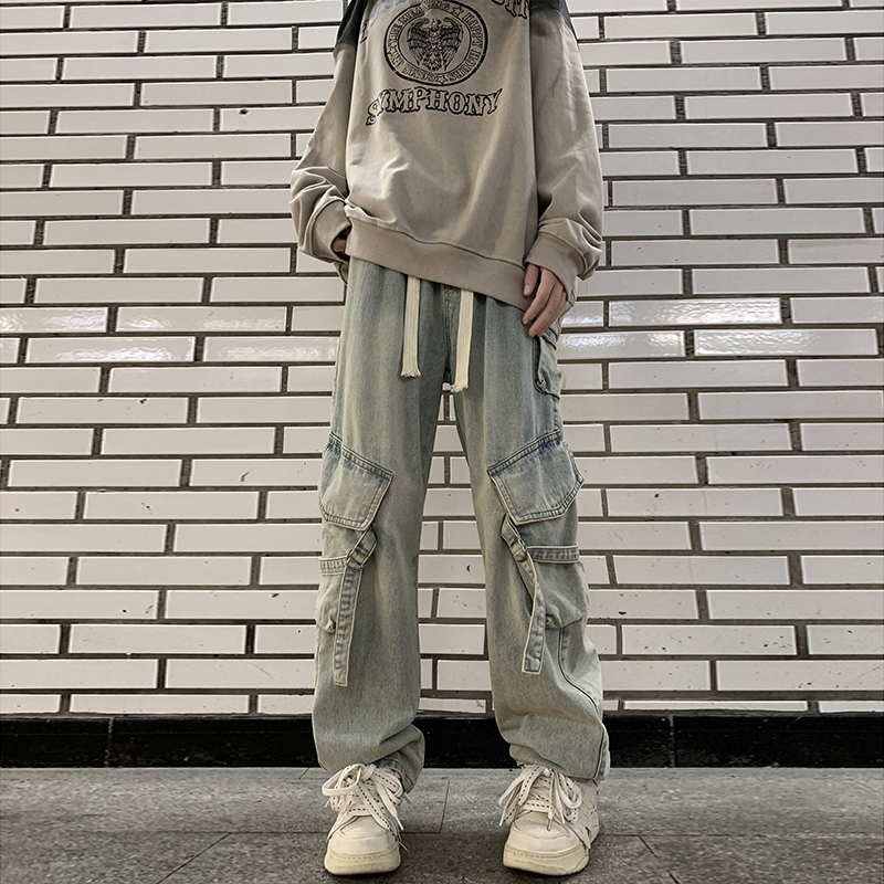 秋冬牛仔裤男生宽松直筒美式复古高街多口袋潮牌松紧阔腿工装长裤