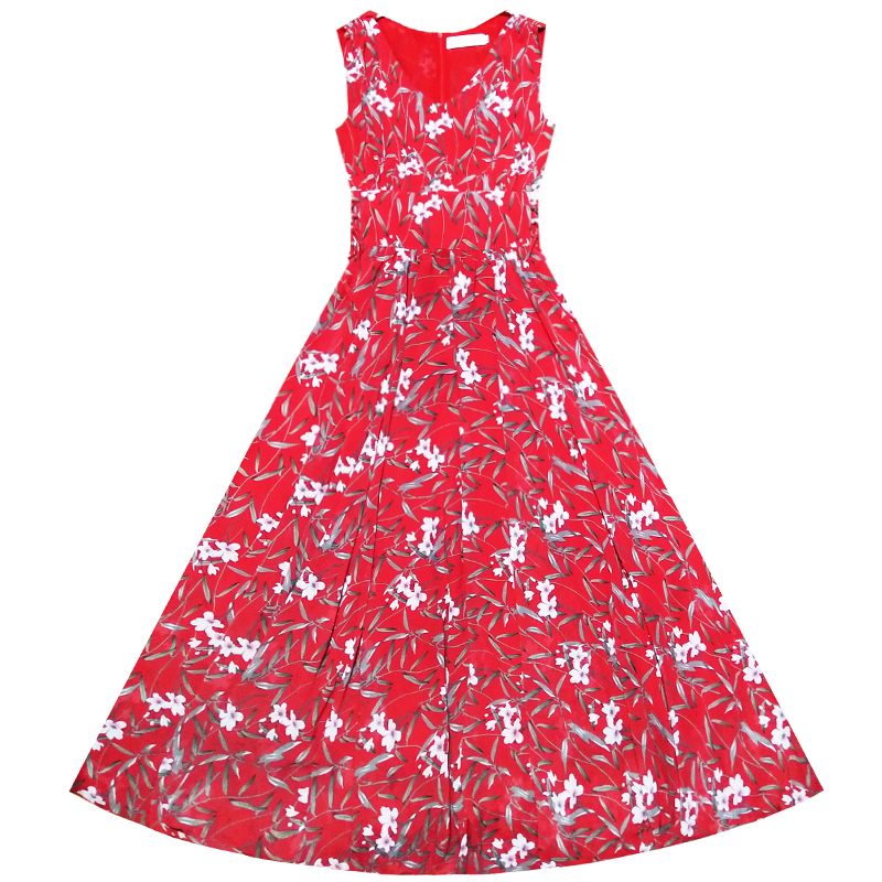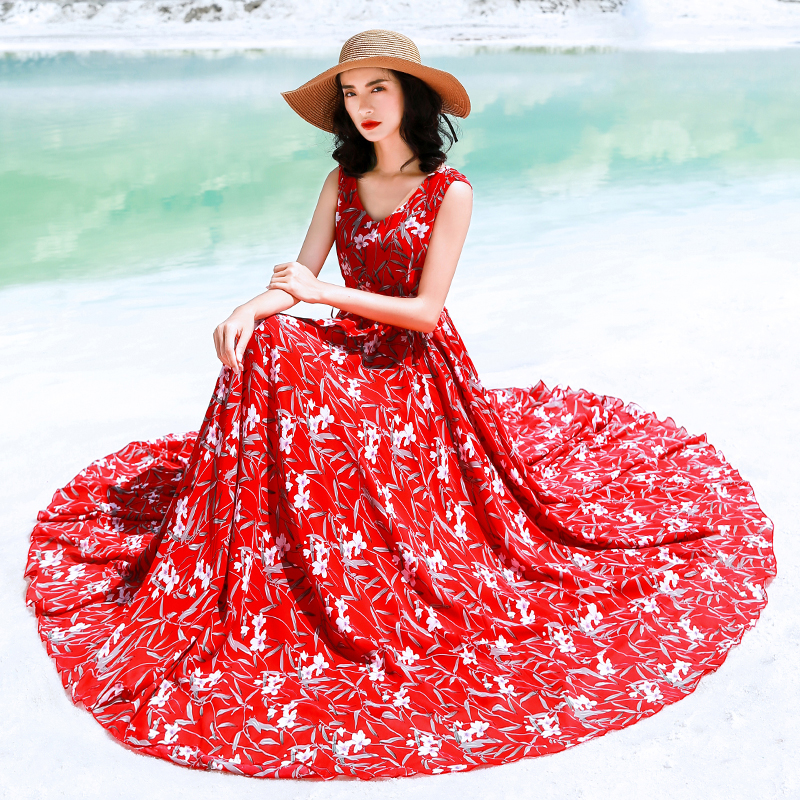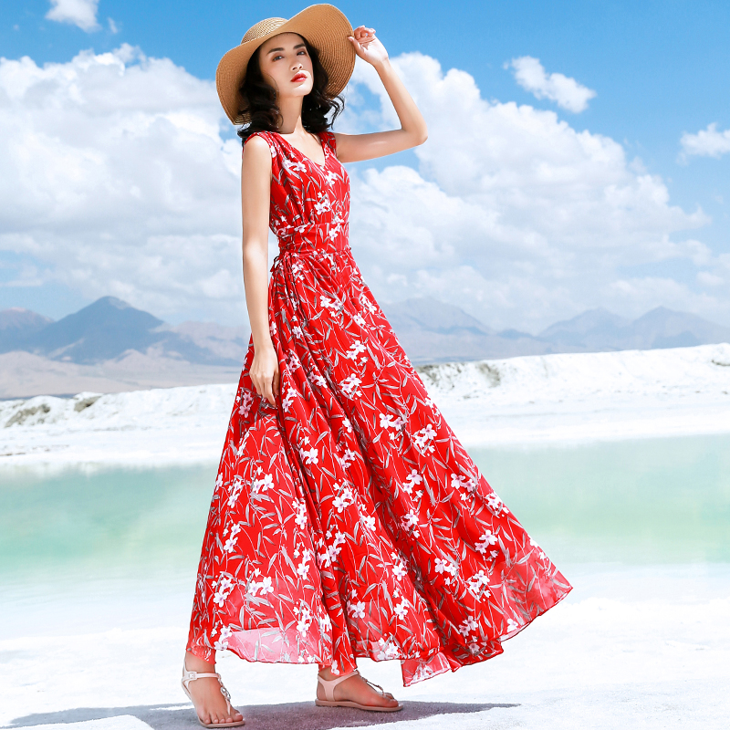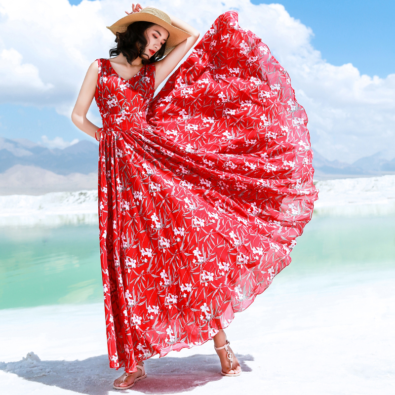 复古v领红色碎花雪纺系带连衣裙女大摆超长款中腰海边度假长裙子