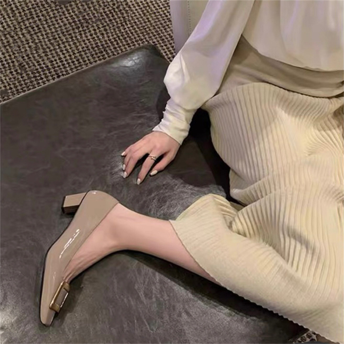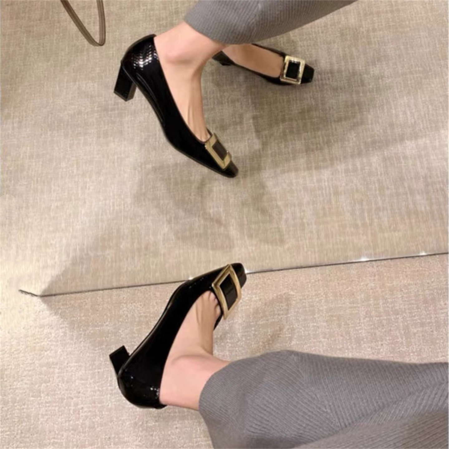 首页> 鞋包> 2026通勤百搭大象灰rv方扣女鞋牛漆皮金属方头粗跟单鞋浅口中跟鞋