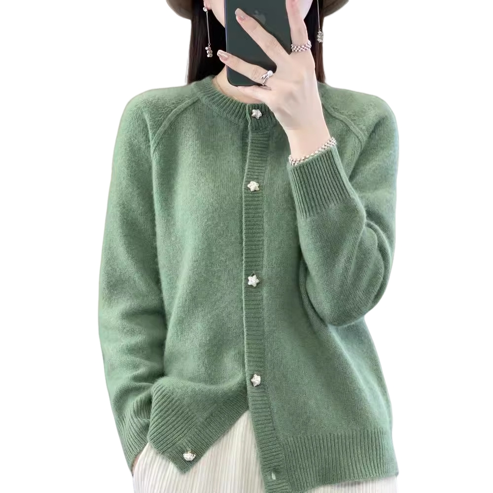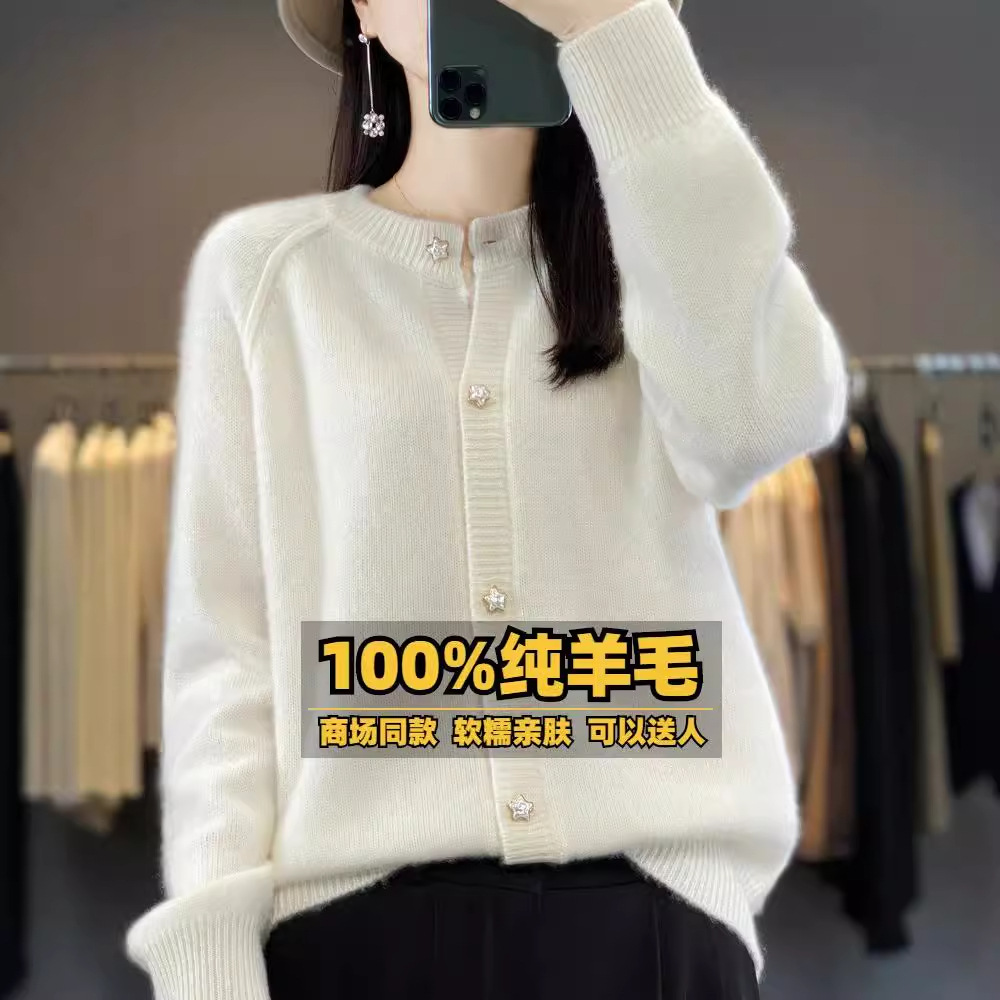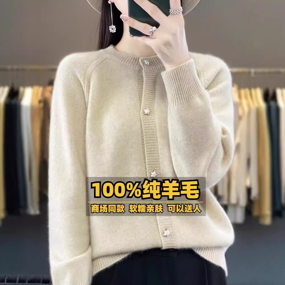 加厚100羊毛外搭开衫精品级圆领宽松长袖针织小个子外套女专柜