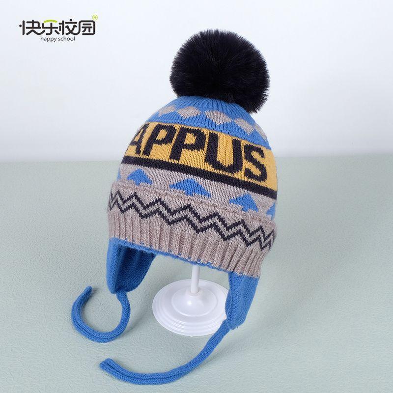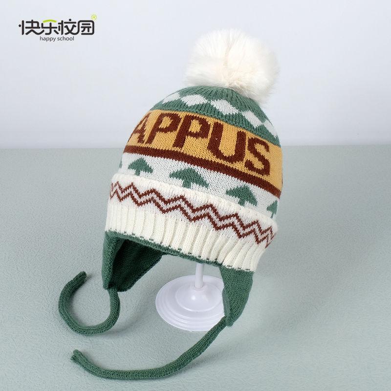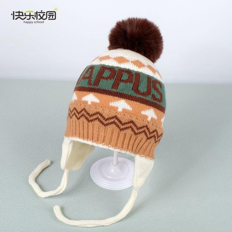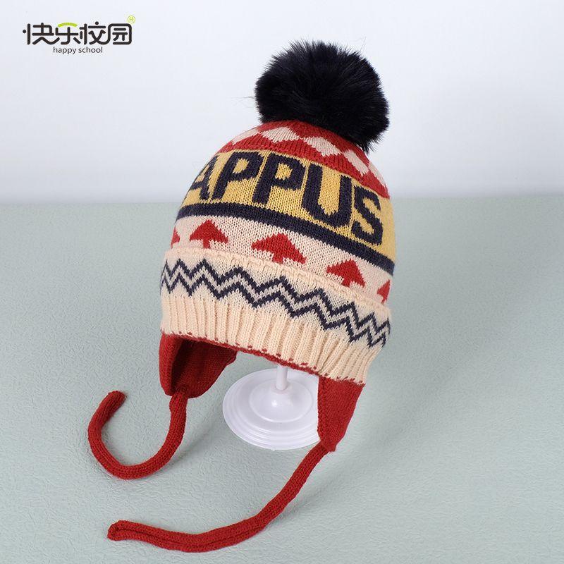 快乐校园保暖毛线帽冬款加绒保暖中大童帽子男女宝宝护耳帽儿童帽