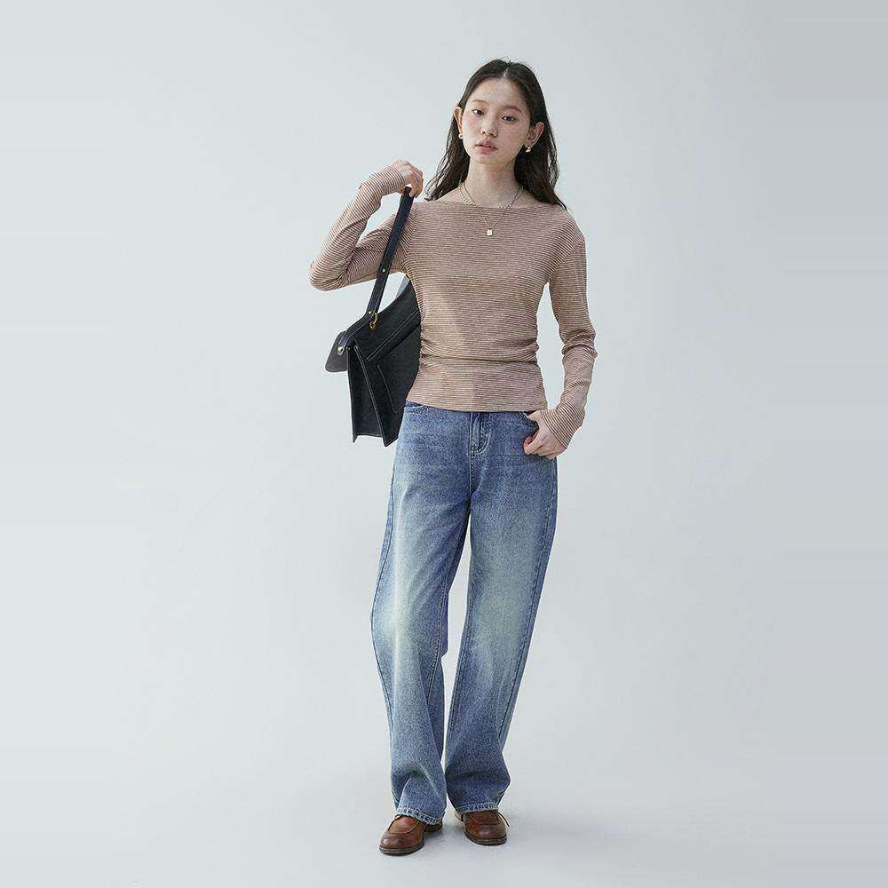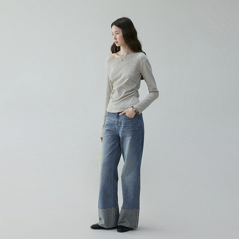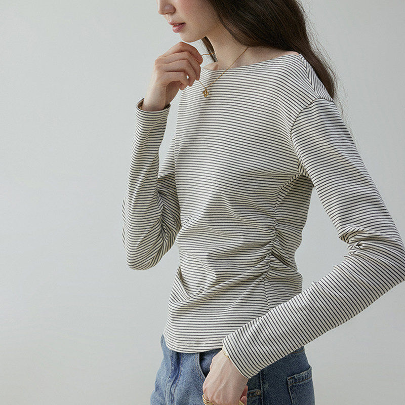 「芥末派VOOE」条纹收腰显瘦一字肩T恤女25夏季薄款长袖撞色上衣