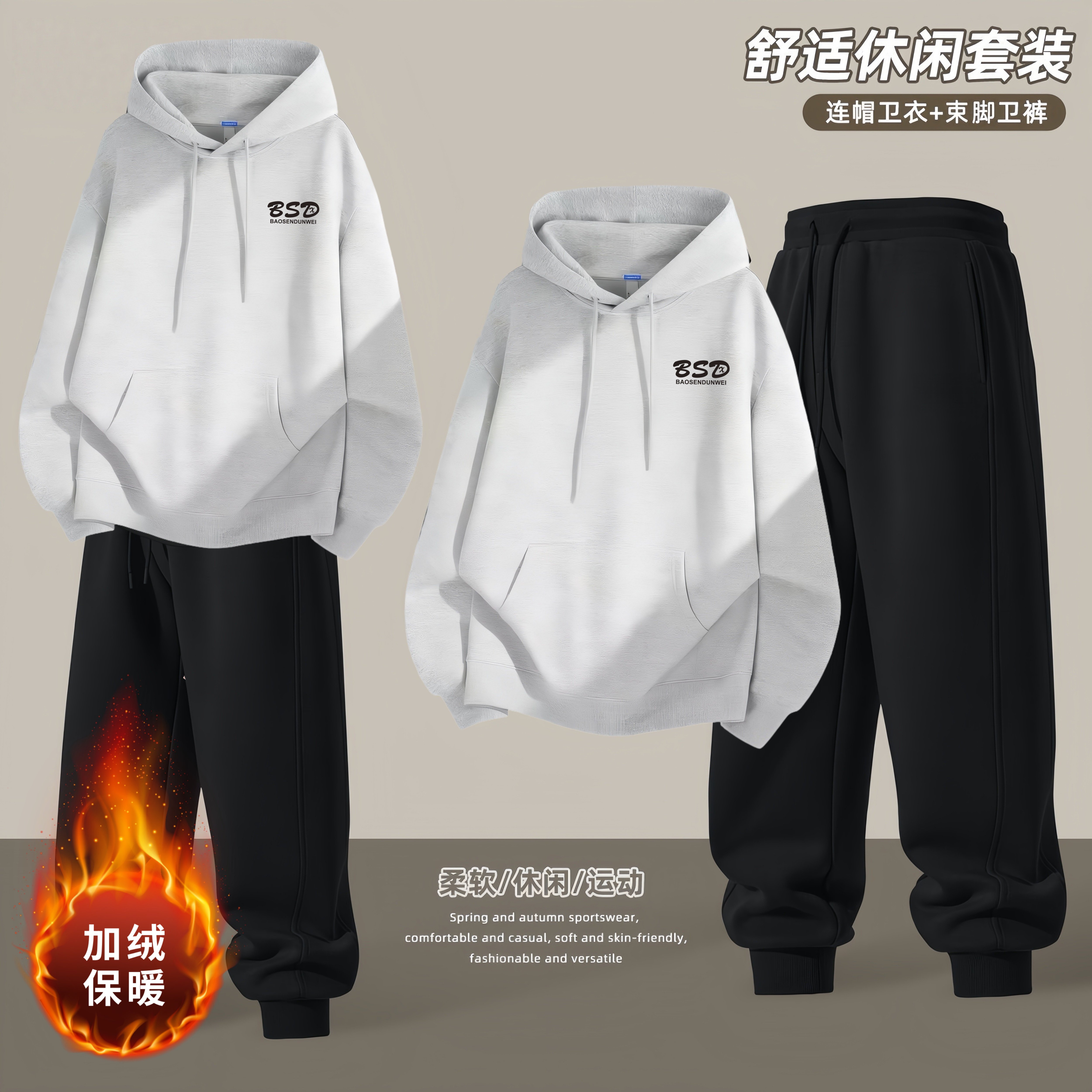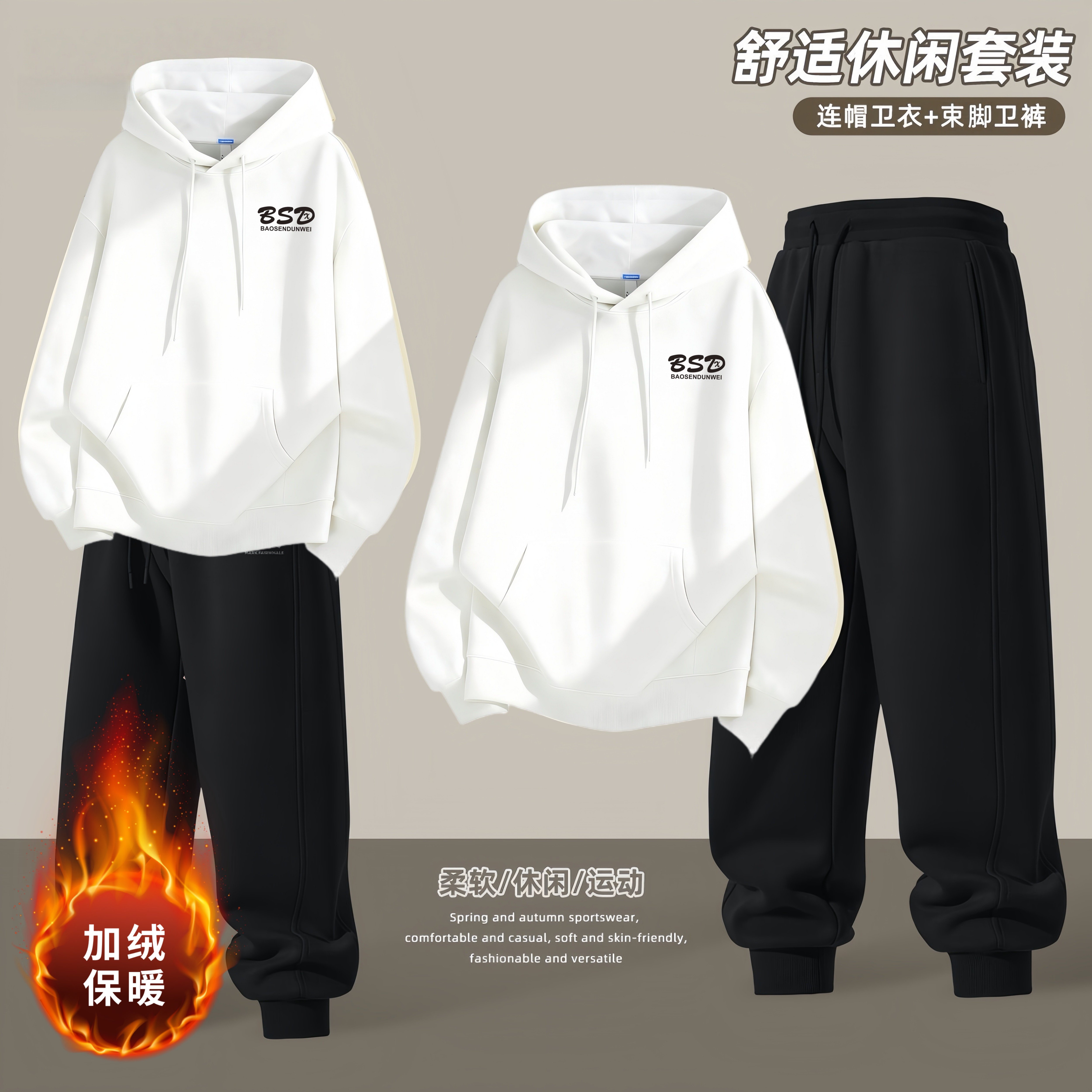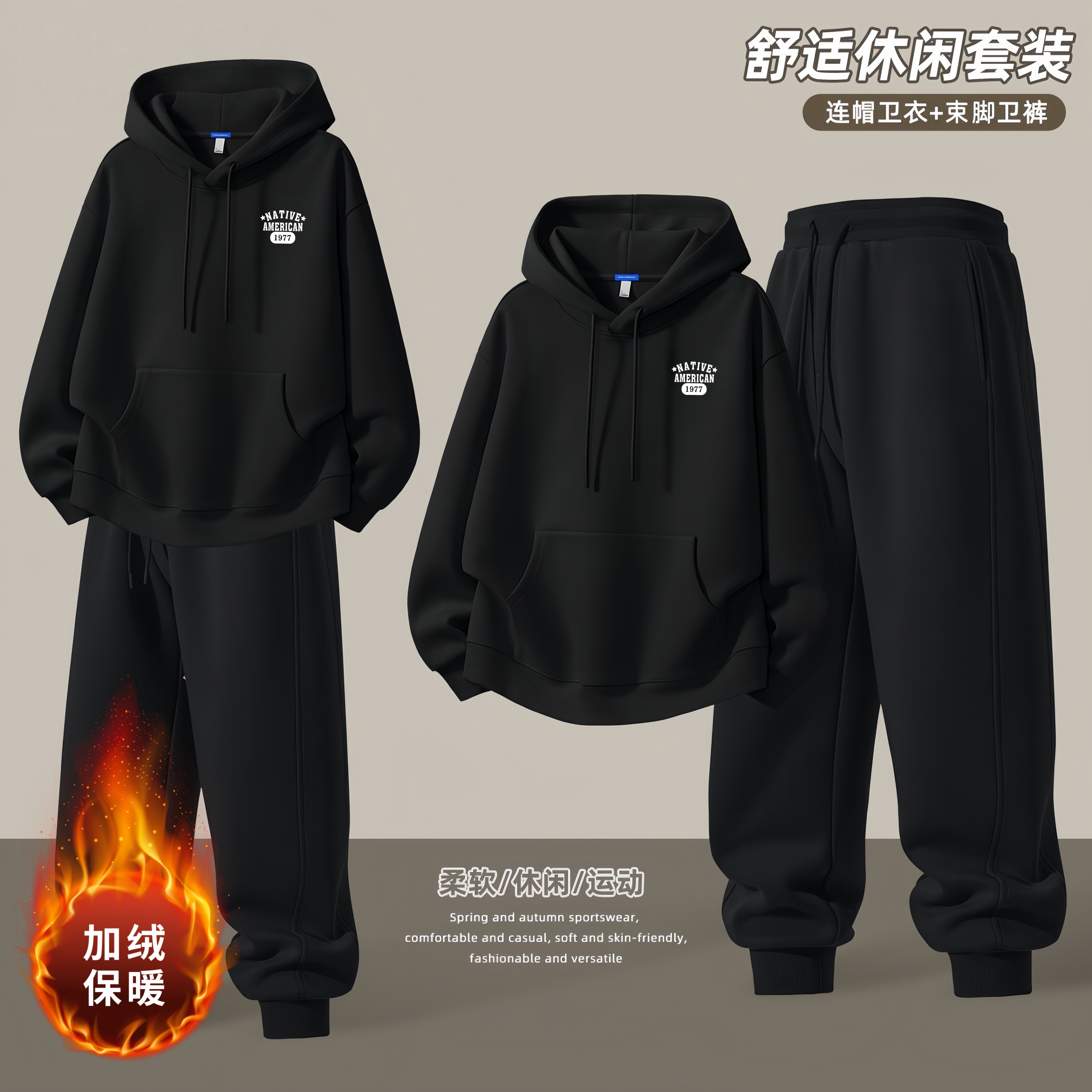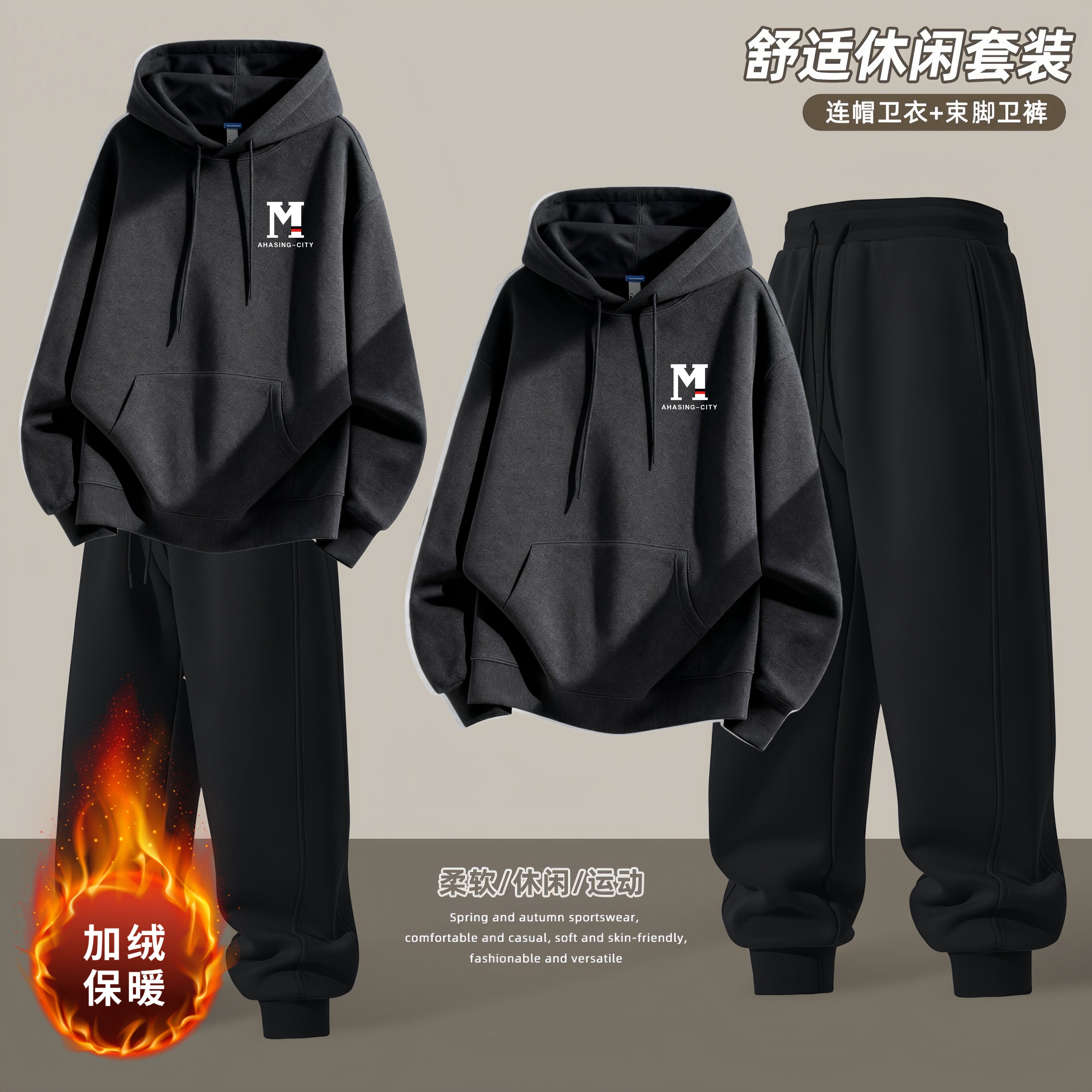 搭配一套衣服加绒加厚连帽套头卫衣秋冬款大码宽松套装卫裤子男士