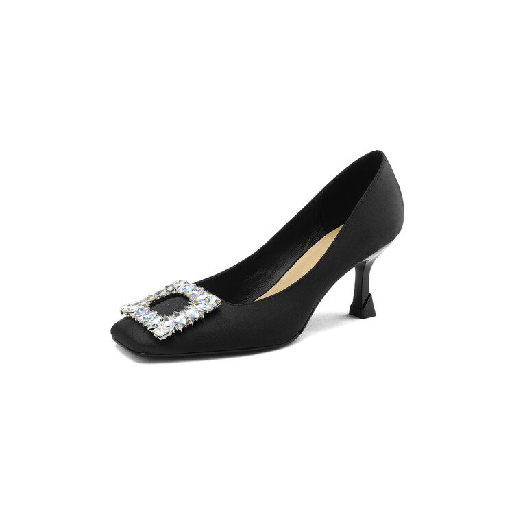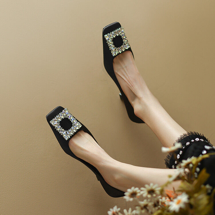 法式优雅方扣水钻绸缎新娘鞋方头浅口单鞋通勤气质小跟细高跟鞋女