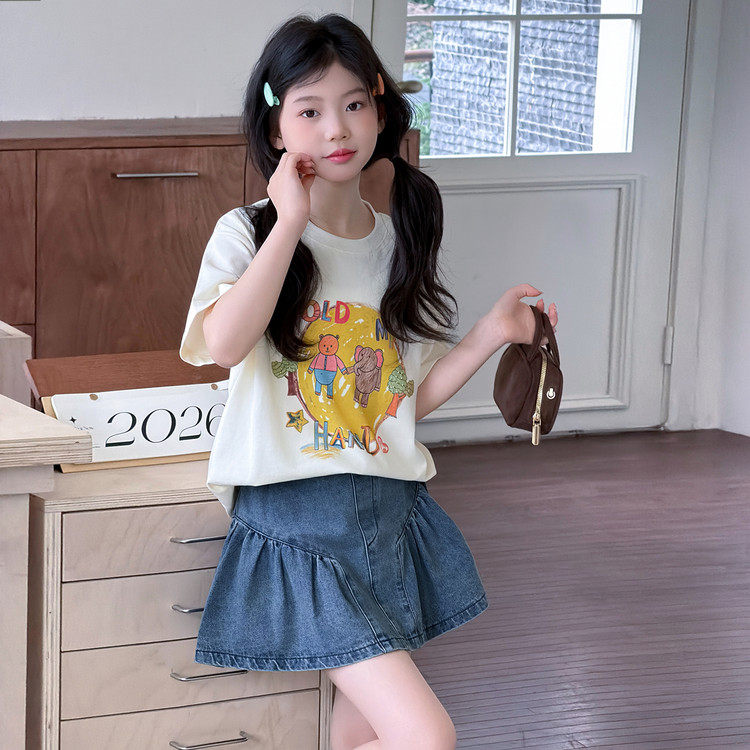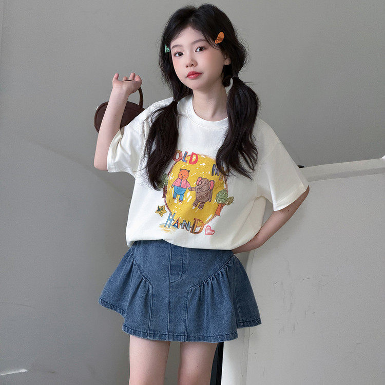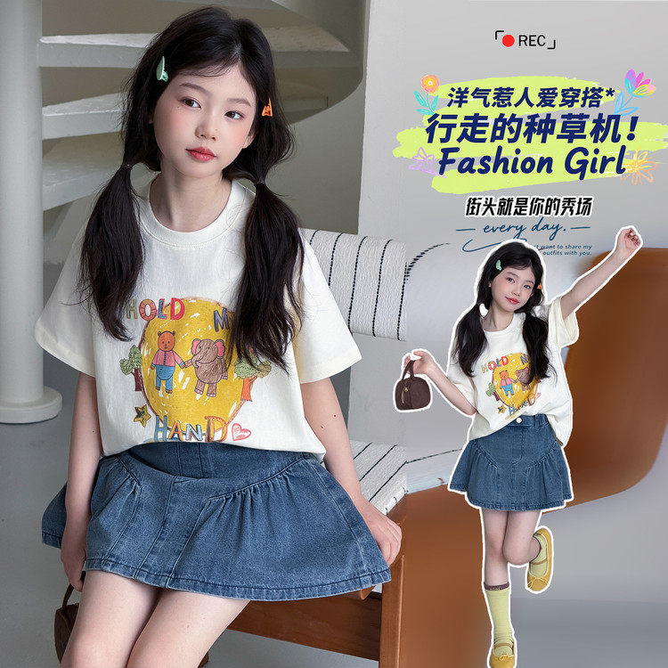韩版女童夏季卡通印花两件套洋气牛仔裙短袖上衣套装