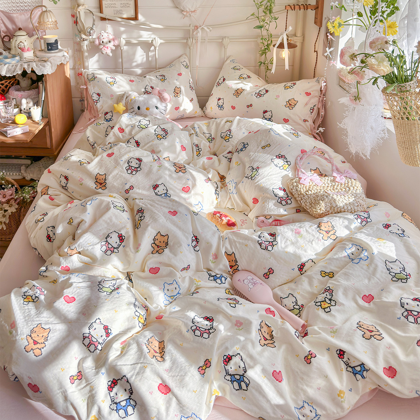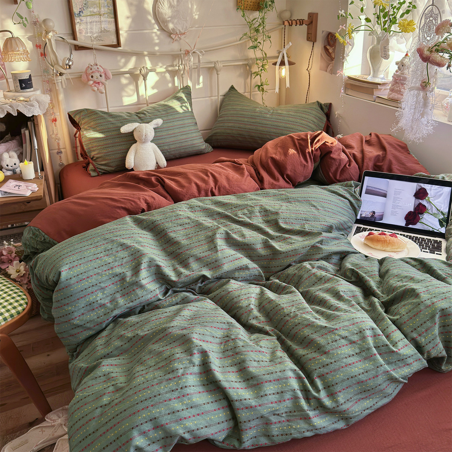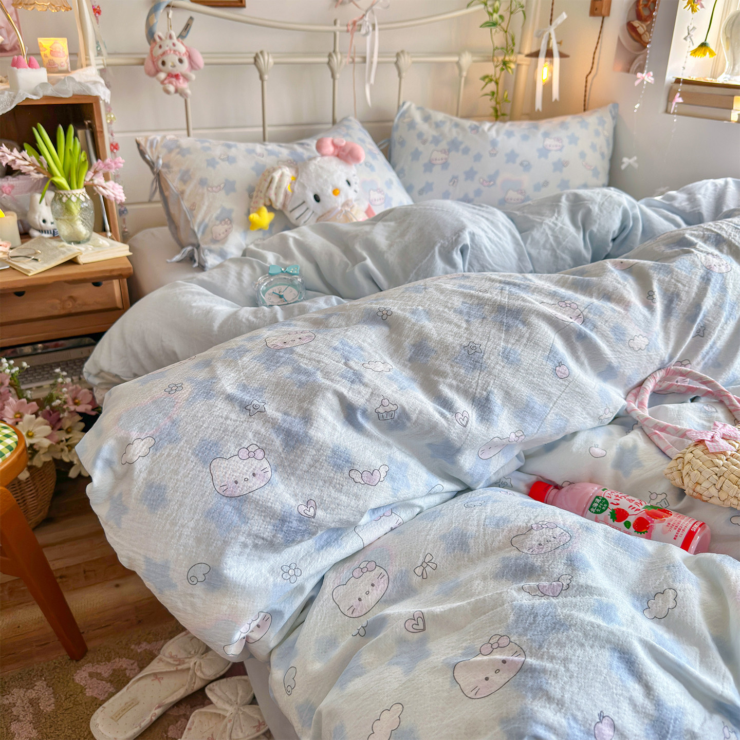 化纤面料防螨宿舍三件套床单款床笠款单被套云感双层纱四件套
