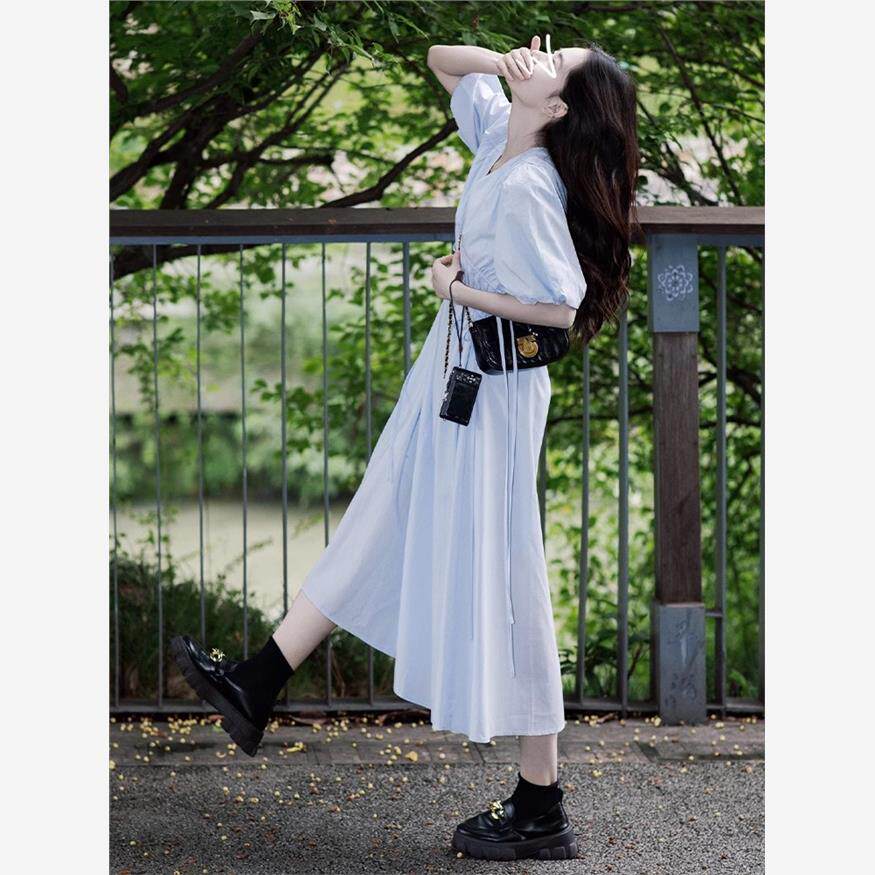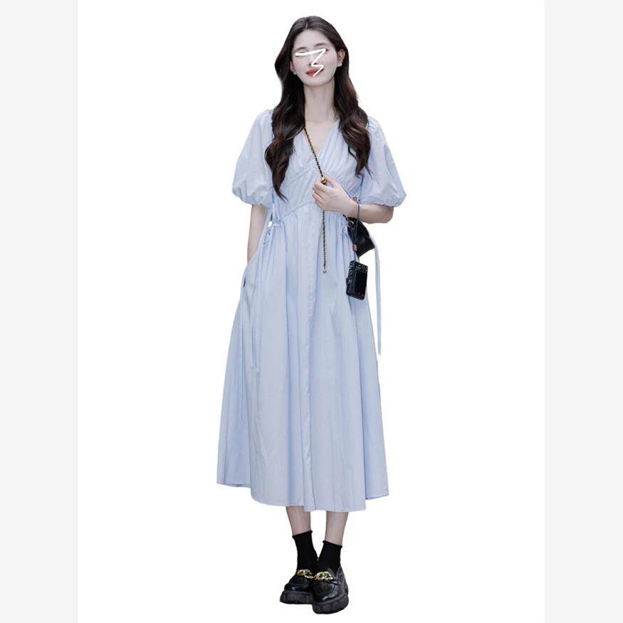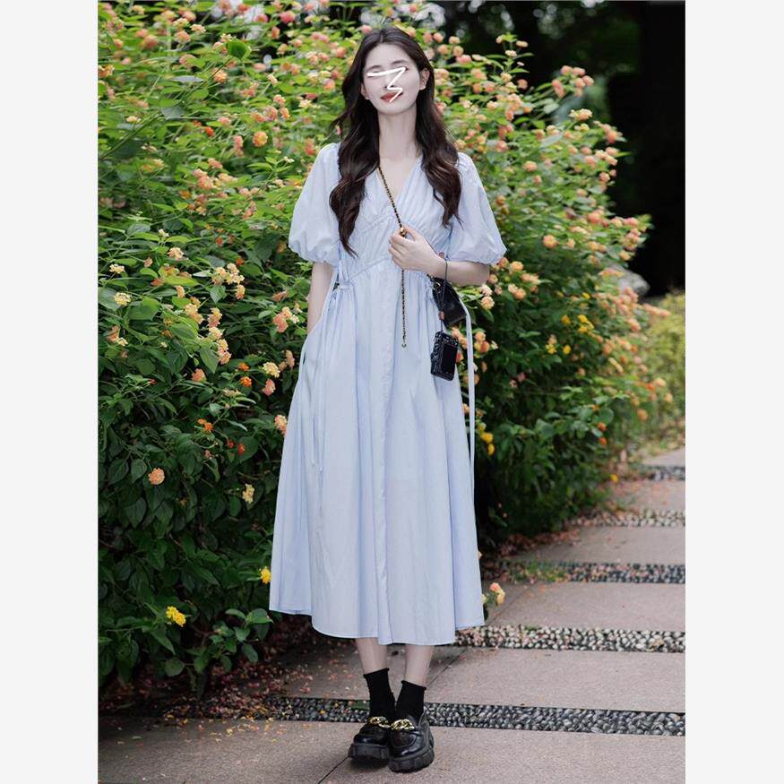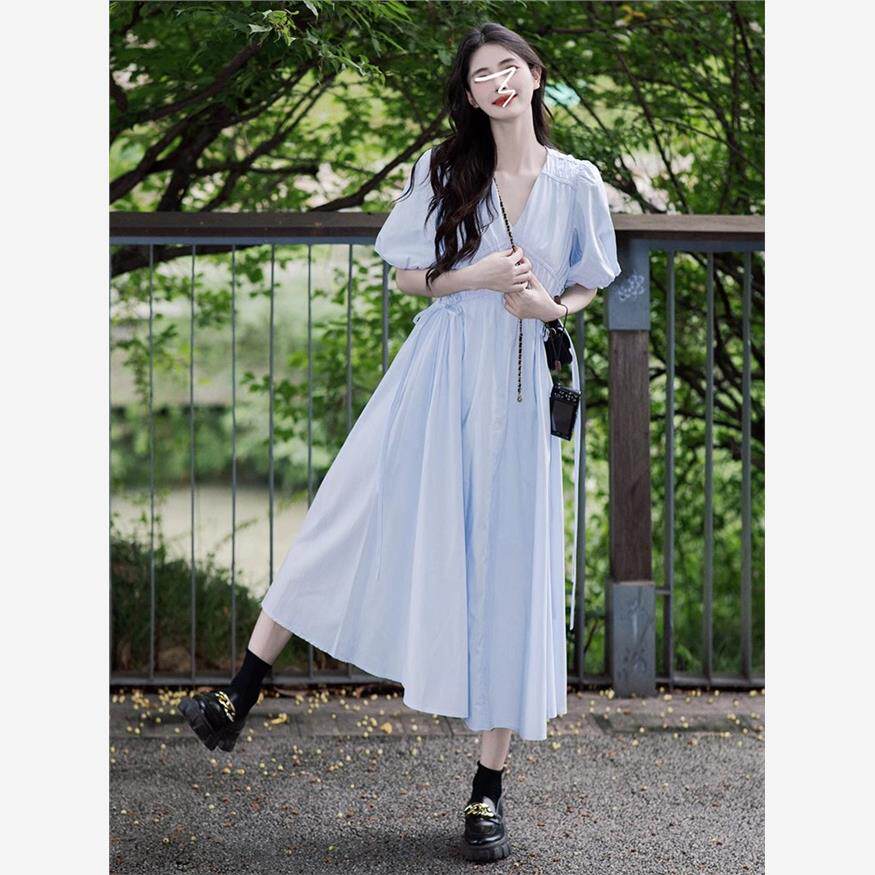 法式茶歇蓝色泡泡袖连衣裙女夏季新款大码胖mm收腰气质超好看长裙
