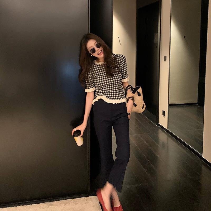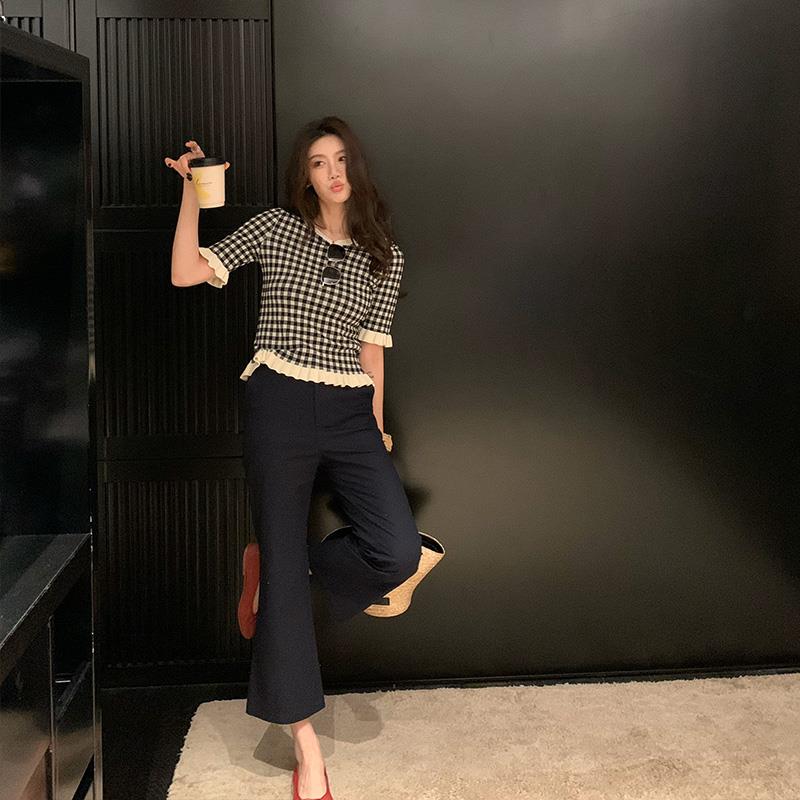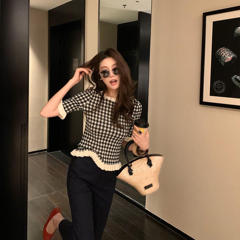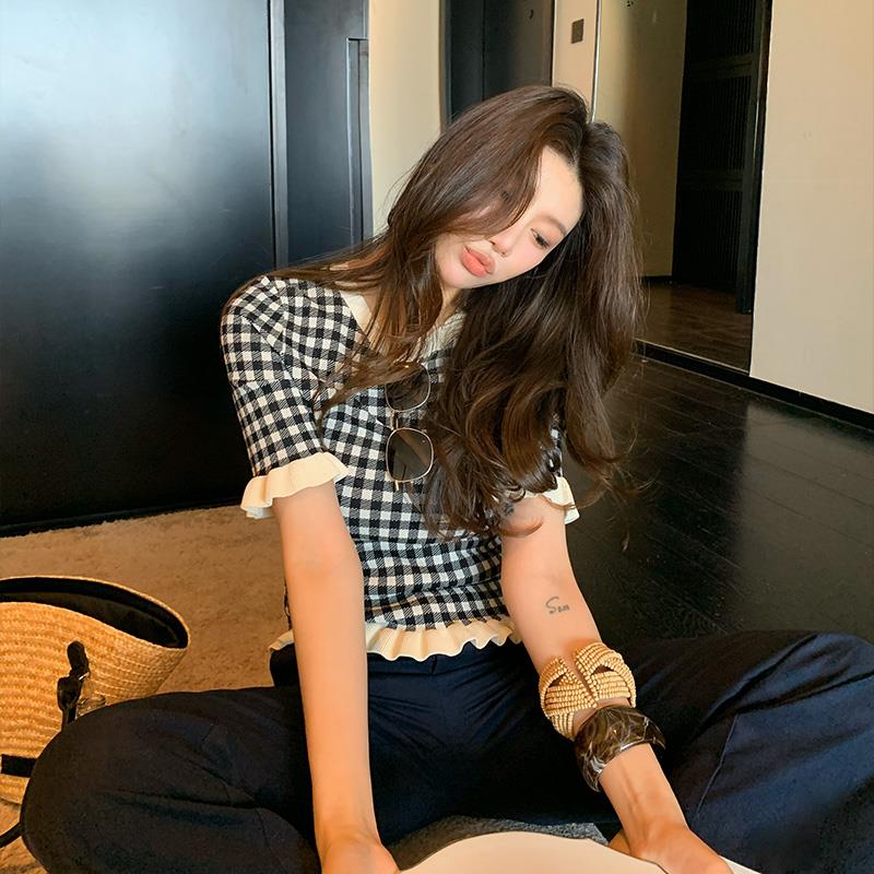 龙喜儿复古黑白格子软糯针织毛衫女春夏装2025新款荷叶边短袖上衣