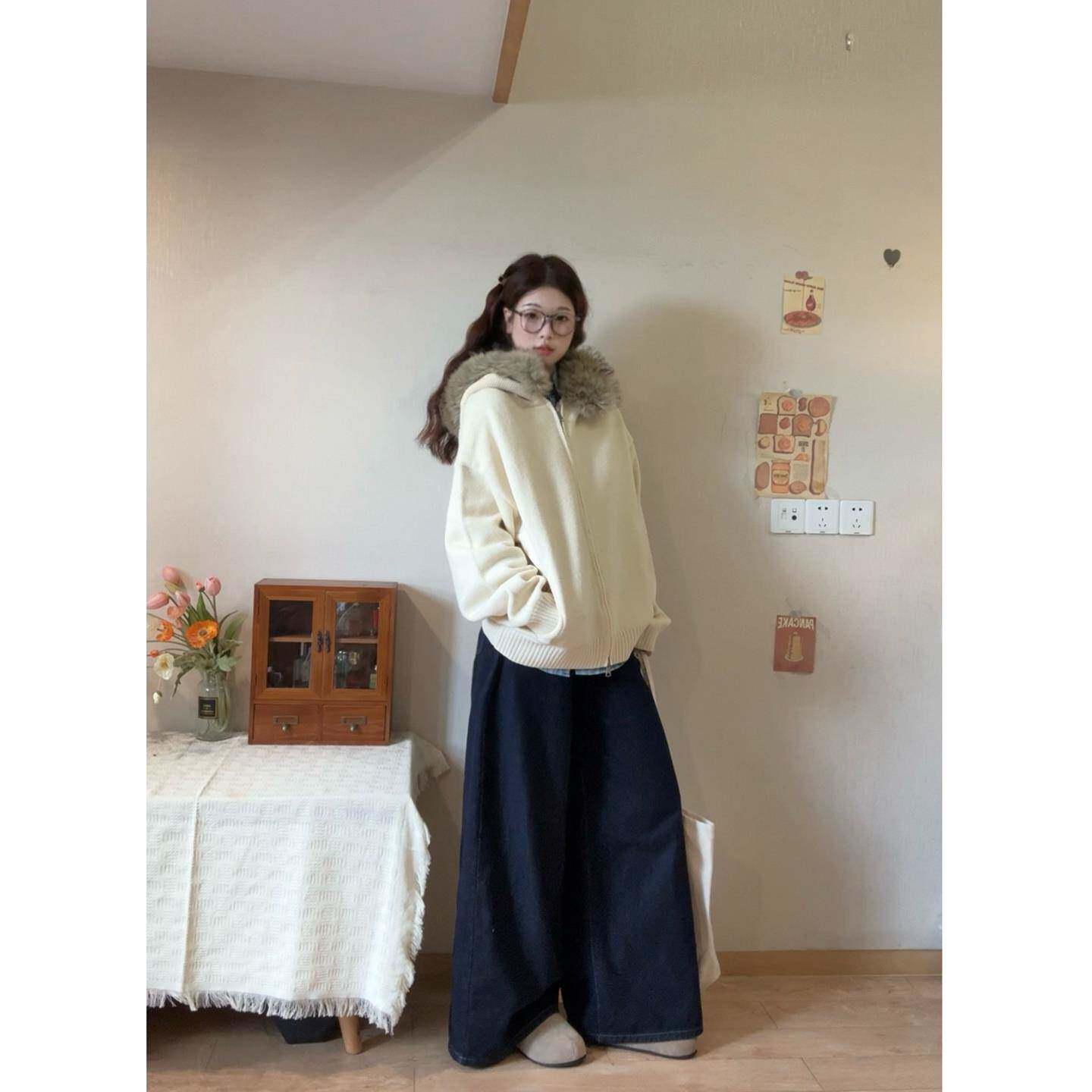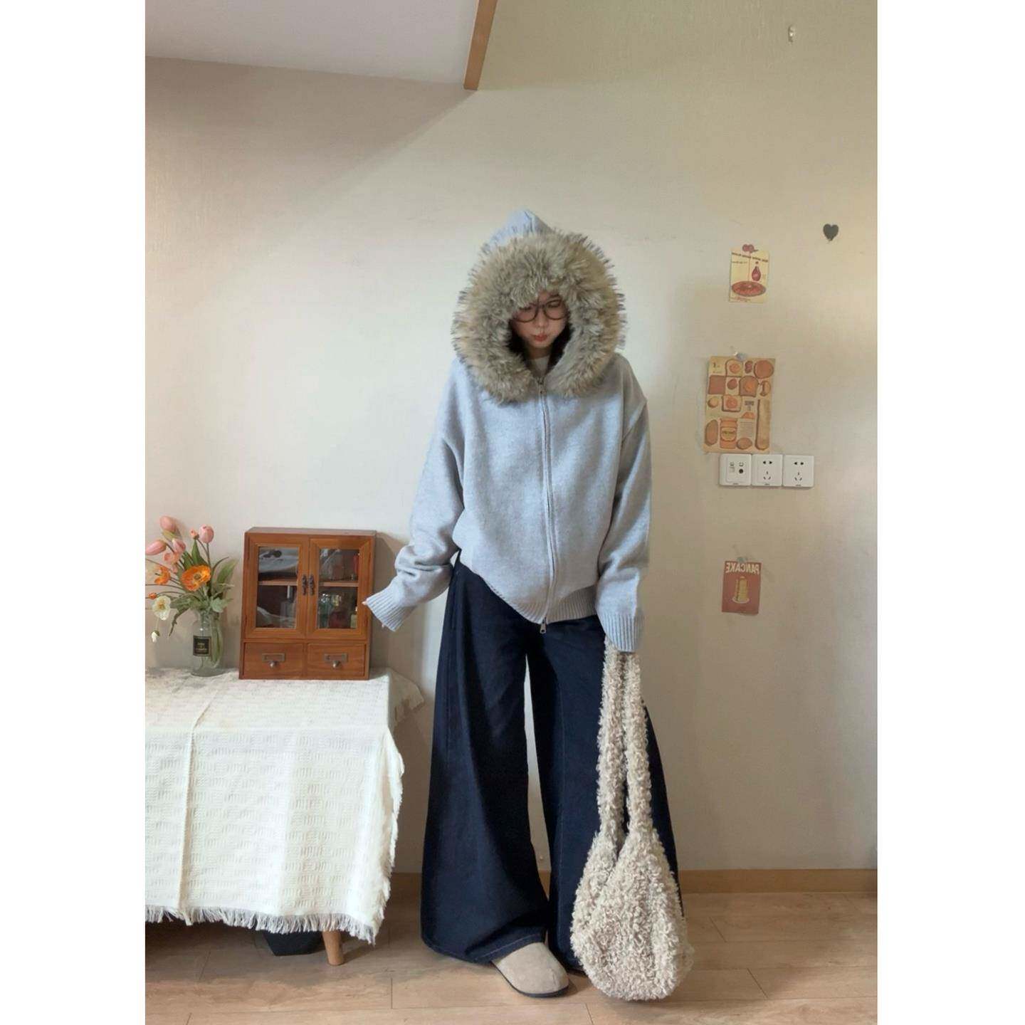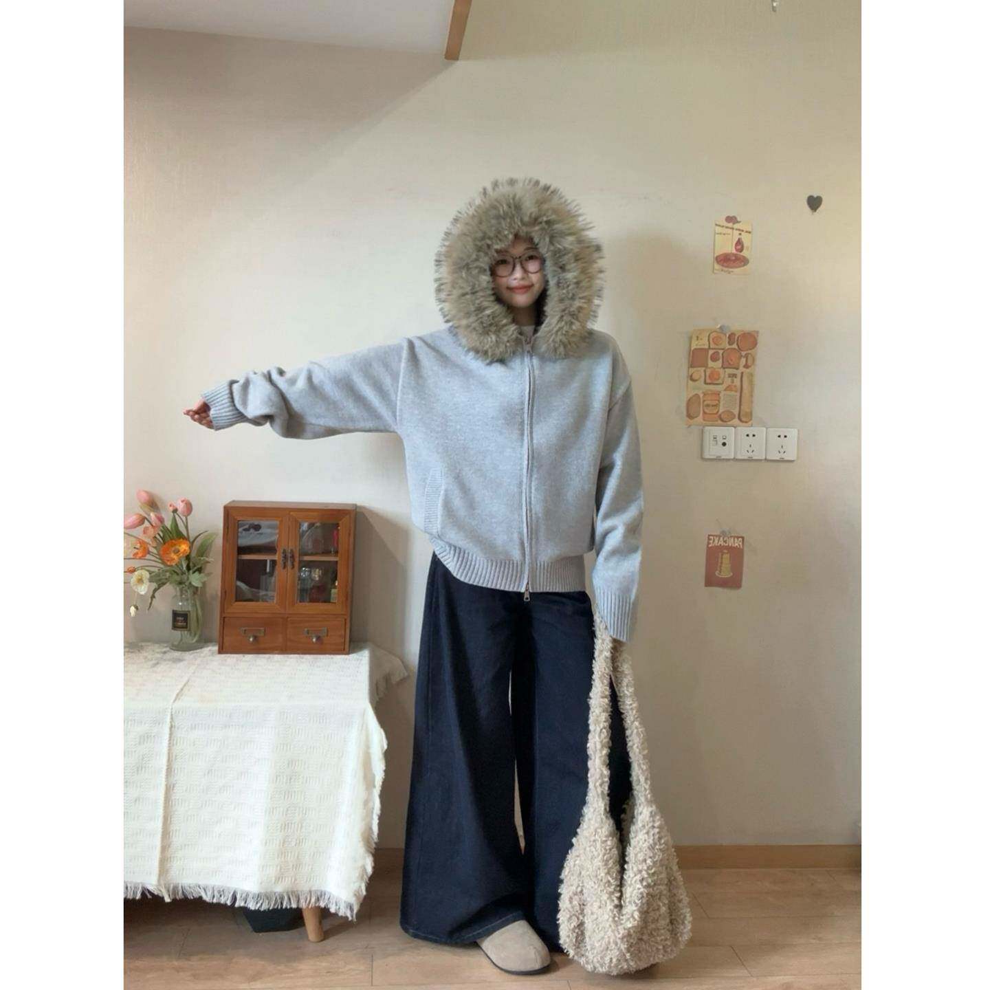 赫度 慵懒高级感毛衣开衫女2025秋冬韩版小个子软糯宽松毛领外套