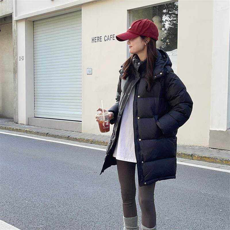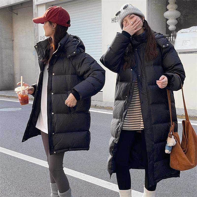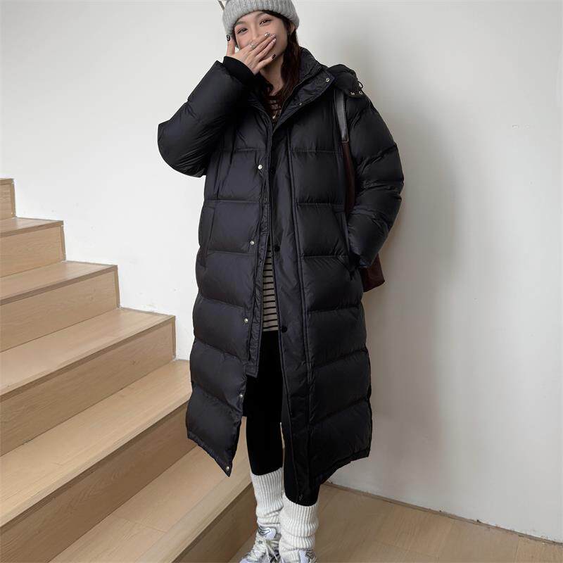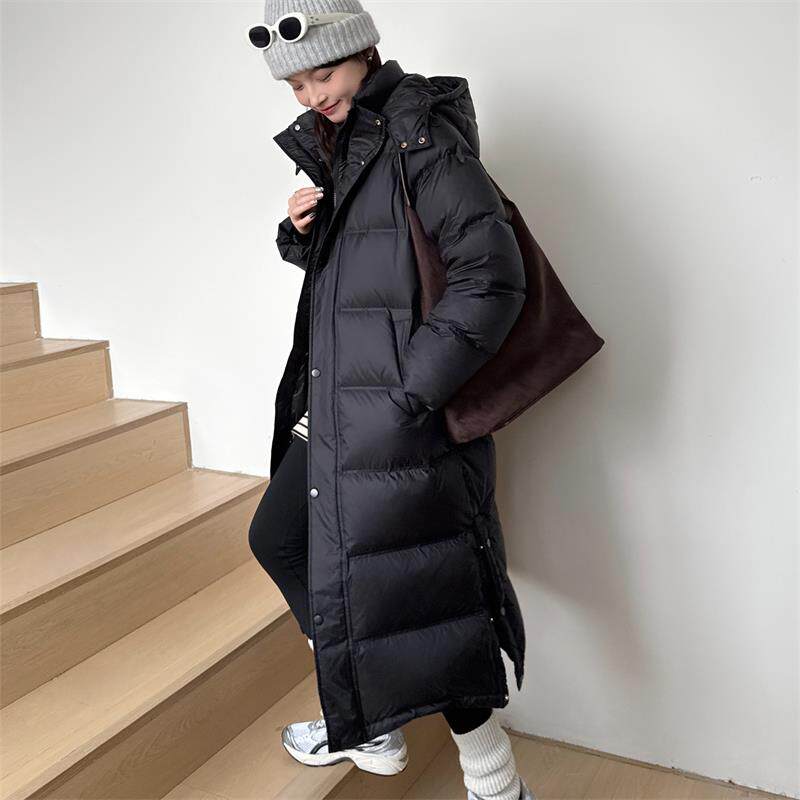 简约通勤黑色羽绒服女中长款2024新款冬装白鸭绒宽松过膝外套加厚