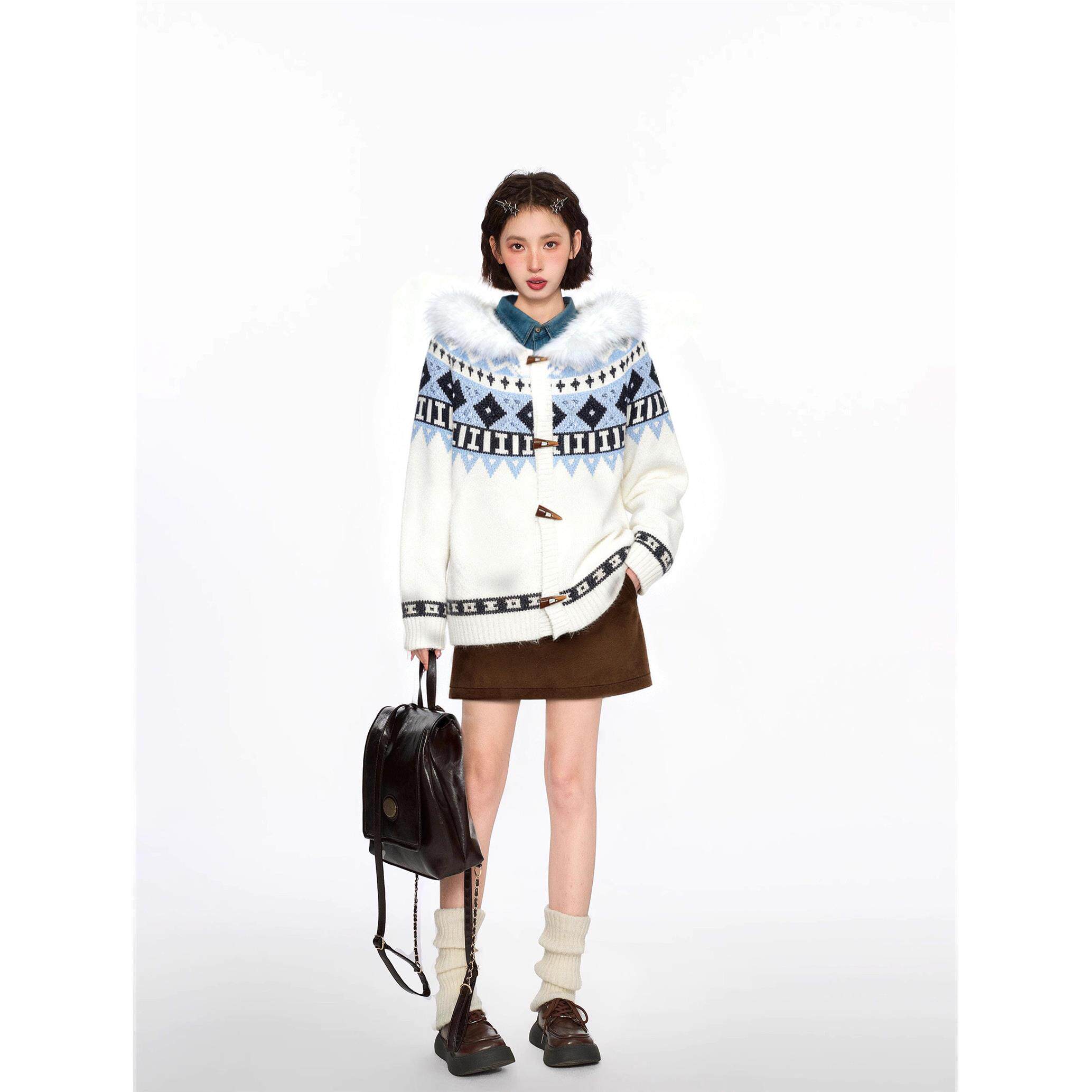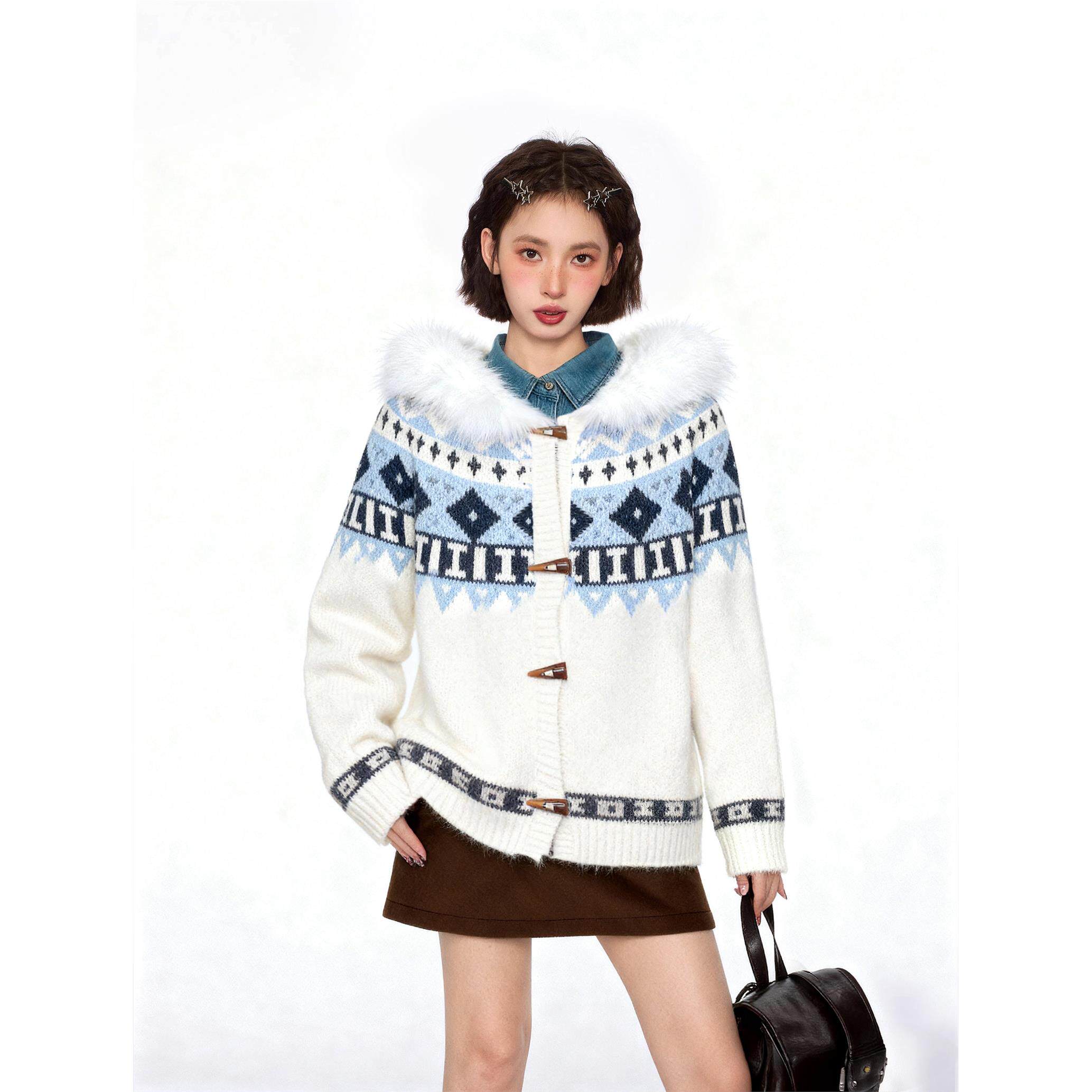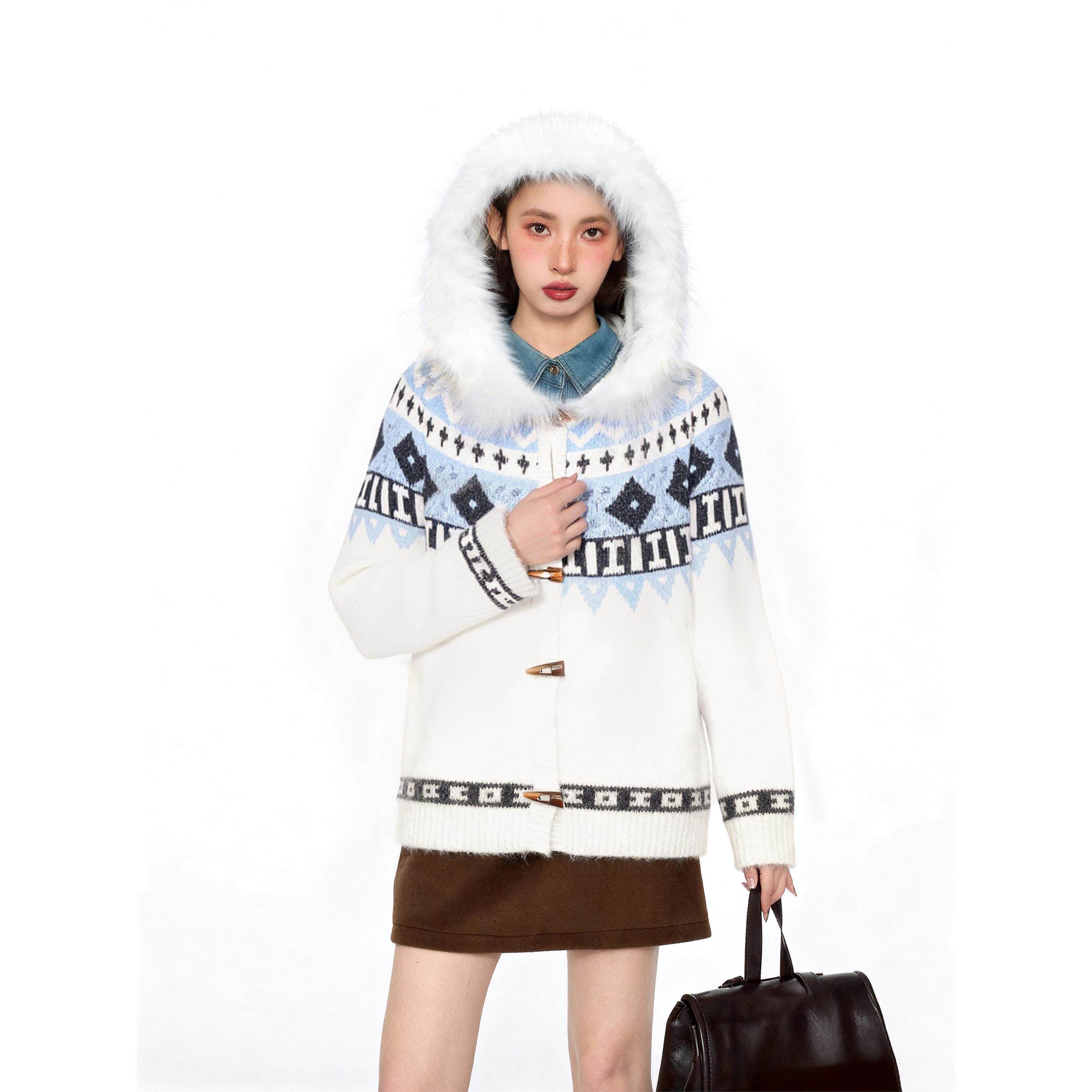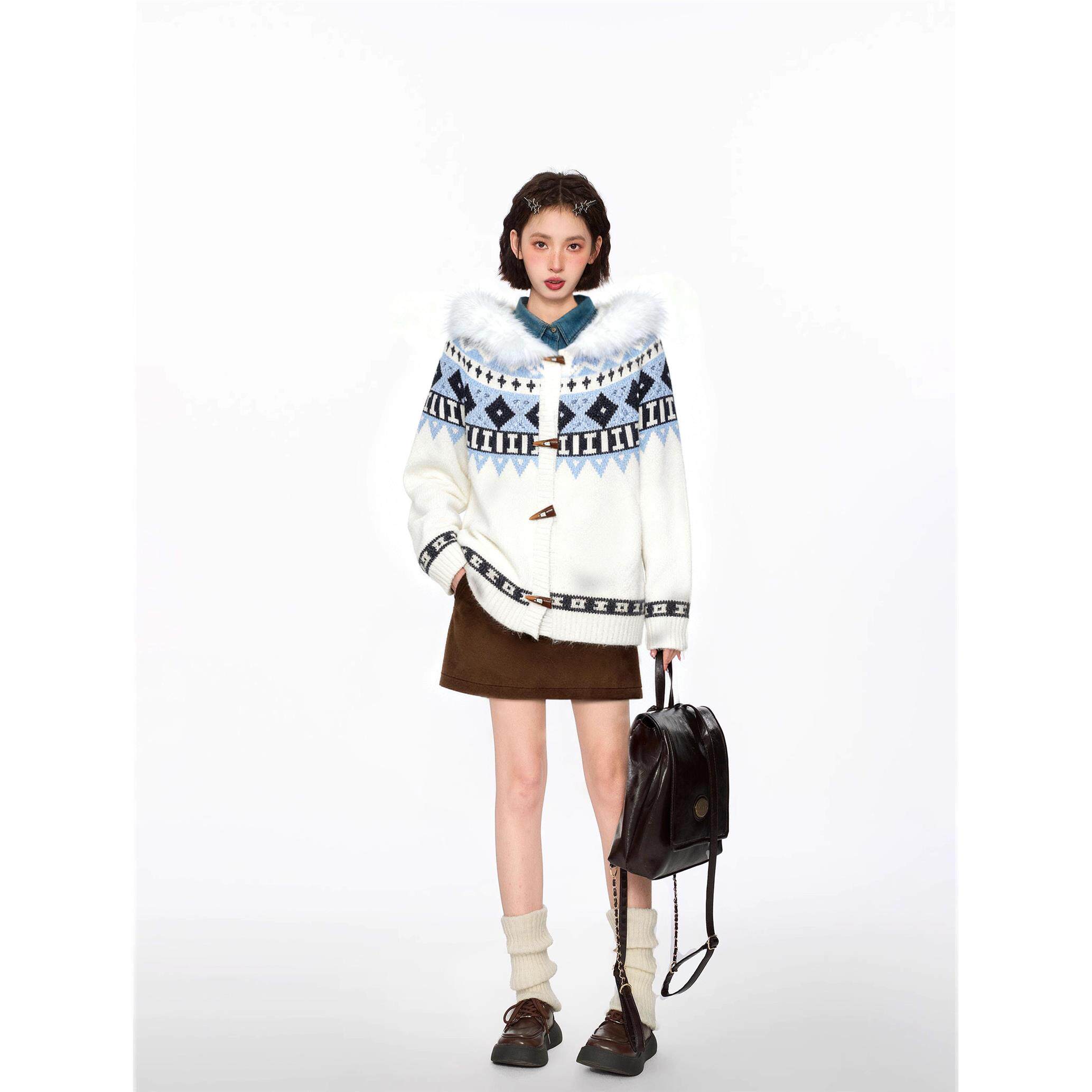 白色费尔岛牛角扣毛领连帽针织毛衣外套女秋冬季宽松慵懒加厚开衫
