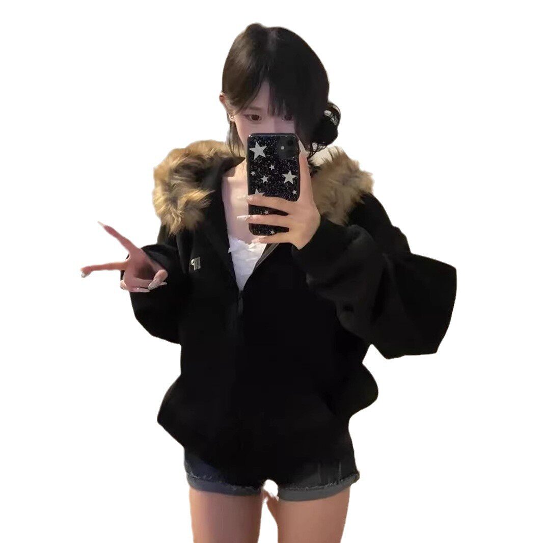 美式复古潮牌毛领拉链开衫连帽卫衣女秋冬季情侣高级感休闲外套潮