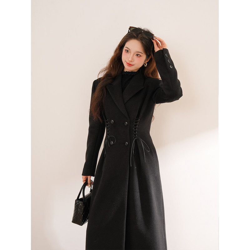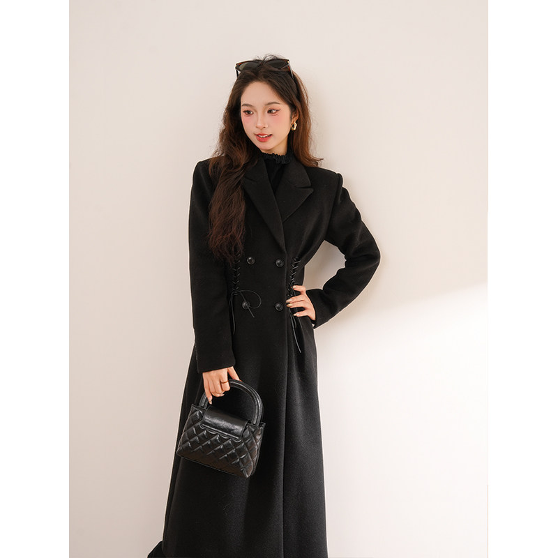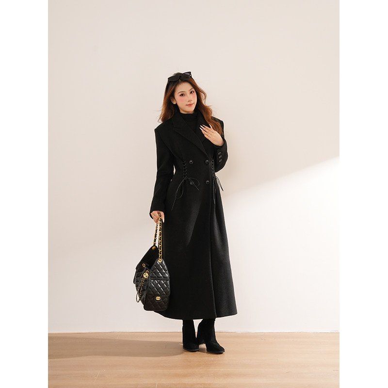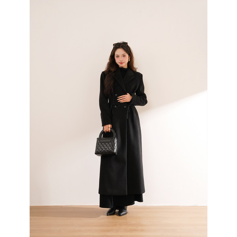 巴黎香颂 气质感留洋大小姐超模收腰绑带双排扣长款毛呢大衣外套