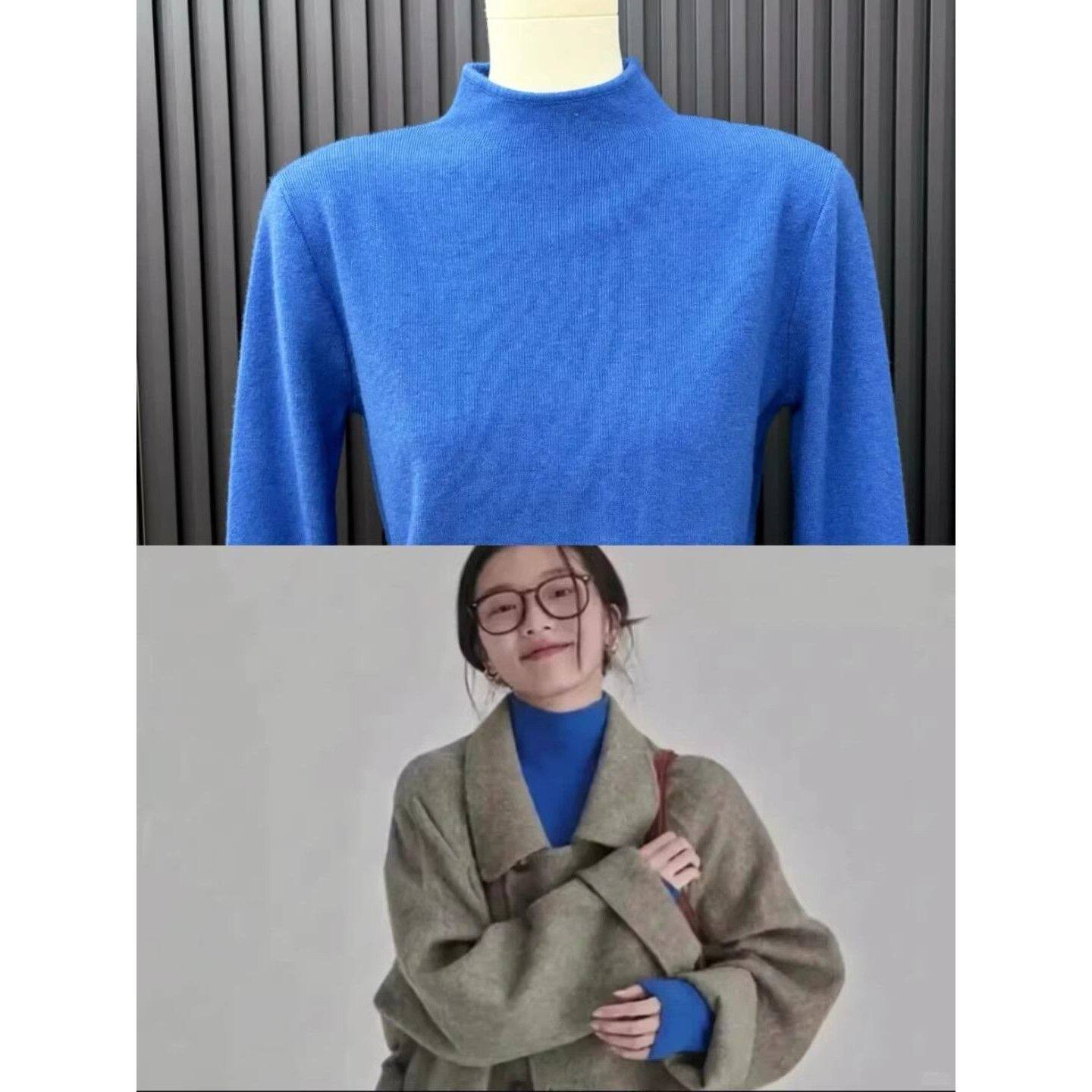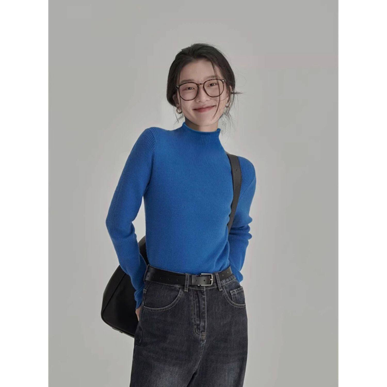 克莱因蓝半高领奶fufu针织长袖打底衫女秋冬季内搭修身高级感毛衣