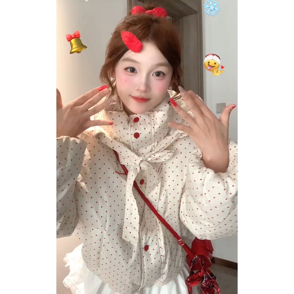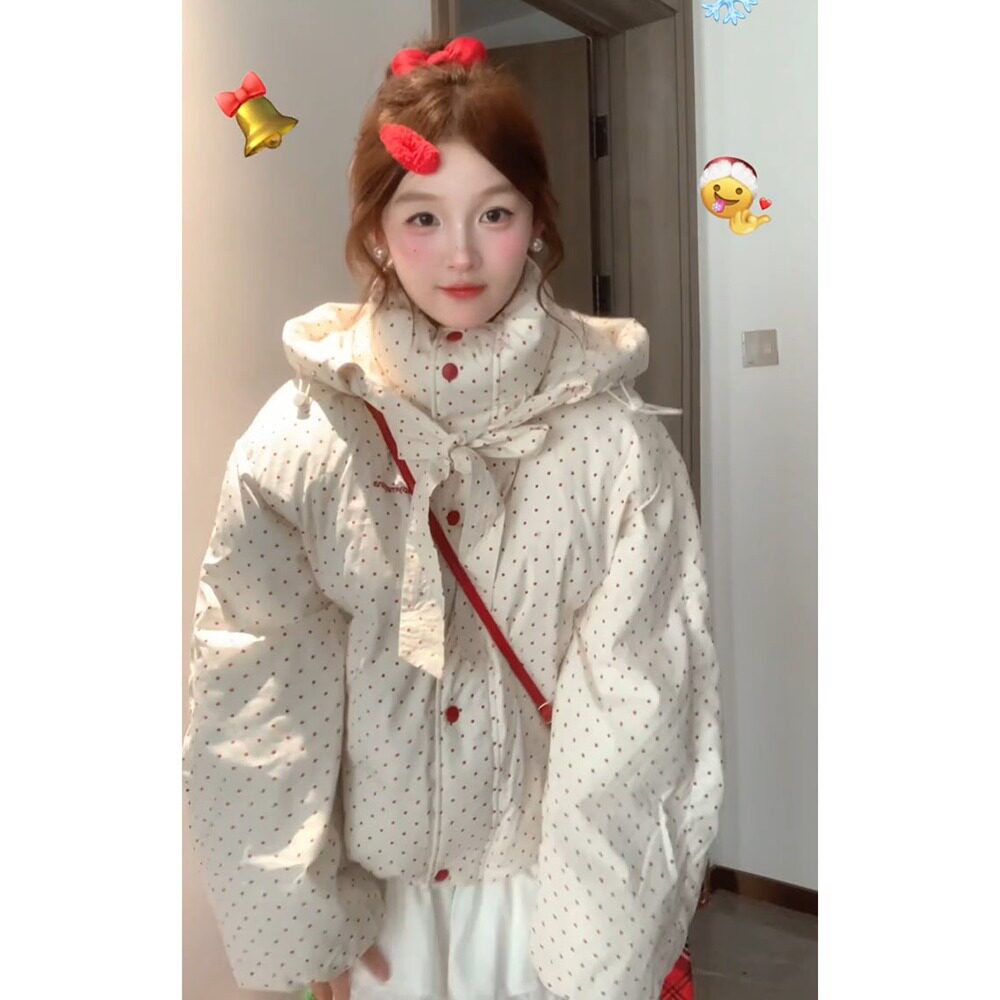 日系学院风彩色波点连帽棉服外套女冬季新款加厚保暖面包服棉衣