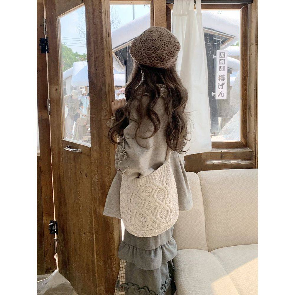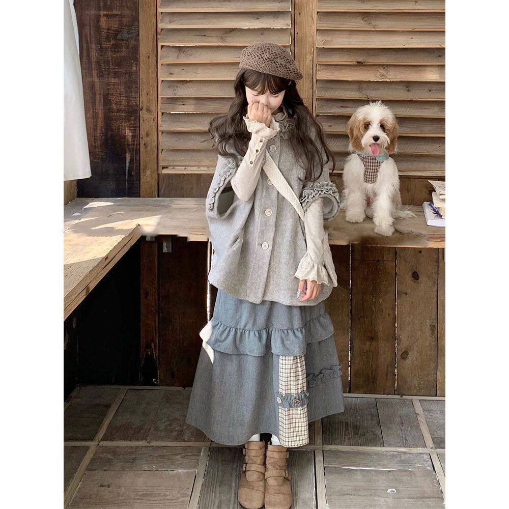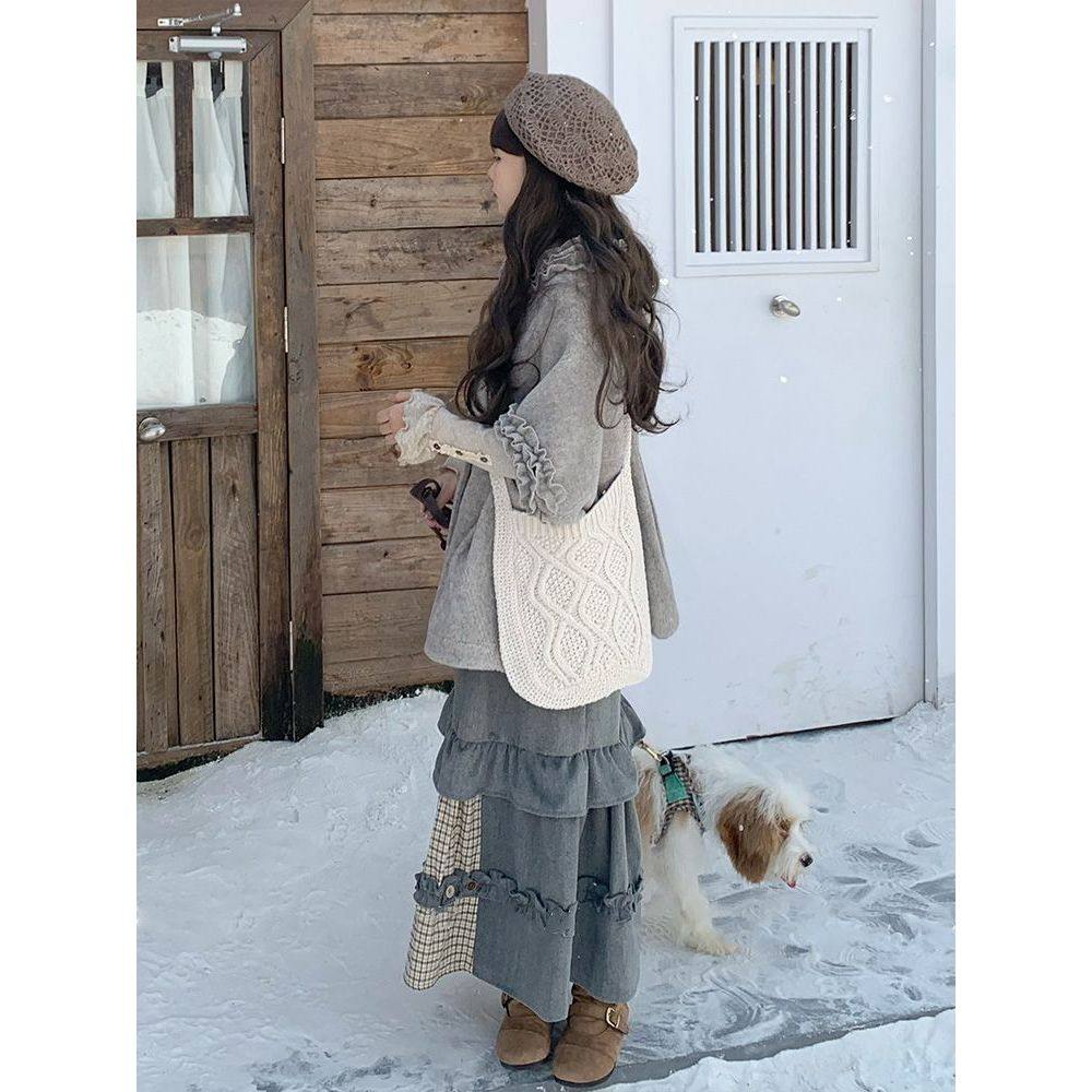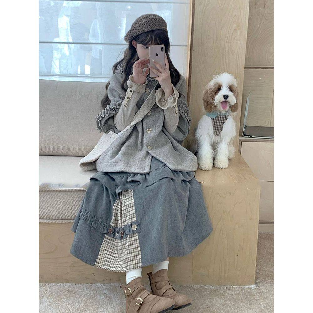 冬季复古套装文艺卷边设计感罩衫+打底衫+灰色拼接半身裙三件套装