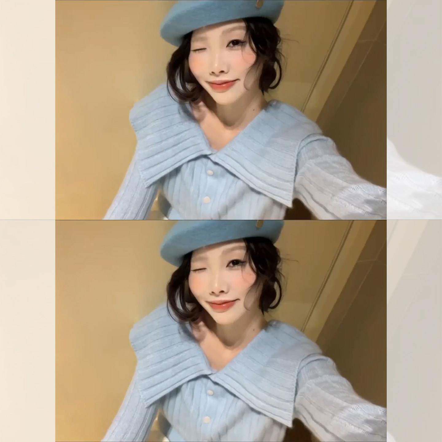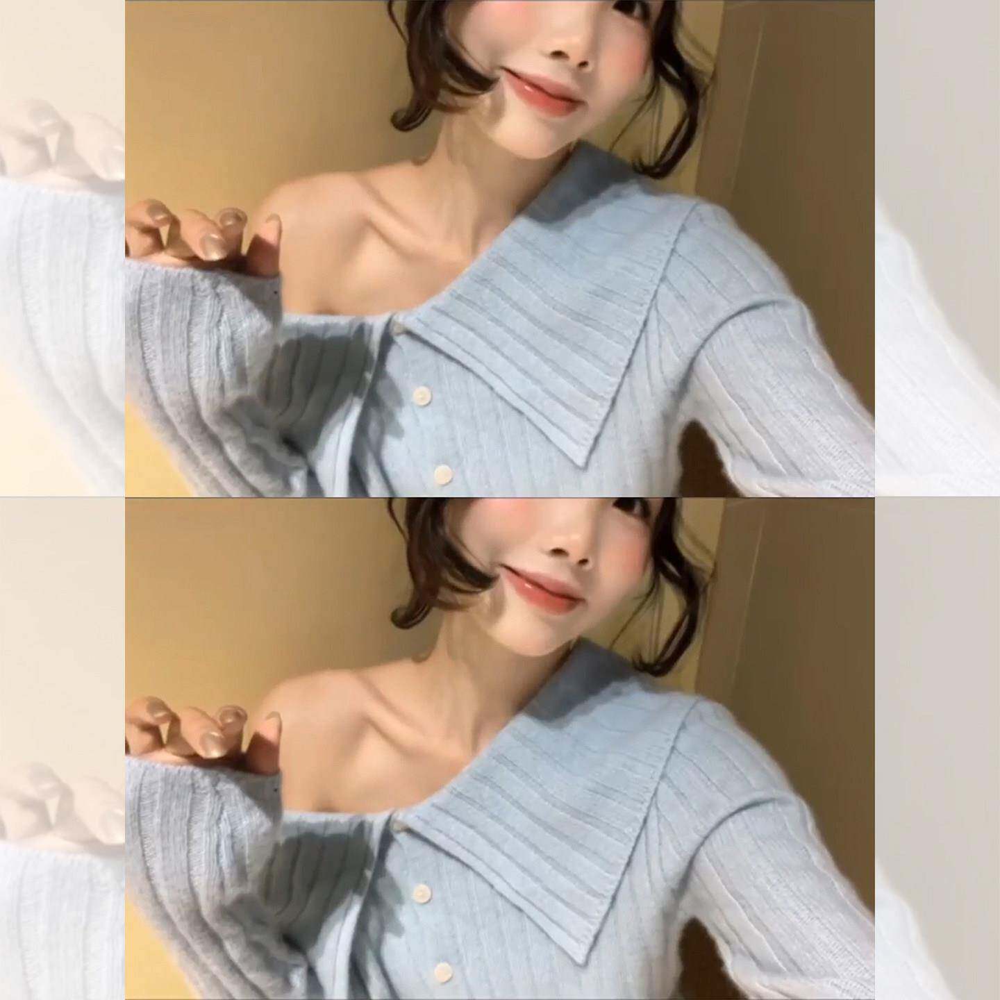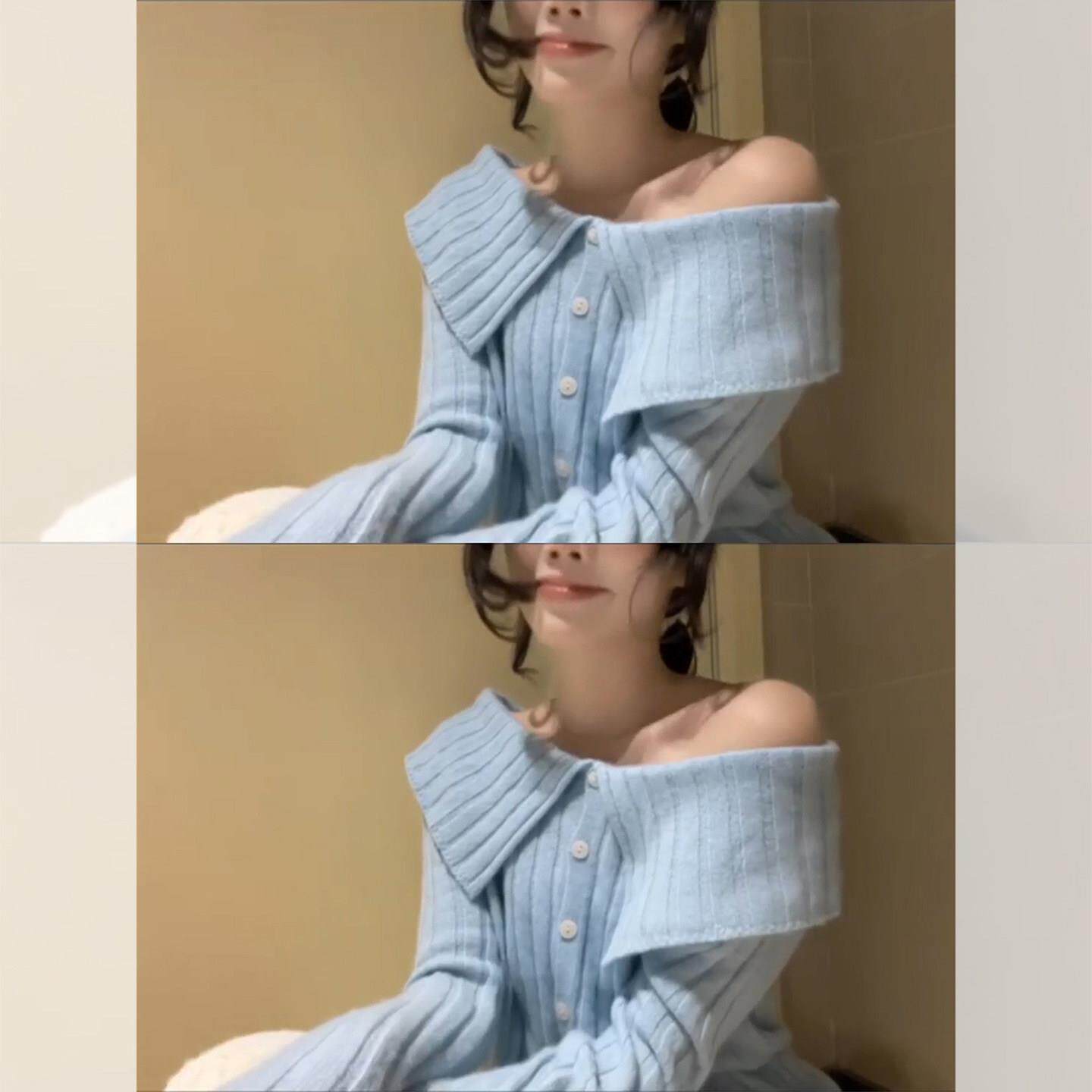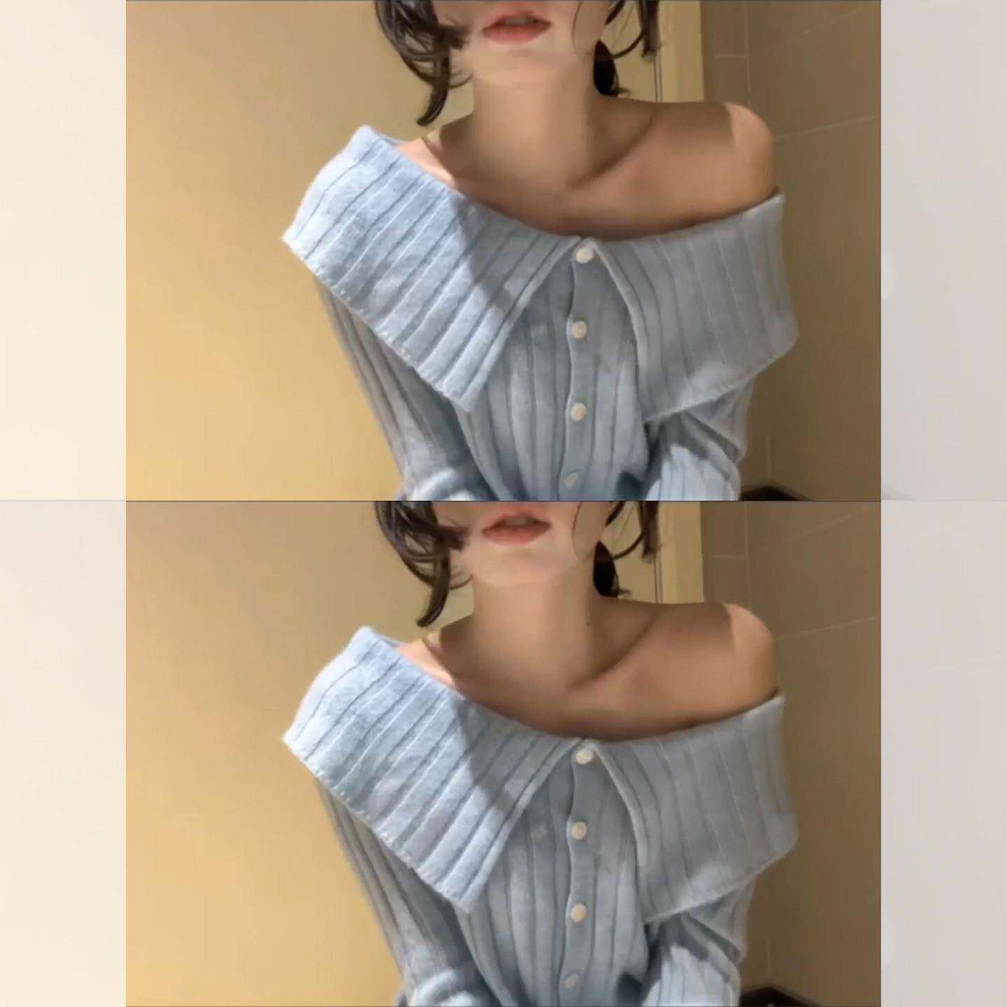 韩系漂亮蓝色一字肩针织打底衫女秋冬独特超好看毛衣内搭短款上衣