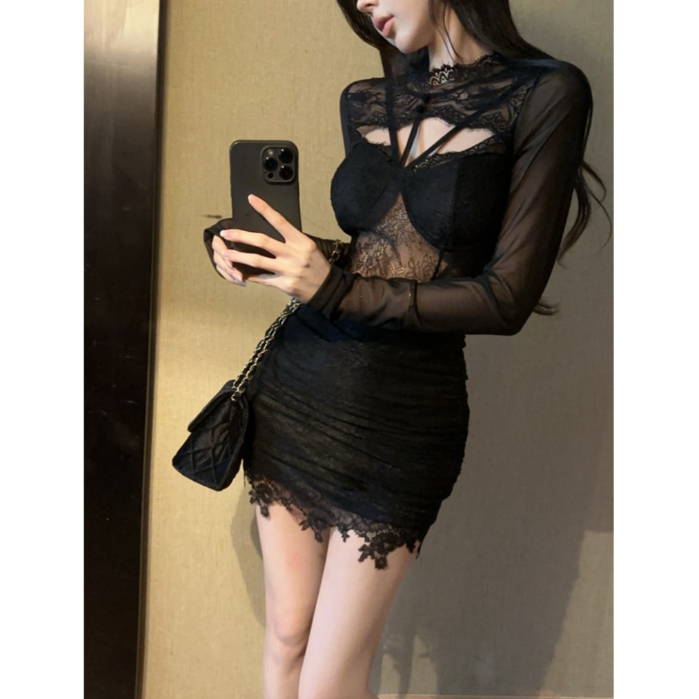 实拍蕾丝性感辣妹镂空御姐拼接网纱收腰包臀连衣裙实价