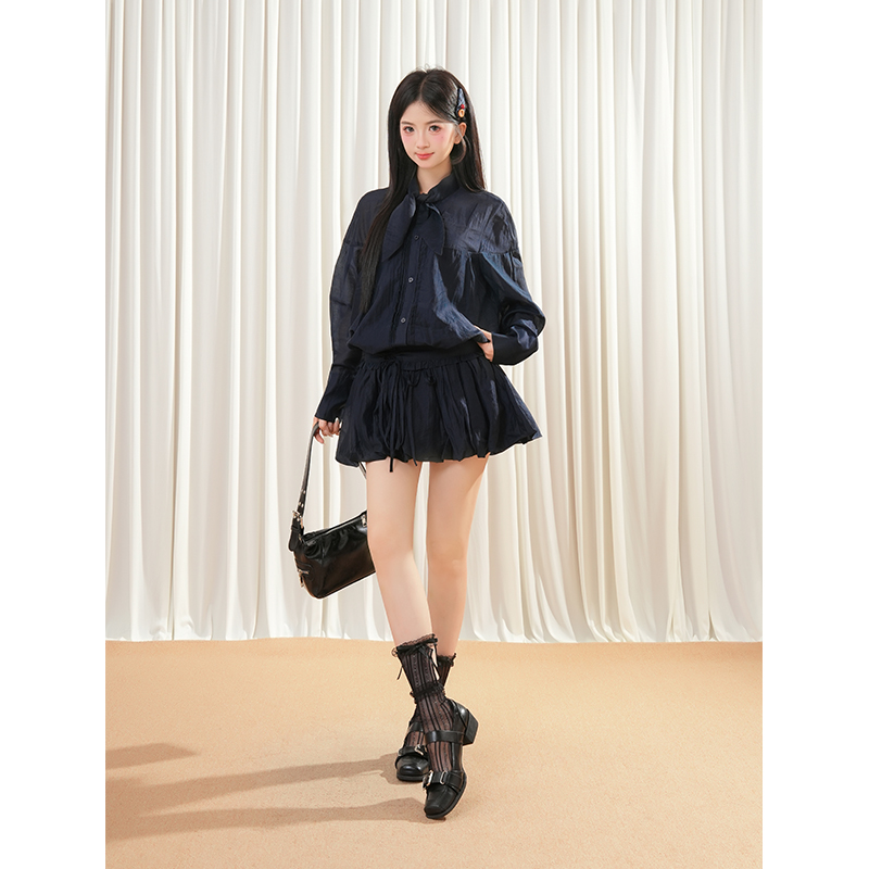 法式设计感深蓝色长袖衬衫连衣裙2025秋季新款收腰显瘦仙女短裙