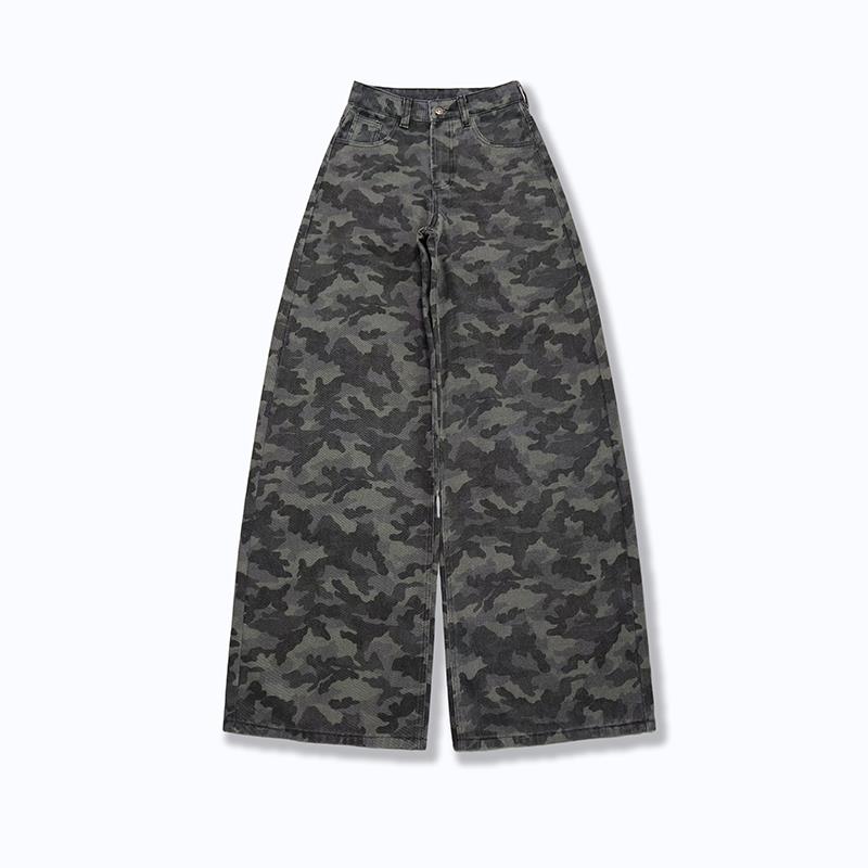美式高街复古迷彩工装牛仔裤女高腰显瘦垂感宽松阔腿休闲直筒裤子