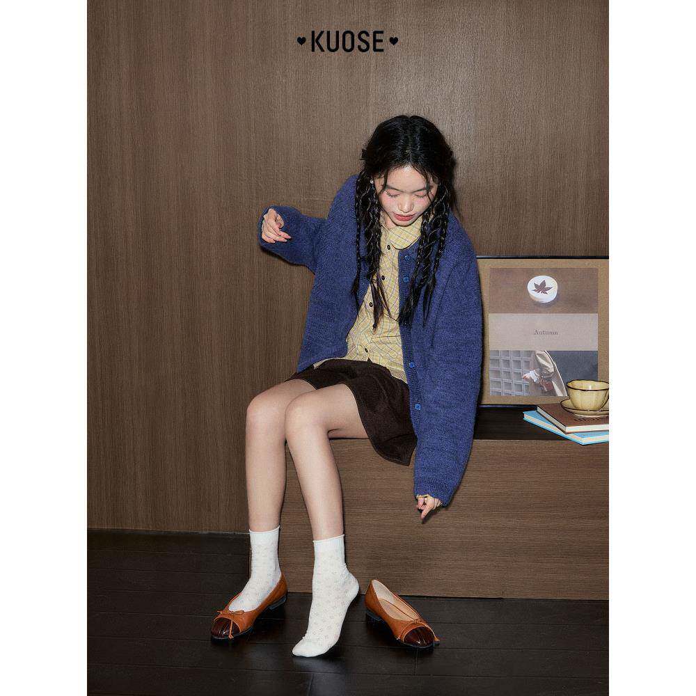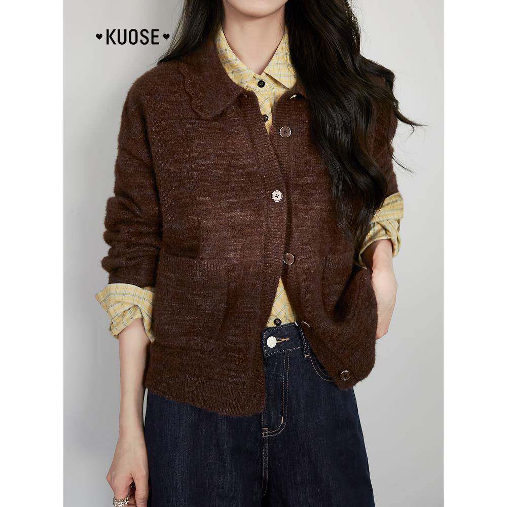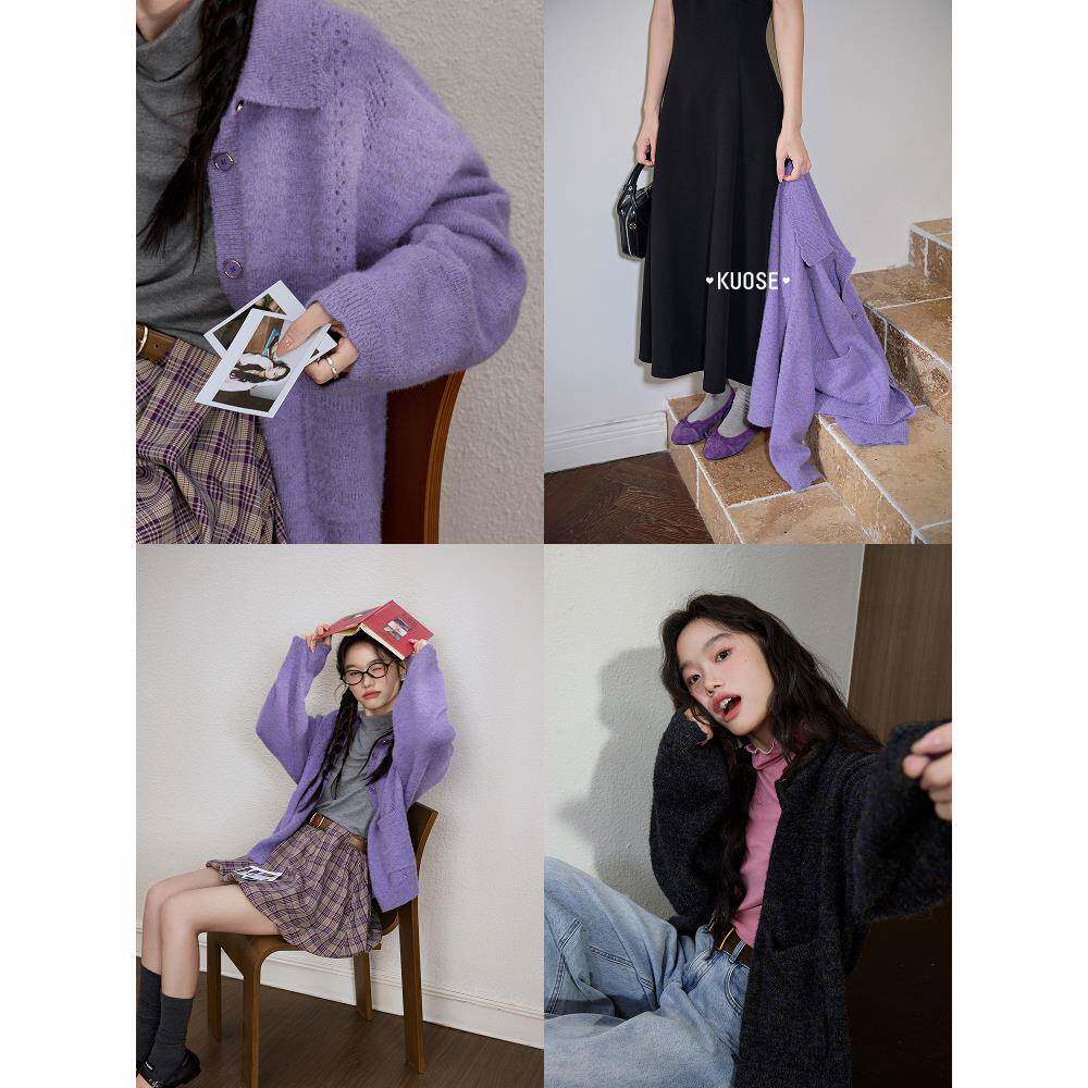 阔色慵懒风灰色针织开衫外套上衣女2025秋冬季新款蓝色翻领毛衣
