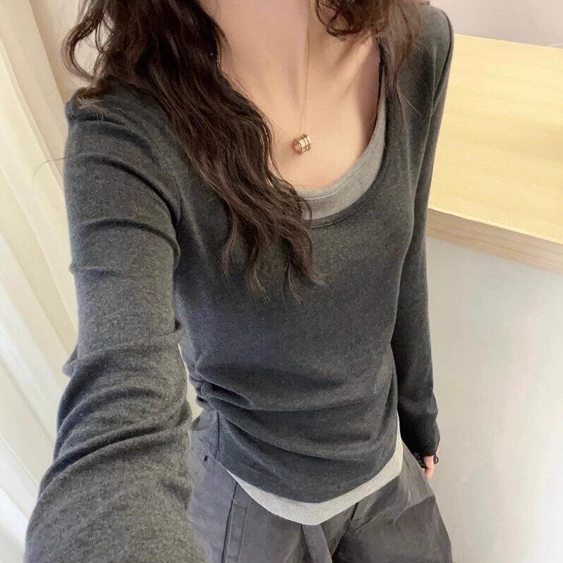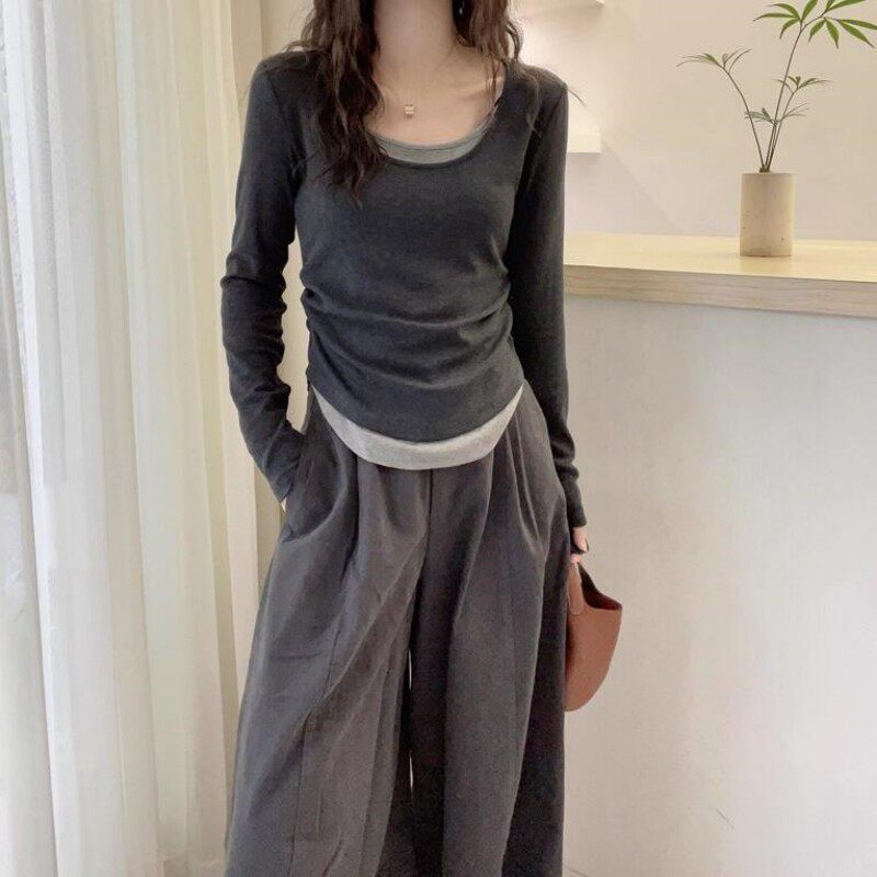 撞色拼接圆领长袖T恤女秋洋气假两件褶皱修身打底衫时尚气质上衣