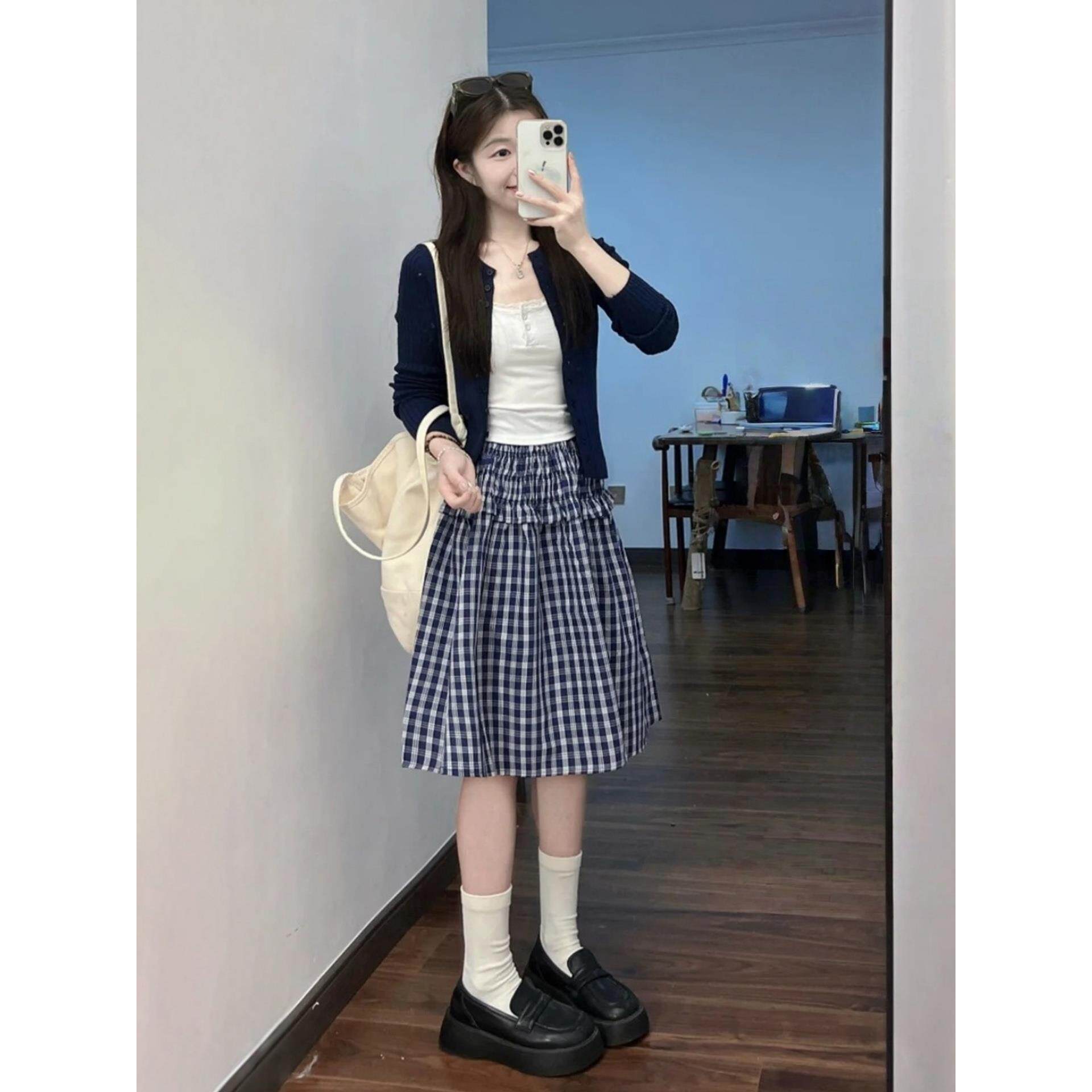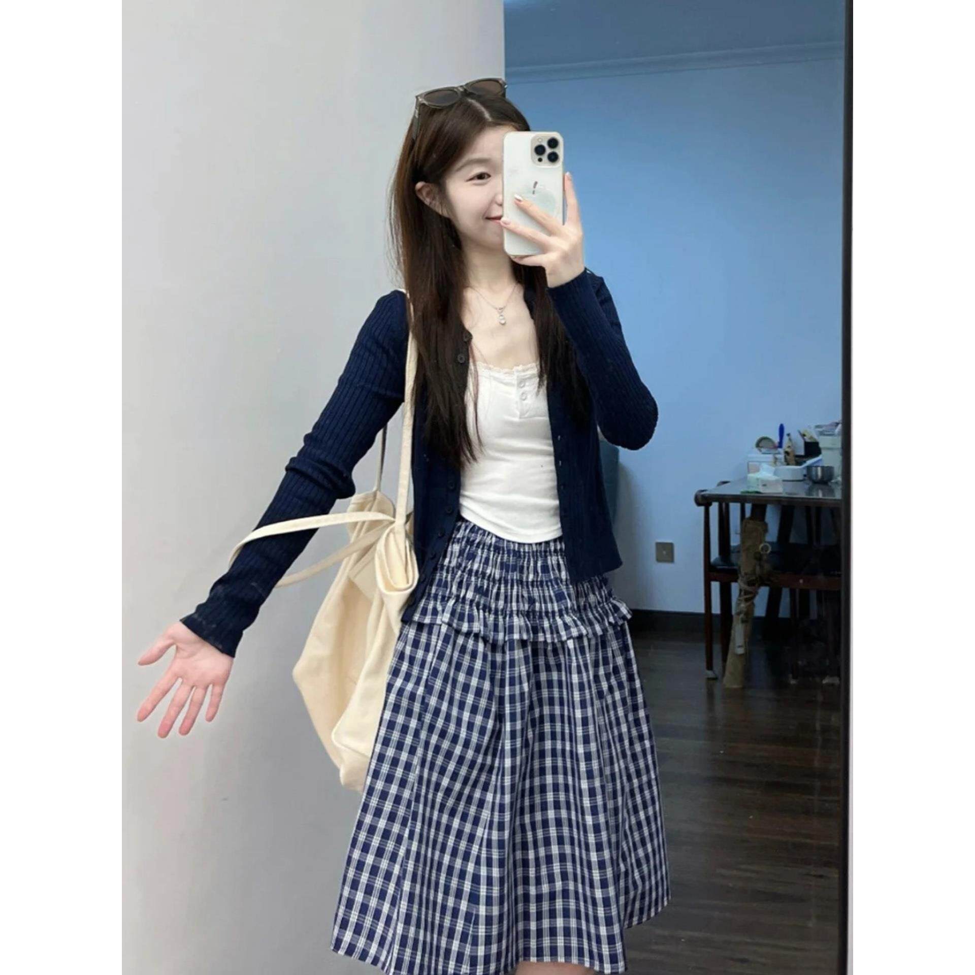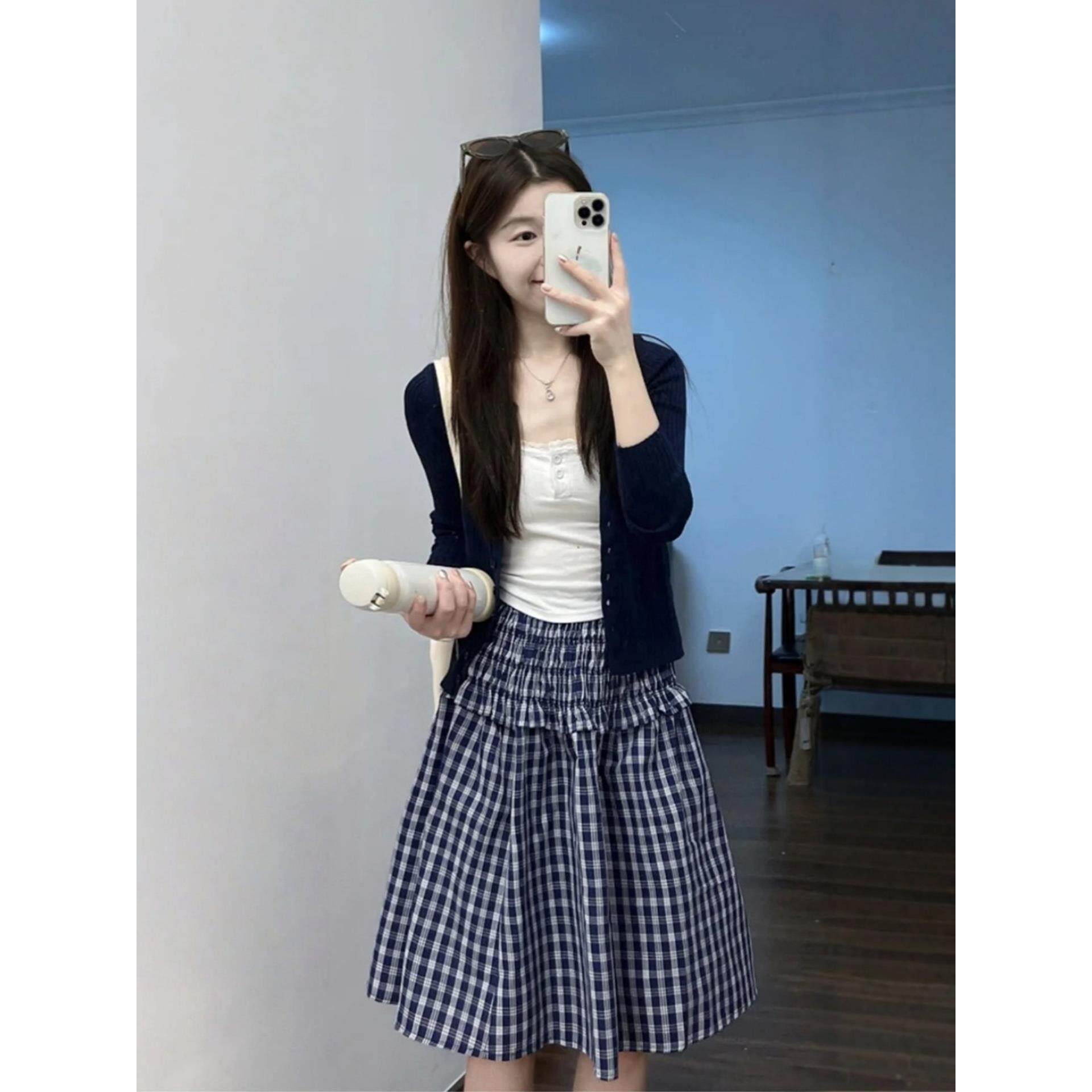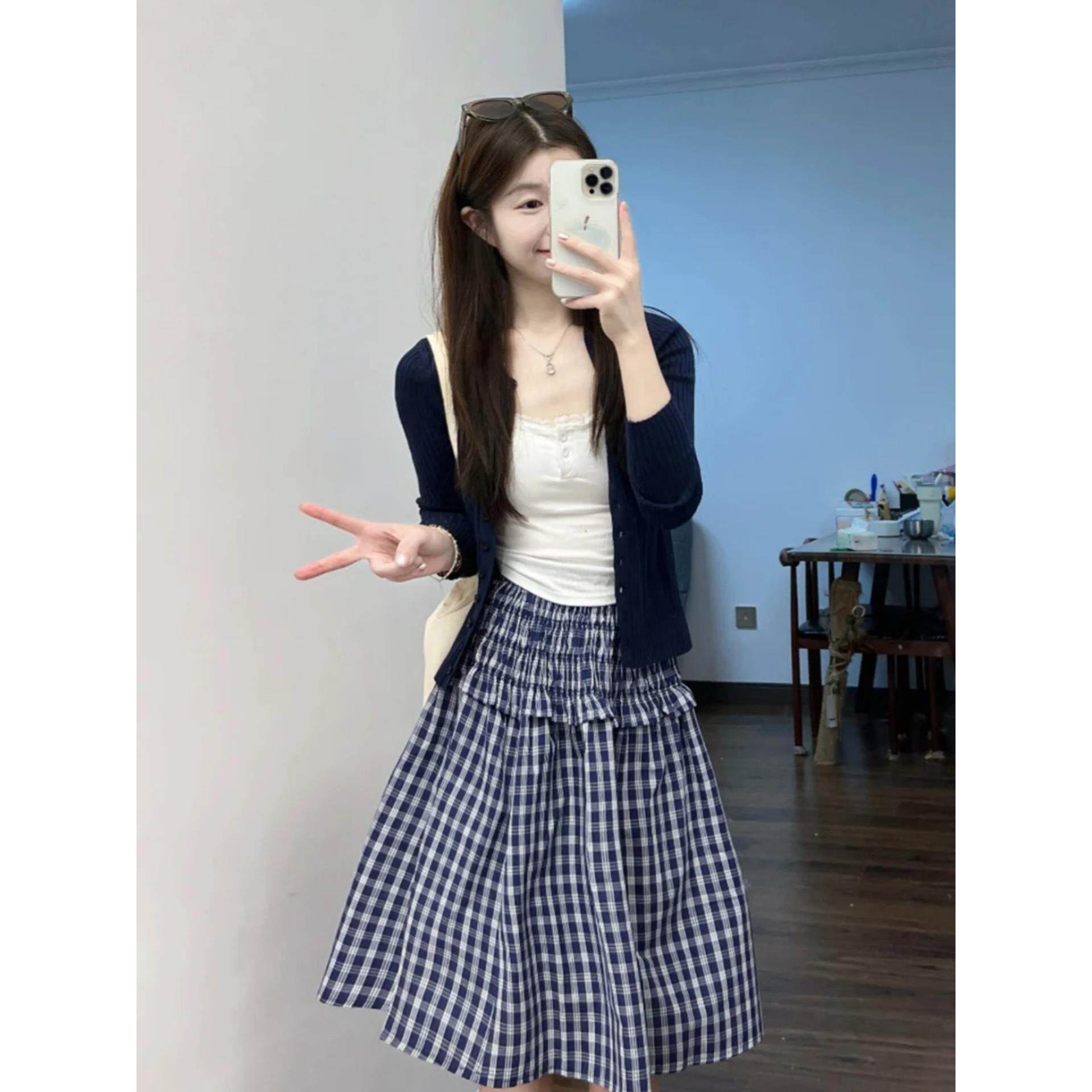 格子连衣裙女2025年秋季新款特别漂亮掐腰小裙子针织吊带三件套装