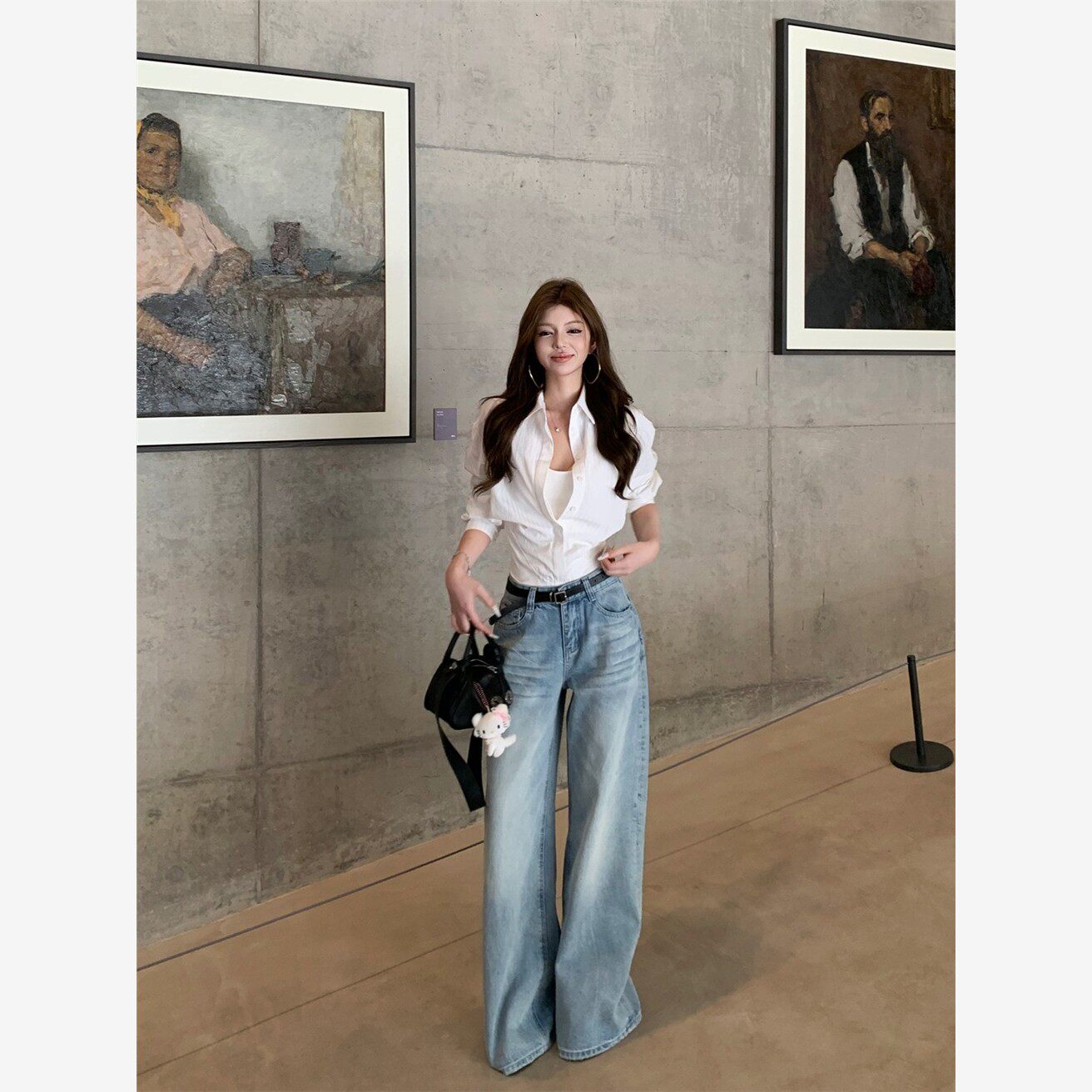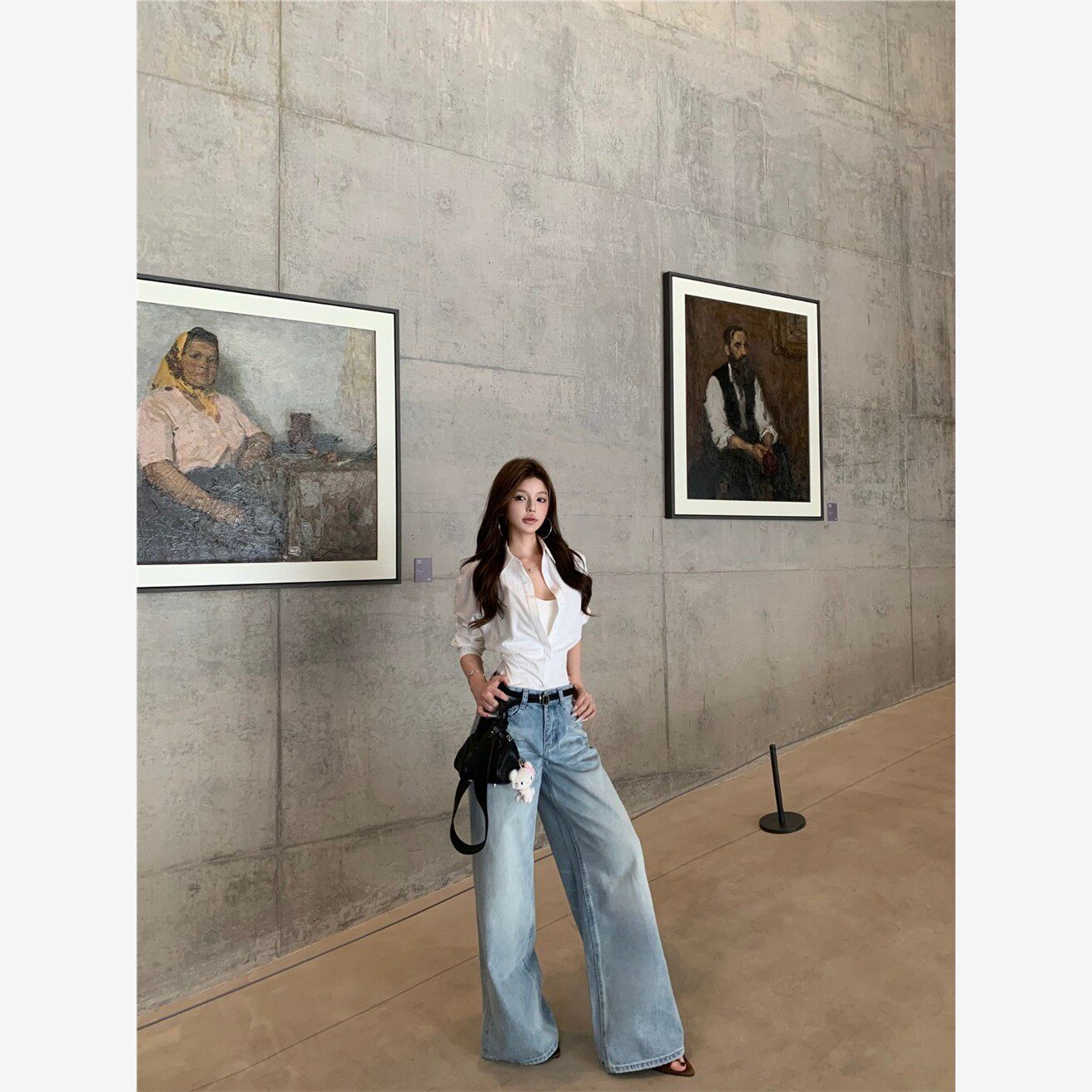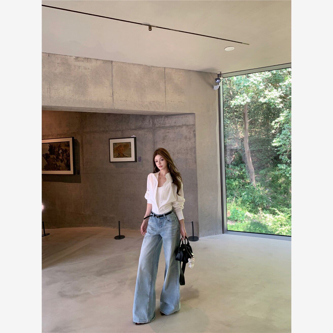 拼接设计假两件收腰长袖连体衬衫女秋季覆古宽松直筒牛仔裤两件套