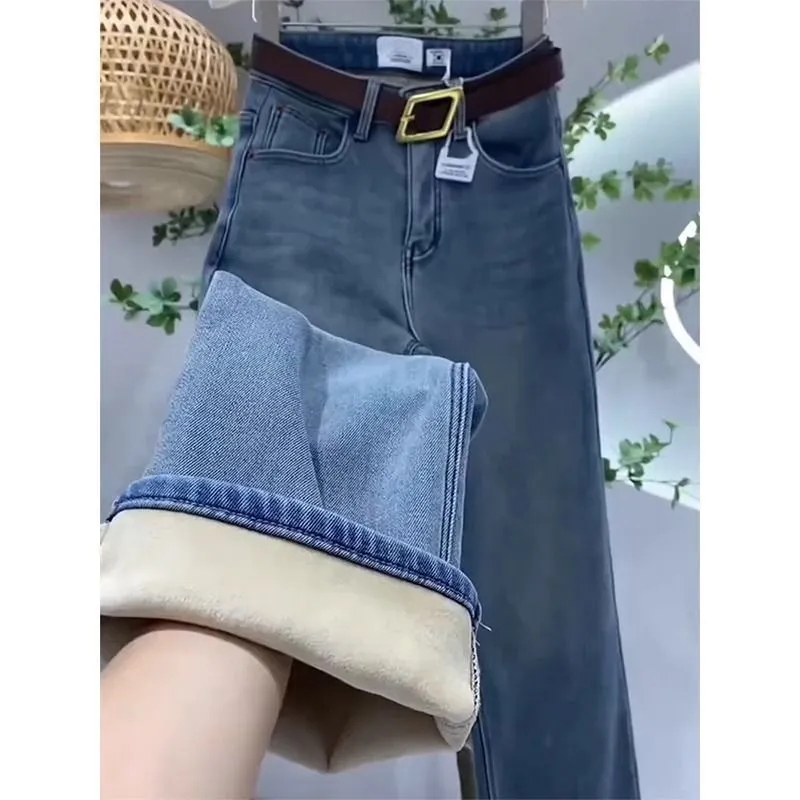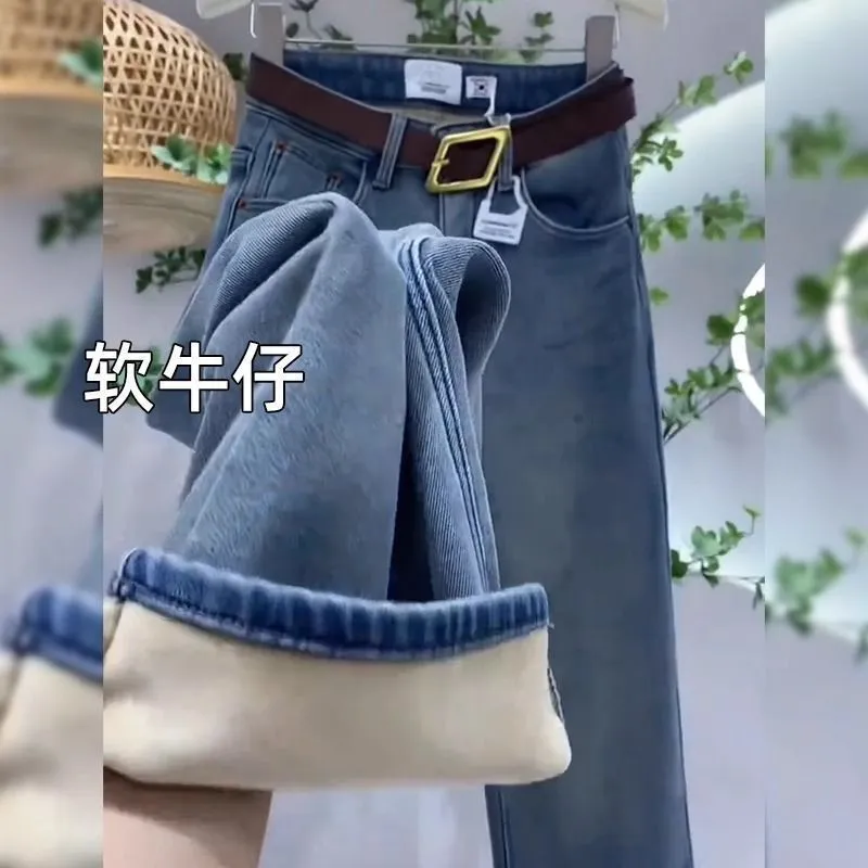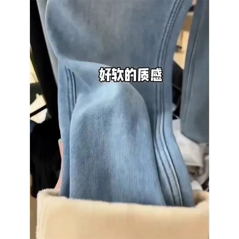 浅蓝加绒加厚牛仔裤女2025冬季新款胖mm梨形身材遮肉显瘦直筒长裤