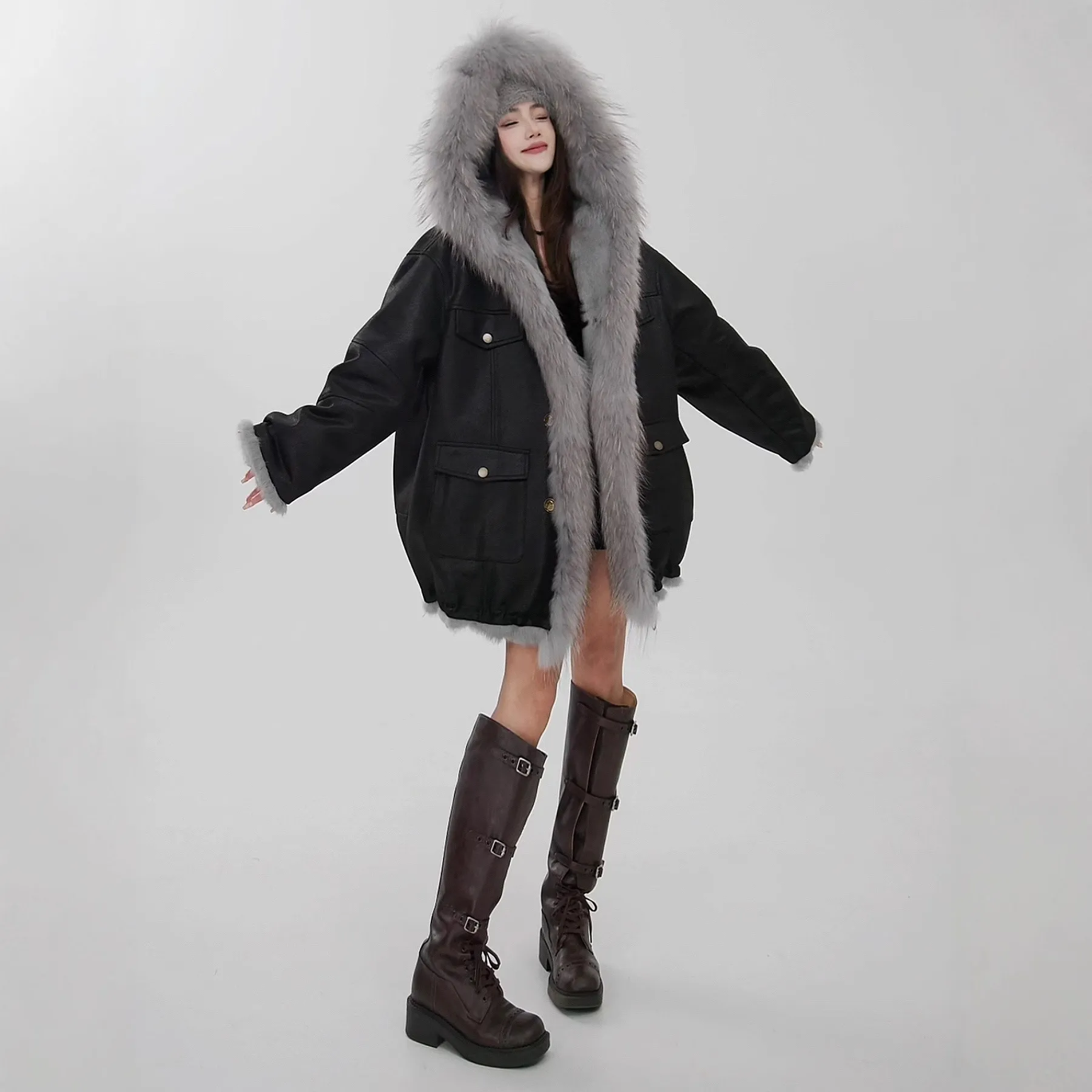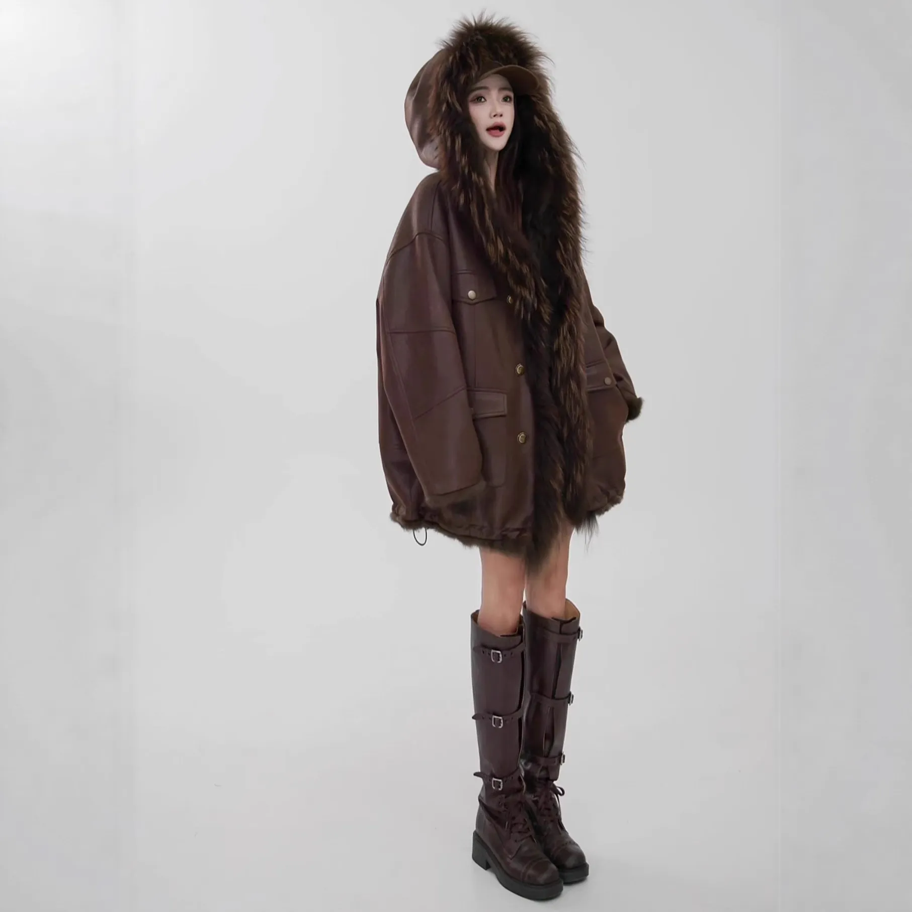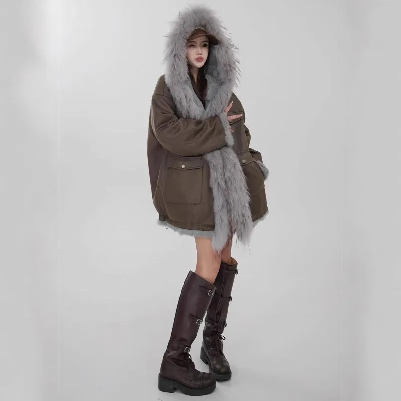 2025年冬季新款 貉子毛领兔毛两面穿皮草派克服 中长款女外套大衣